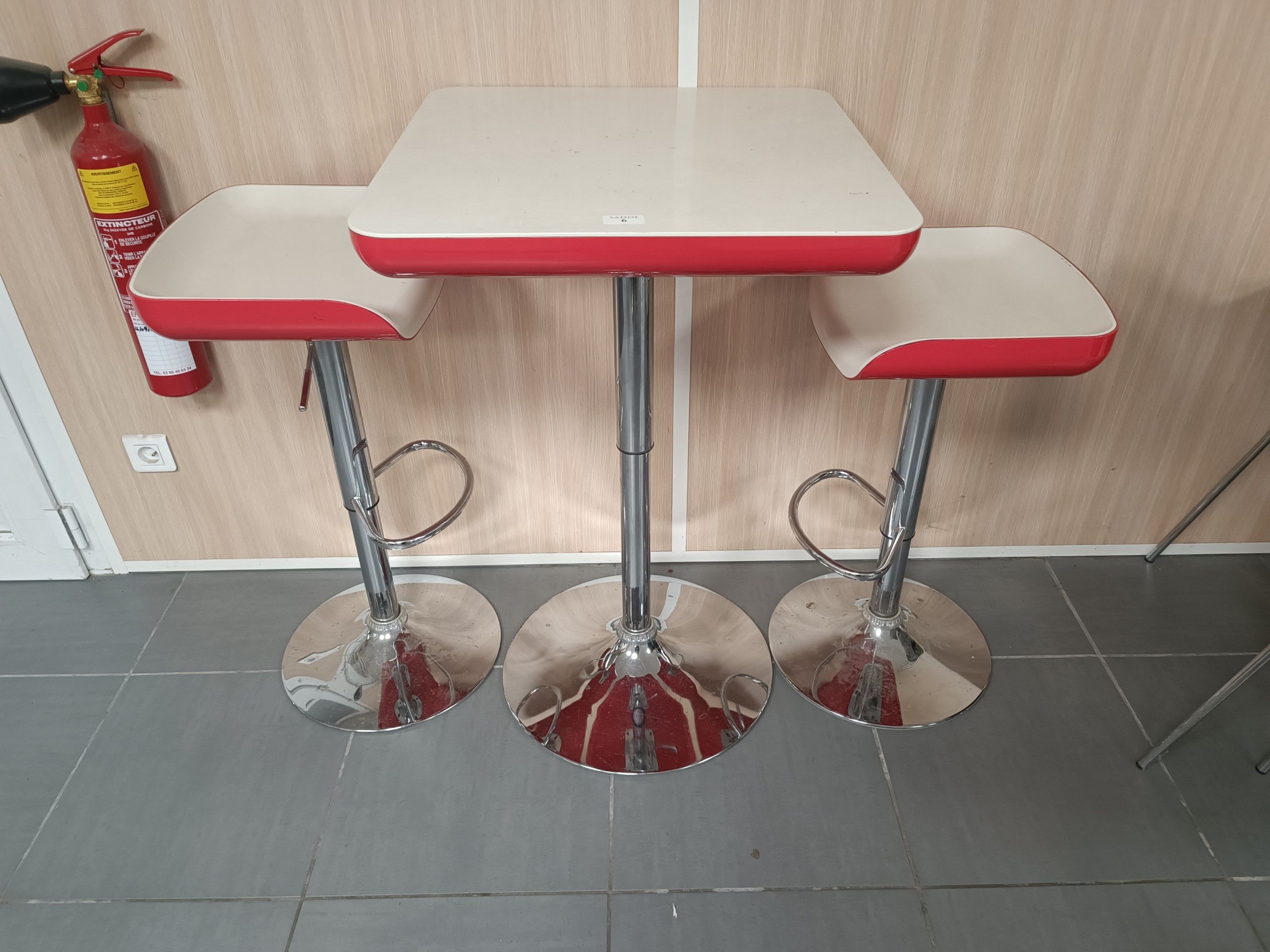 Stand-up table 95x60x60 with 2 metal-framed stools and red a…