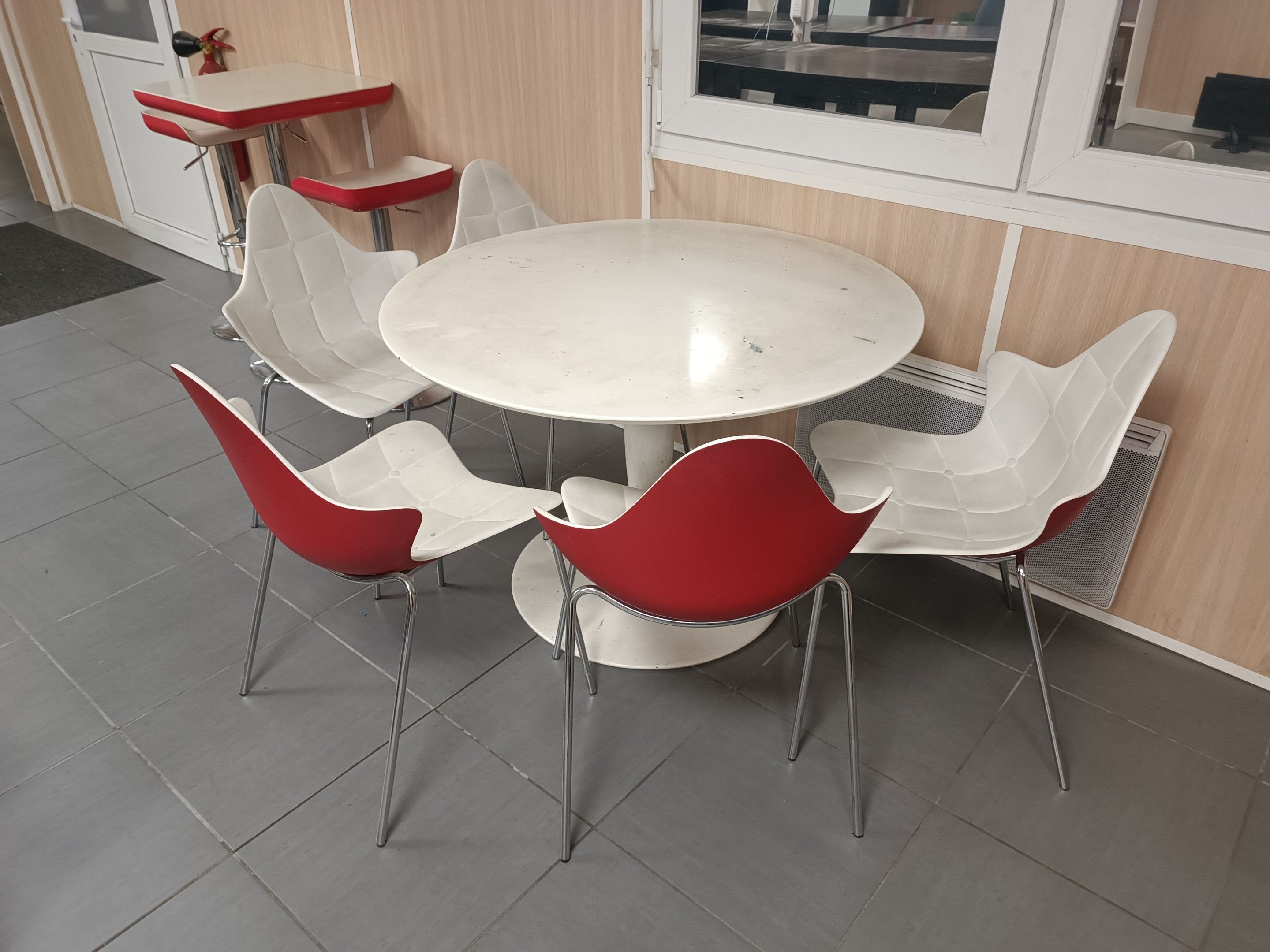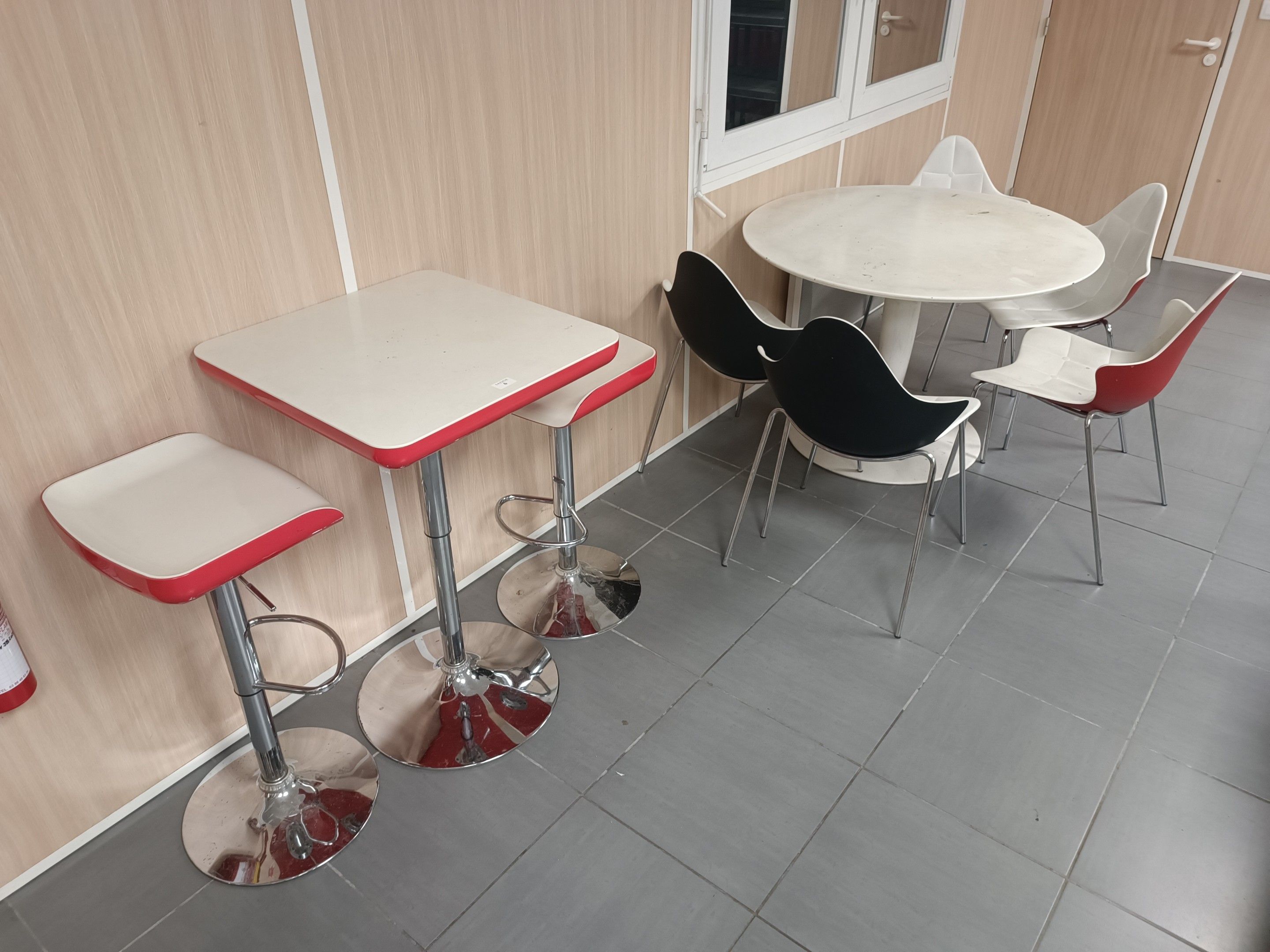 Stand-up table 95x60x60 with 2 metal-framed stools and red and white plastic seat / Round white plastic table 75x0110 with 5 metal-framed chairs and white plastic seat, 2 black backs and 3 red backs