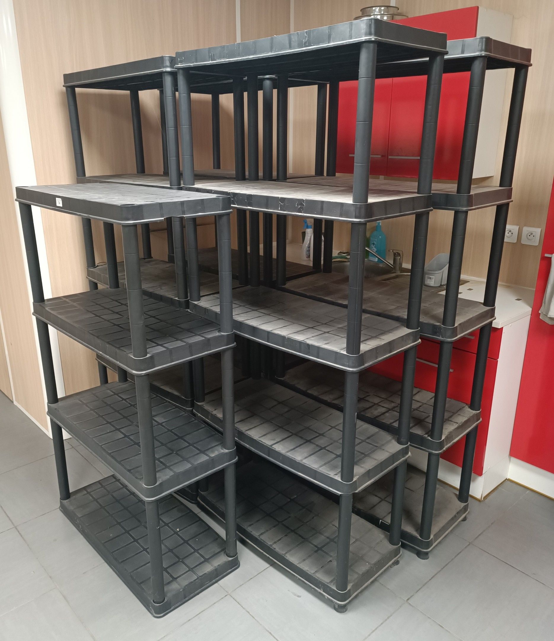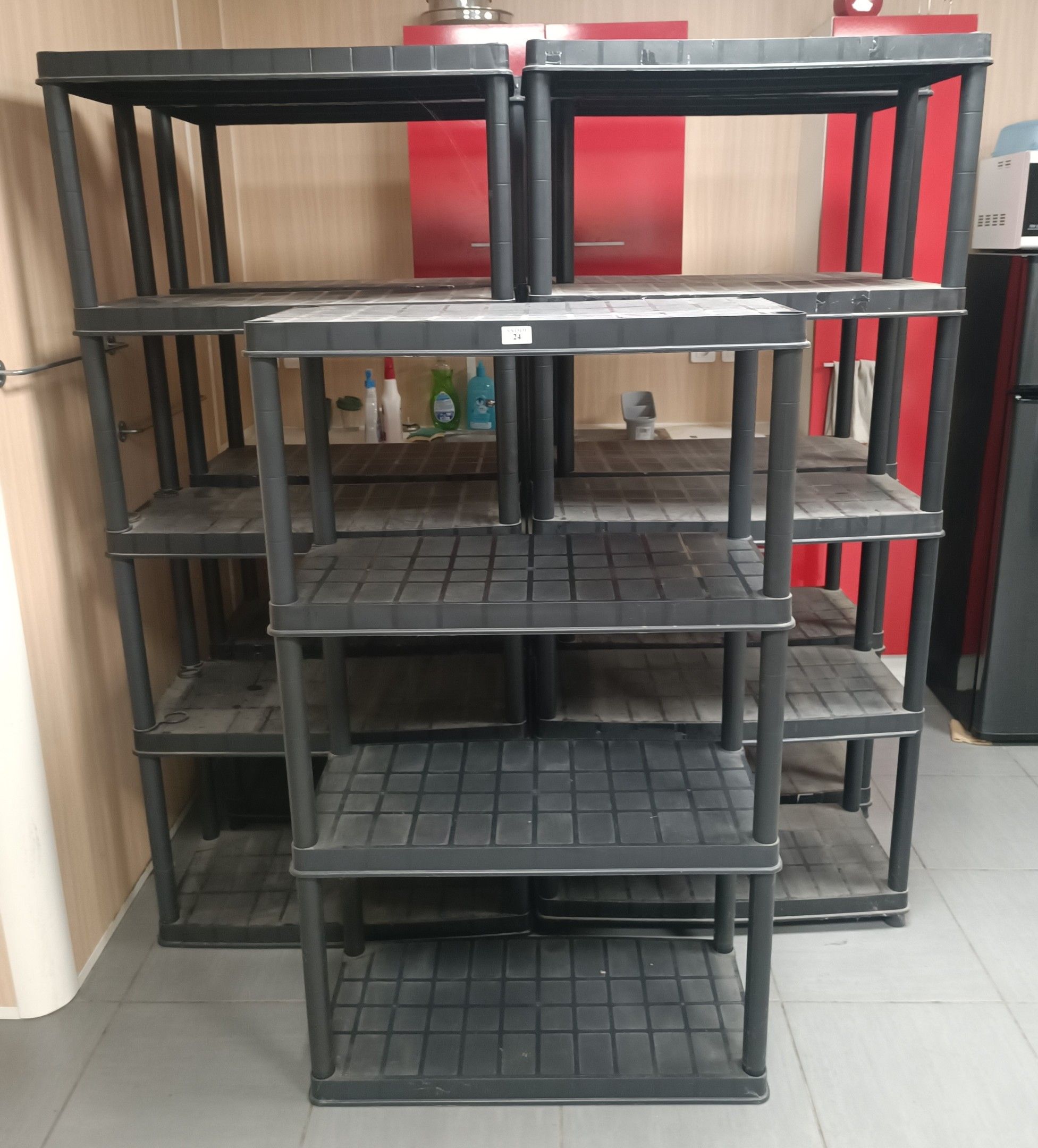 5 Black plastic shelves 4X 185x85x39 and 1X 140x85x39