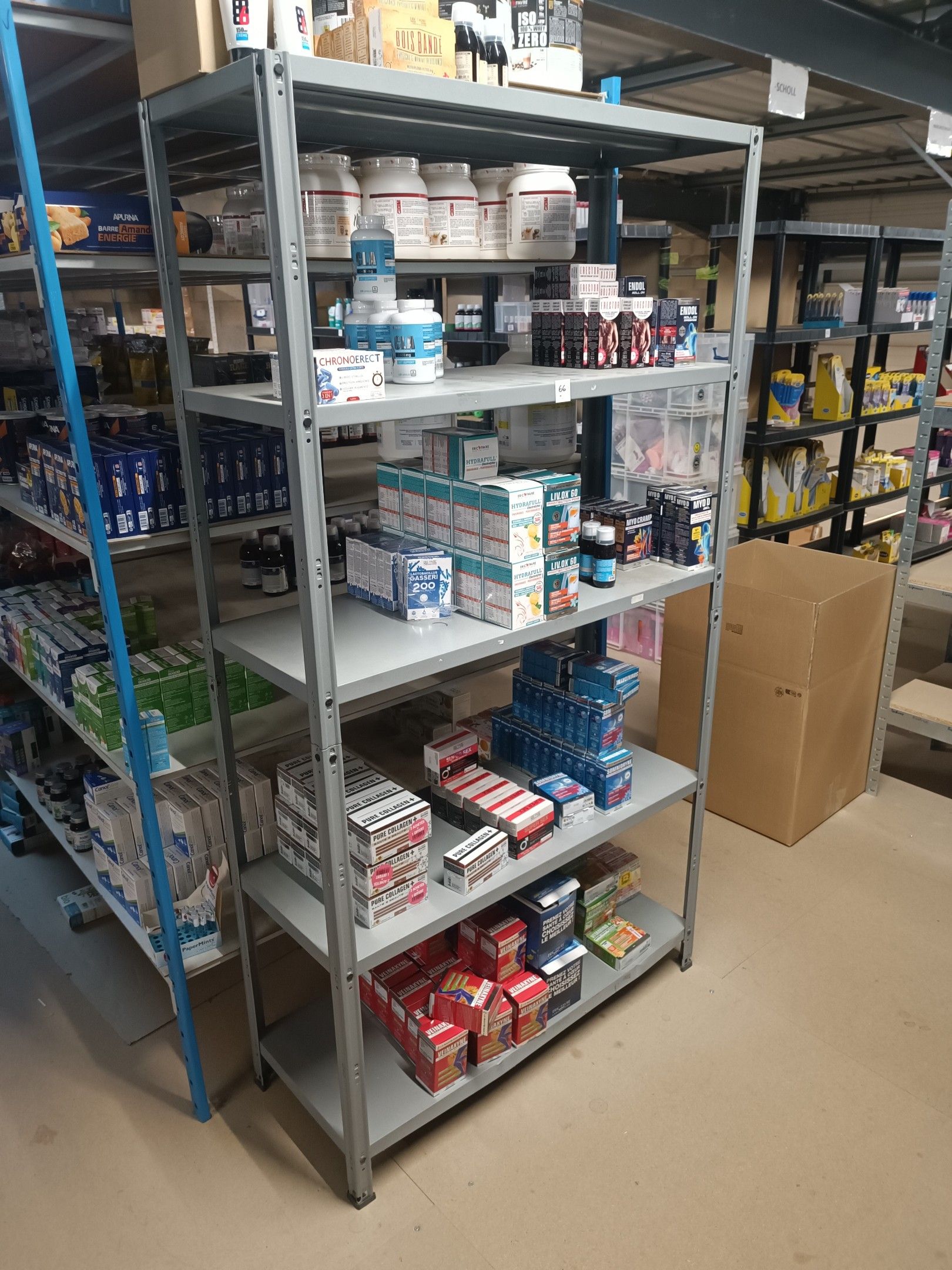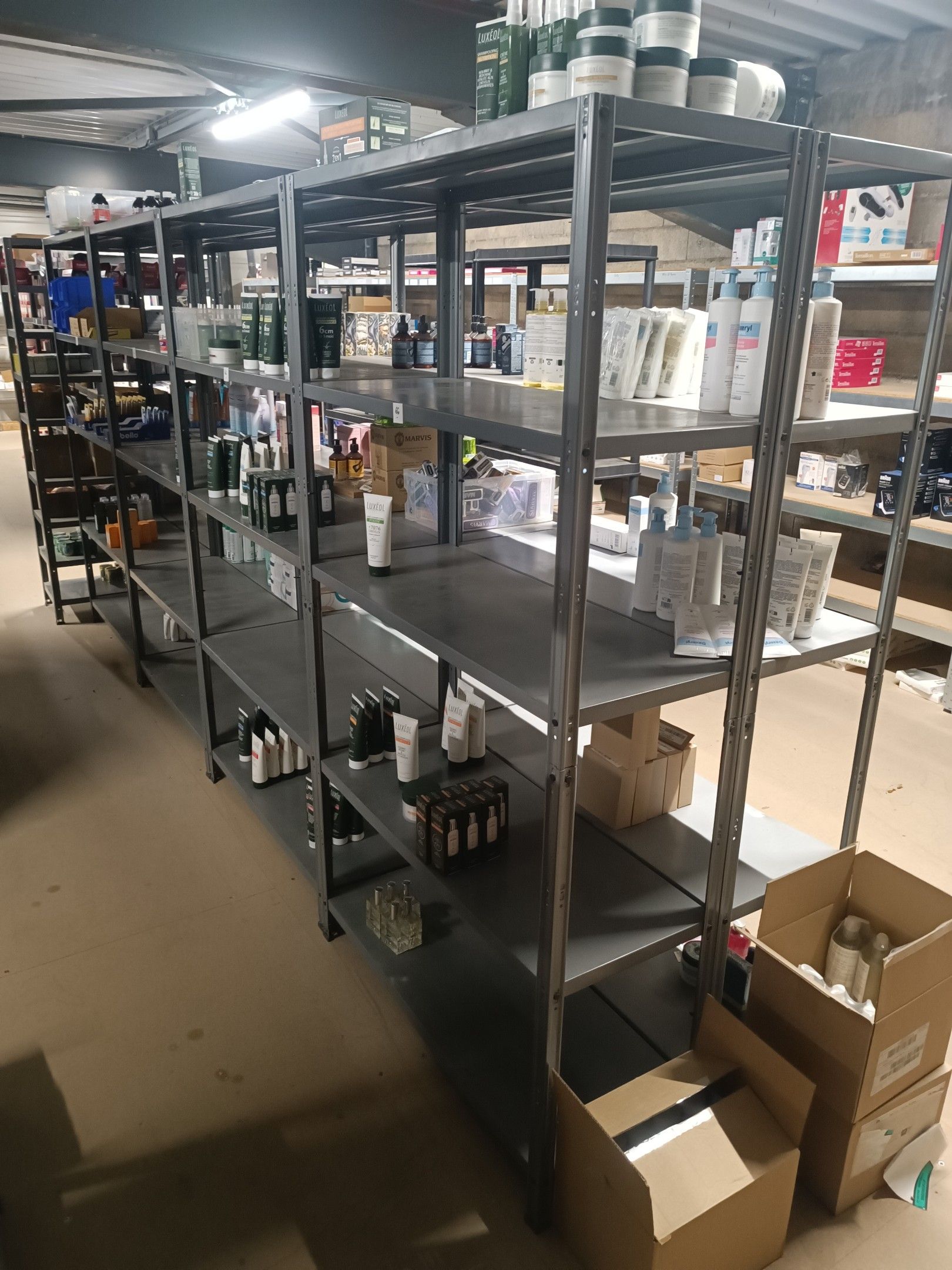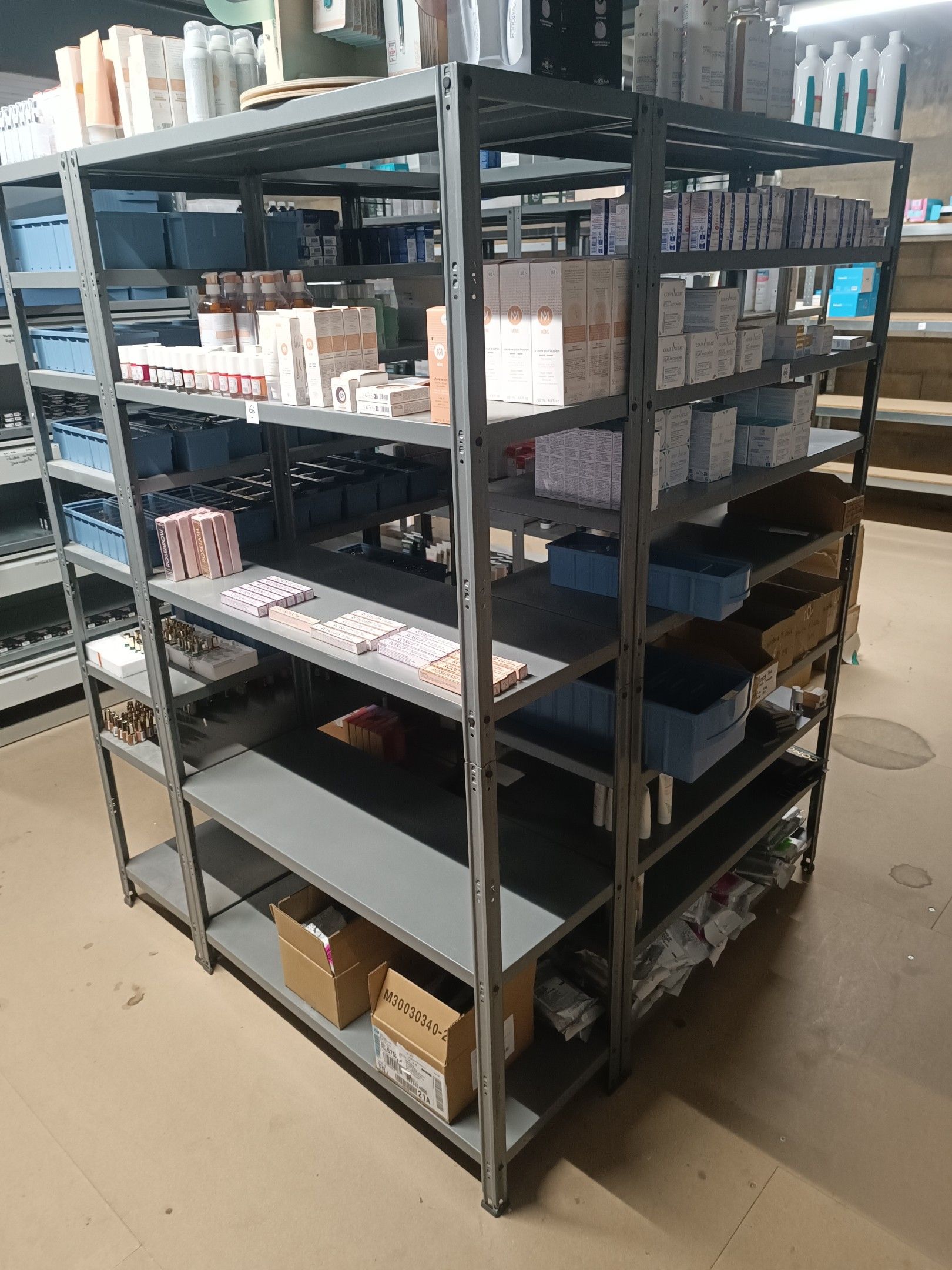 First floor. 14 grey metal shelves 186x100x40 and shelf with 4 drawers 200x128x50