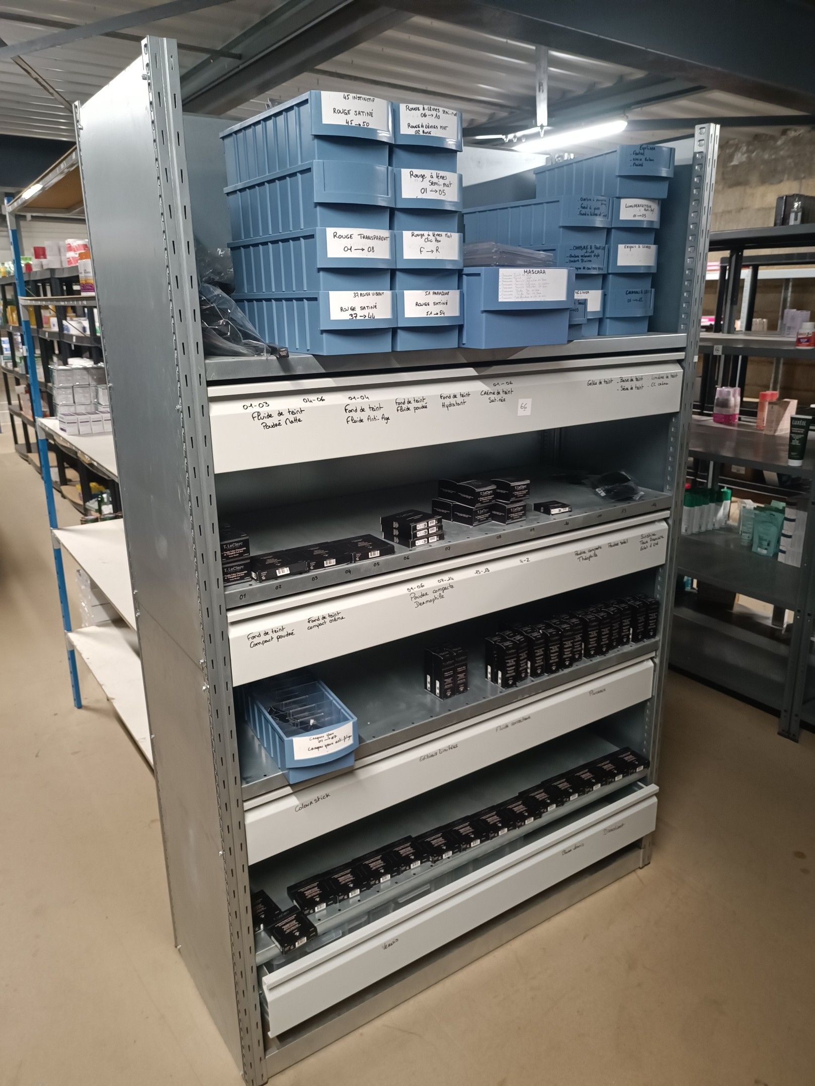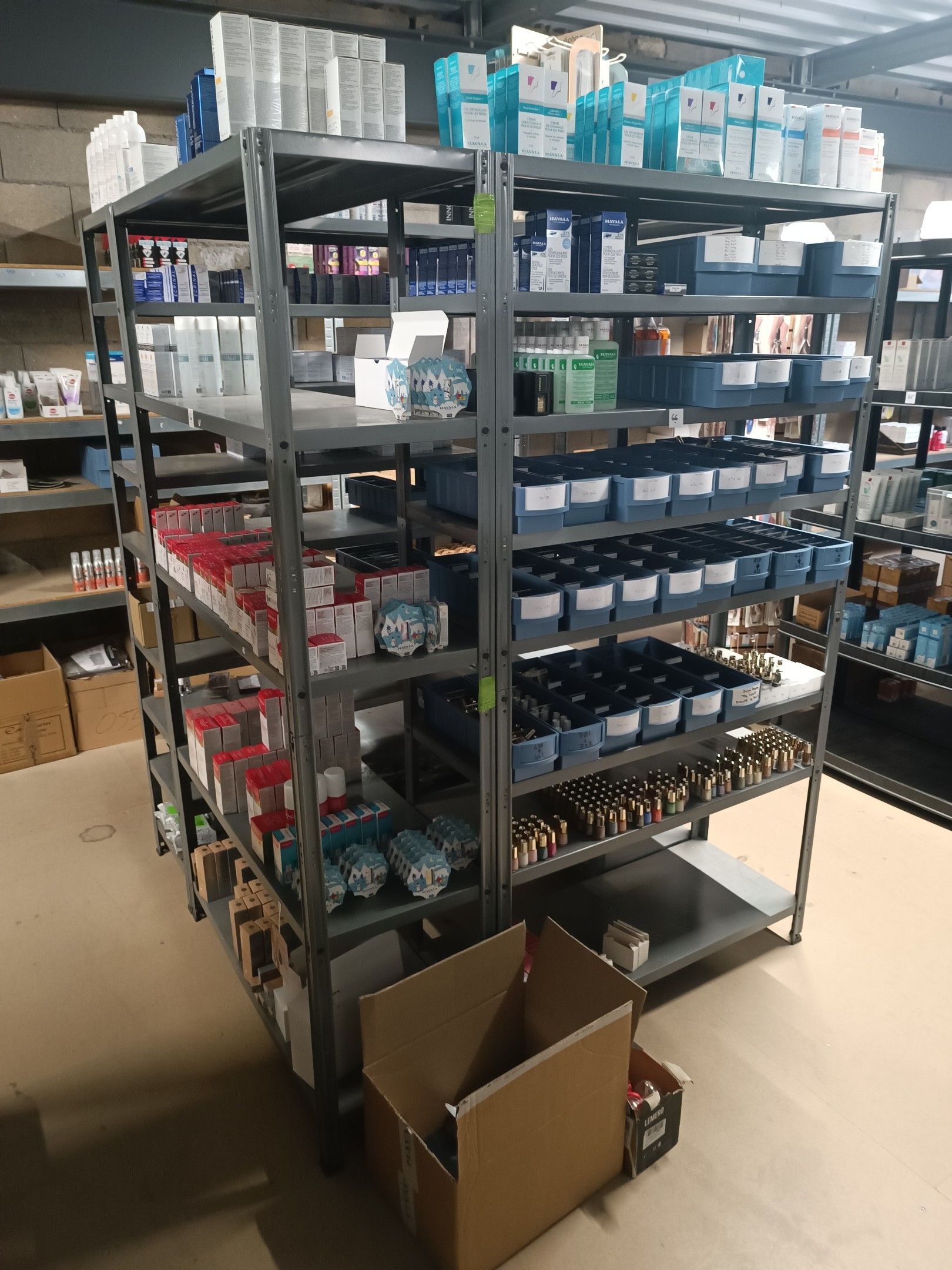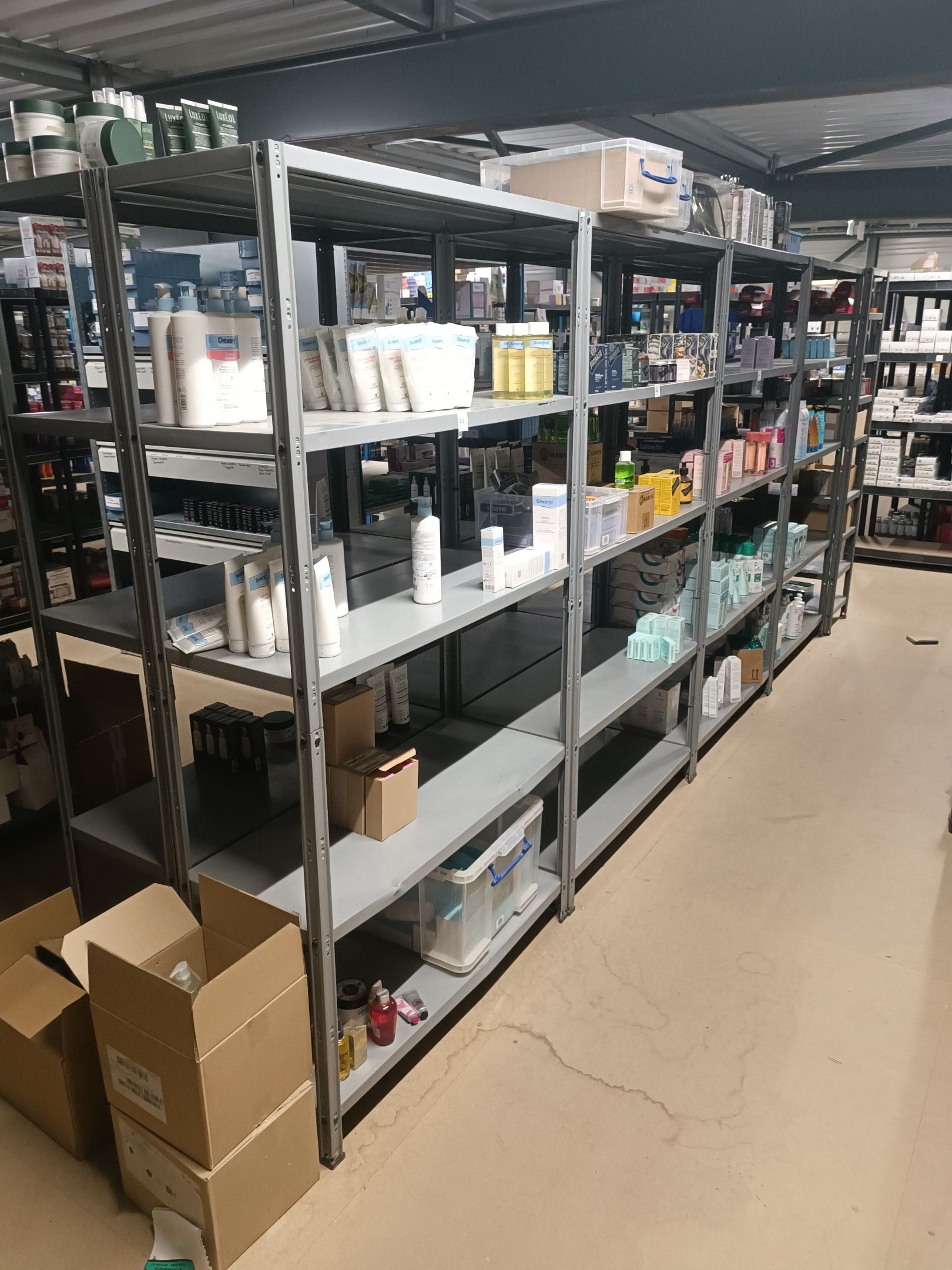 First floor. 14 grey metal shelves 186x100x40 and shelf with 4 drawers 200x128x50