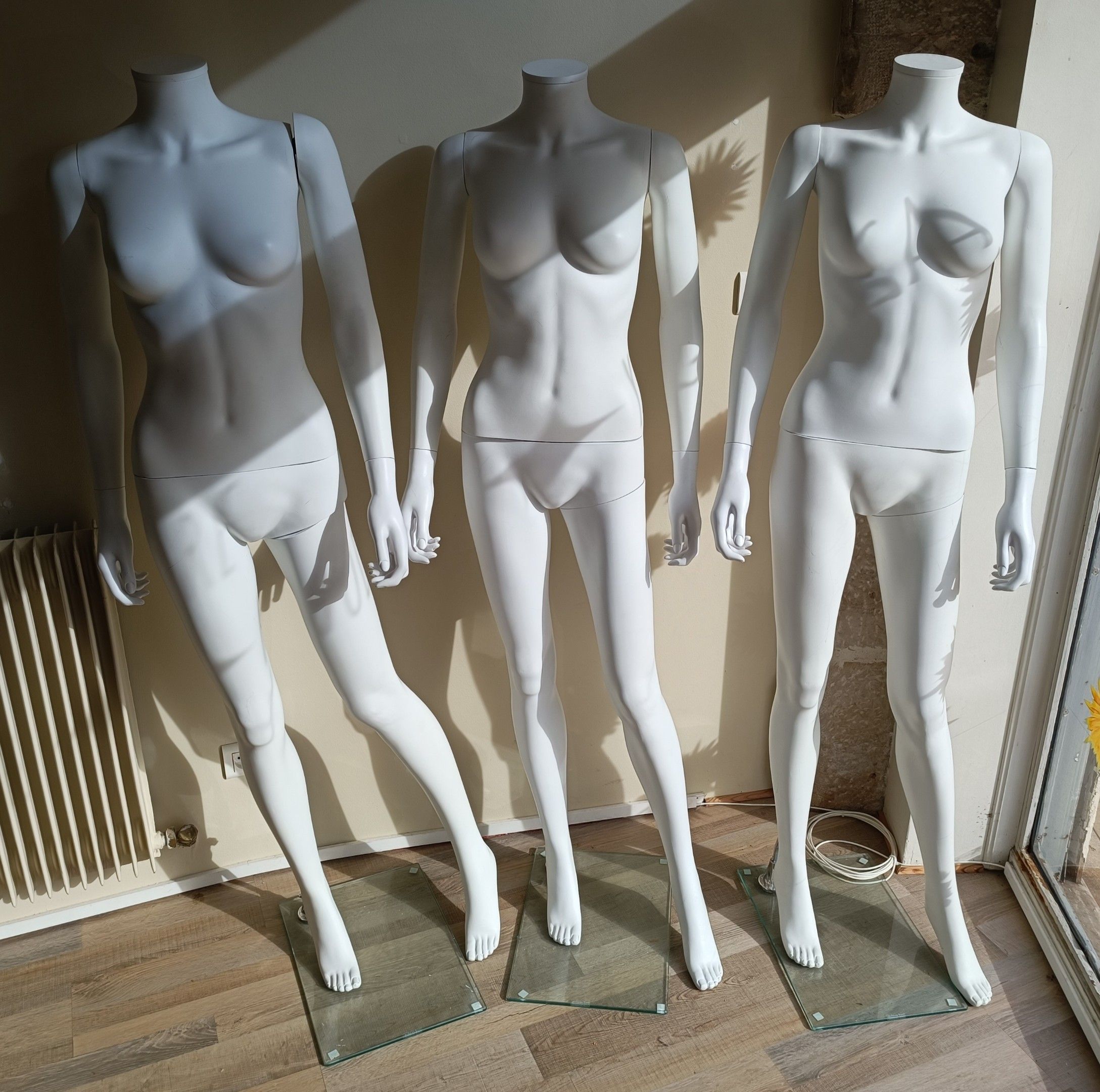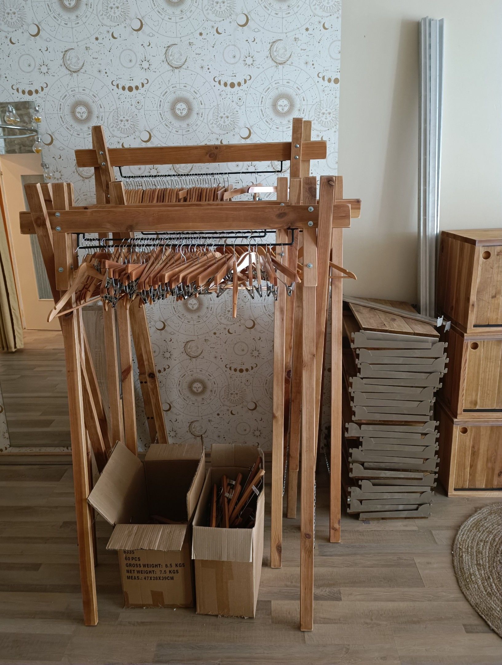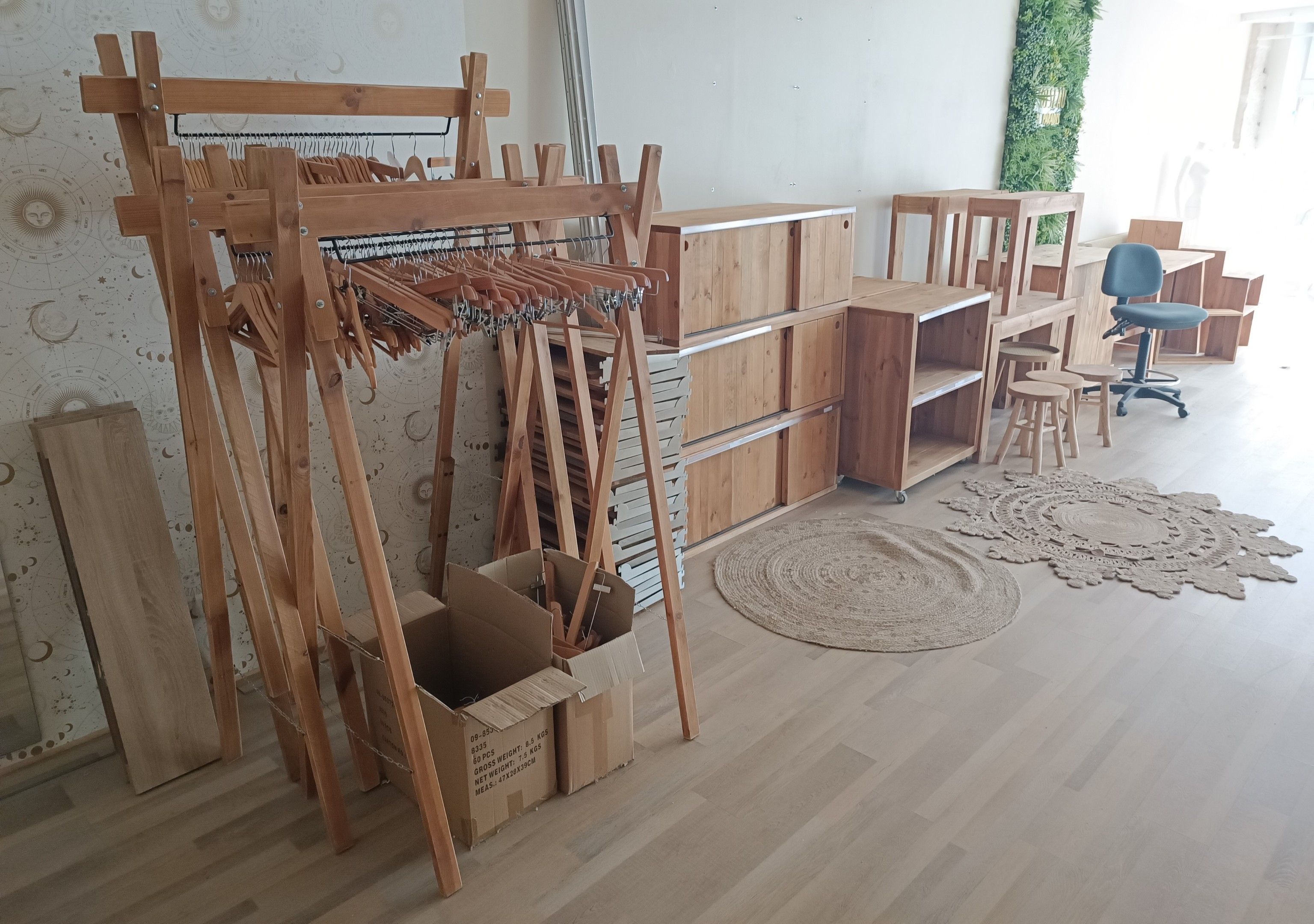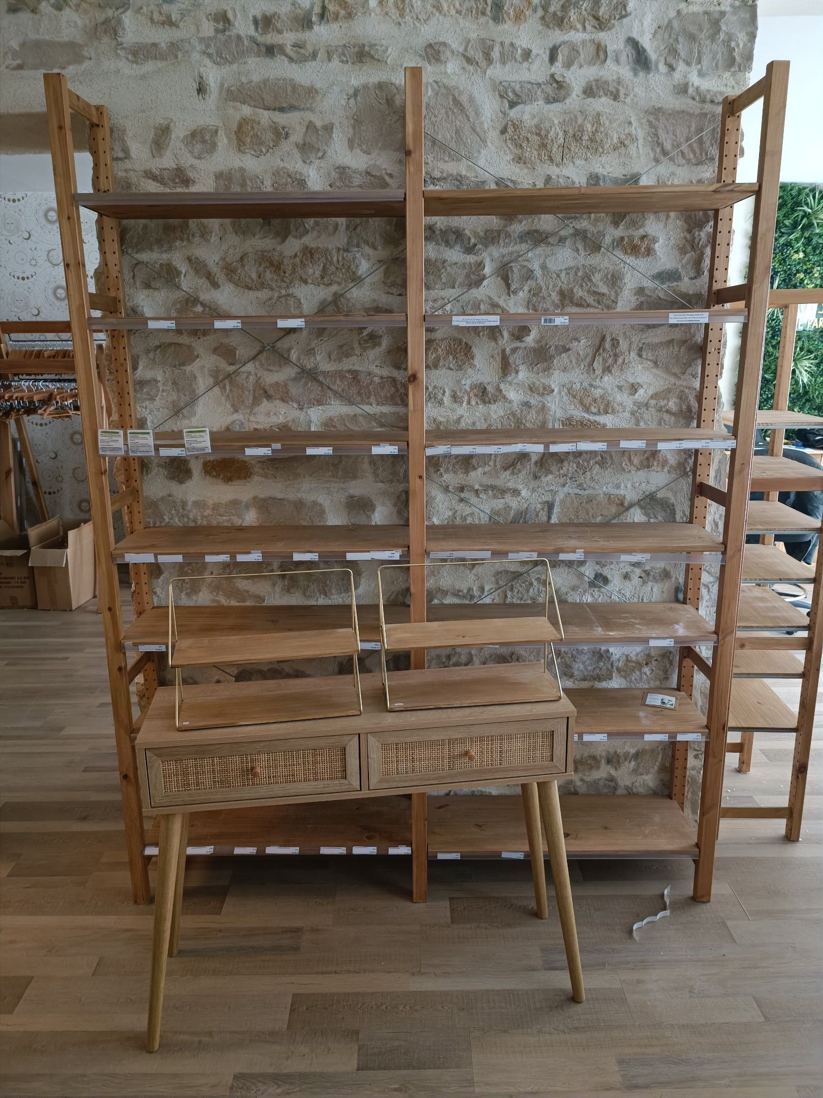 Wooden shop fittings: Counter: 90x118x59 - Table: 78x119x70 - 2 Tables: 75x119x39 - 2 Tables: 60x79x29 - 3 Sideboards with 3 sliding doors: 46x119x45 - 2 Base units on castors: 92x79x39 - 2 Display columns: 100x39x39 and 80x32x32 - 2 Shelves: 227x175x30 and 179x49x30 - Reel: 86x0133 - Shelving on racks: aluminium bars: 6 single and 3 double h=240 and 26 trays: 60x35 - 4 Clothes racks: 1X 192x120x62 and 3X 167x120x60 with set of hangers - Console with 2 drawers: 81x100x29 - 3 Stools - 3 Daisies - 3 Women's mannequins - 2 Rods and curtains - 2 Mats - Office chair