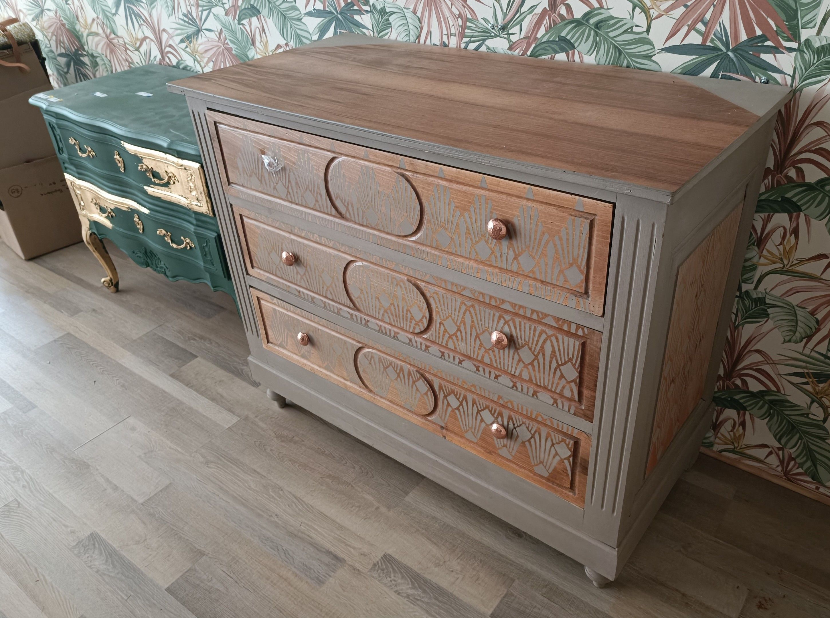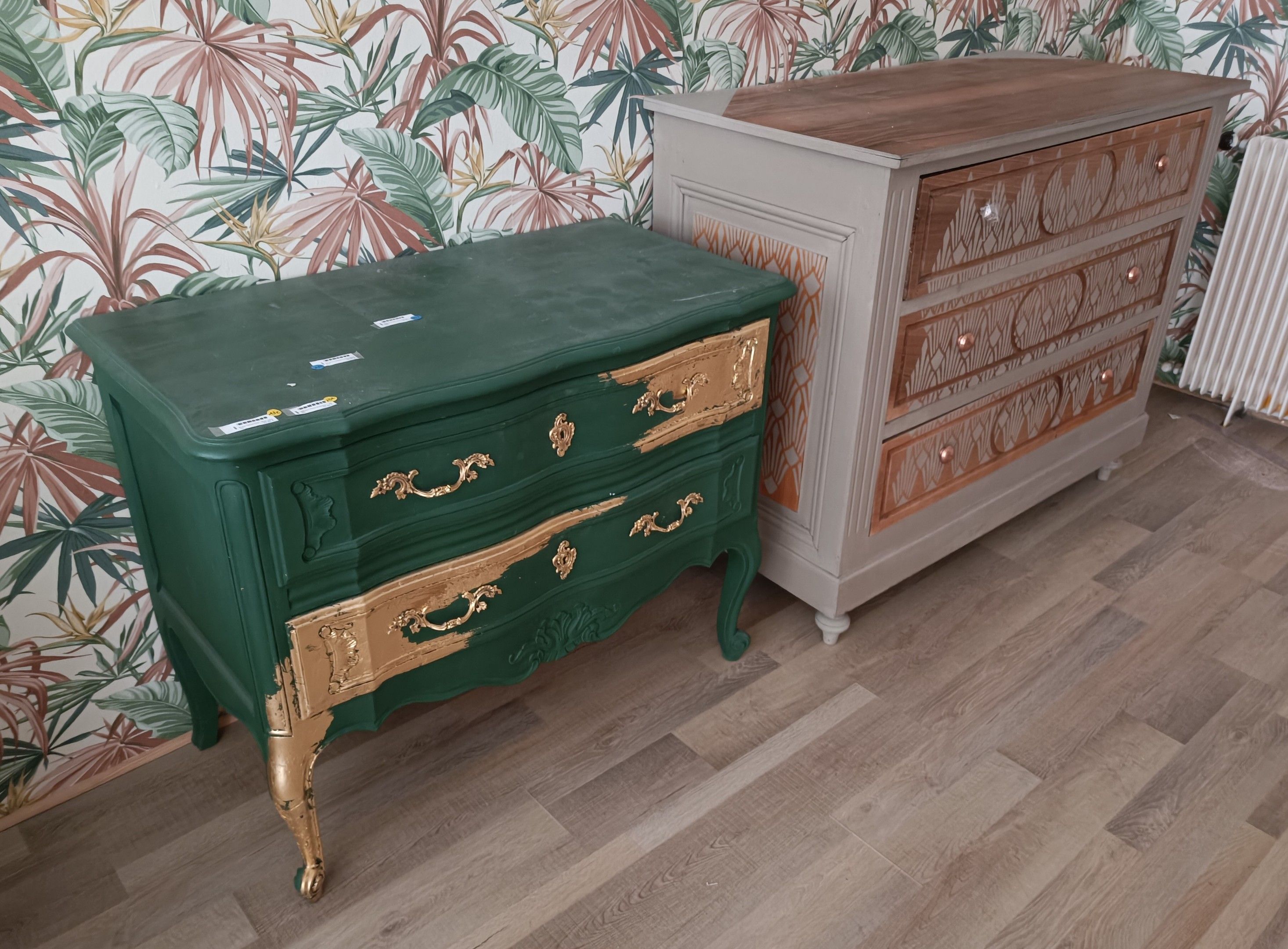 2 Chests of drawers: green and gold lacquered wood with 2 drawers: 76x95x49 and grey lacquered wood with 3 drawers: 95x116x58