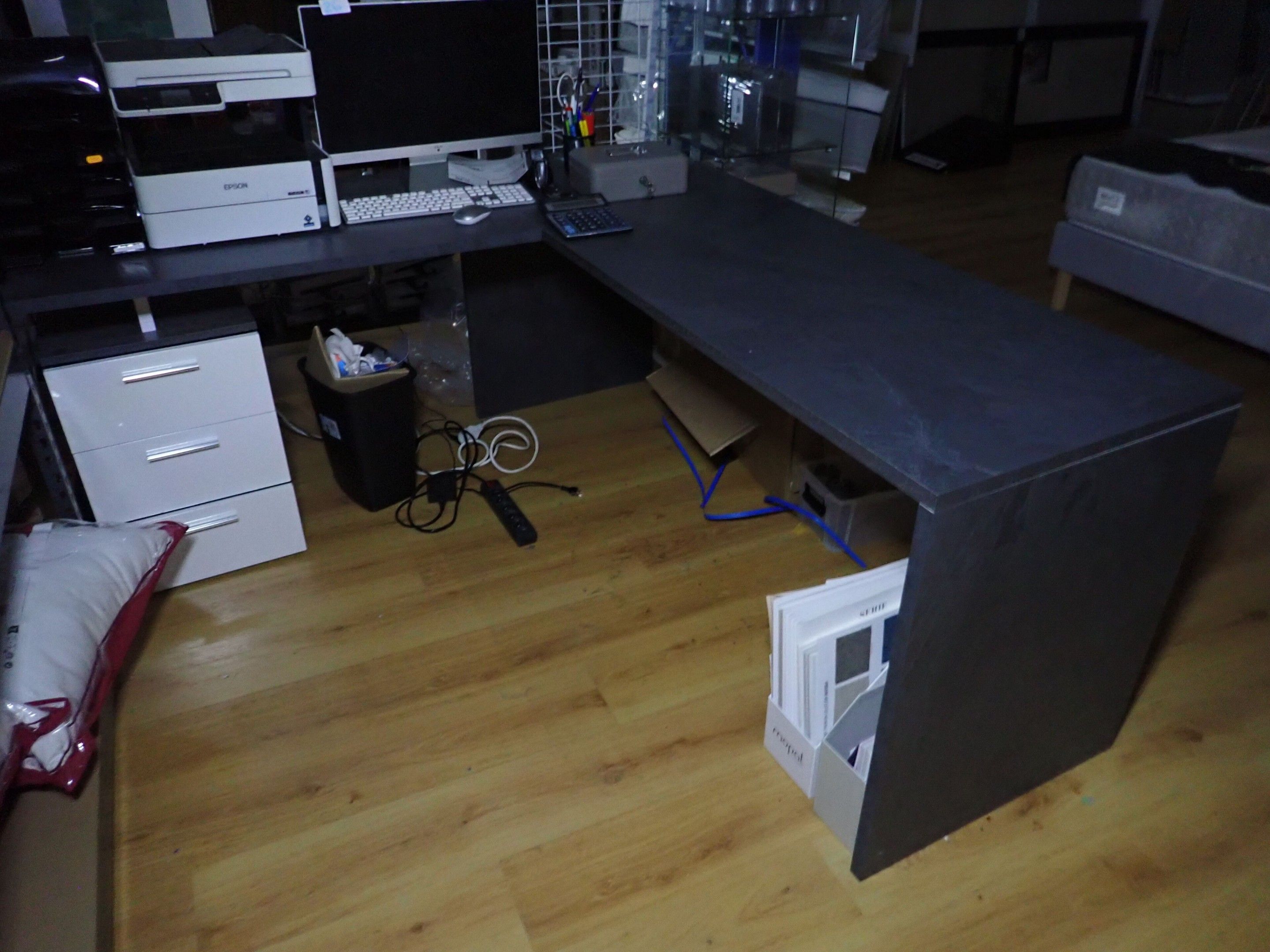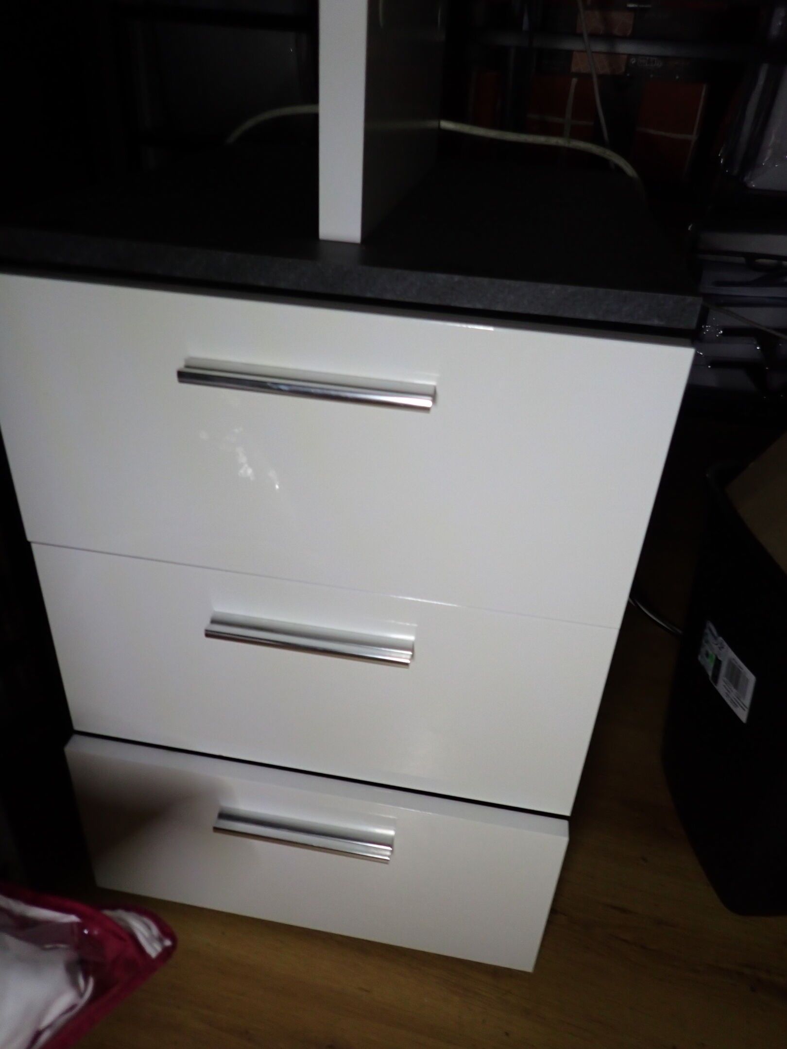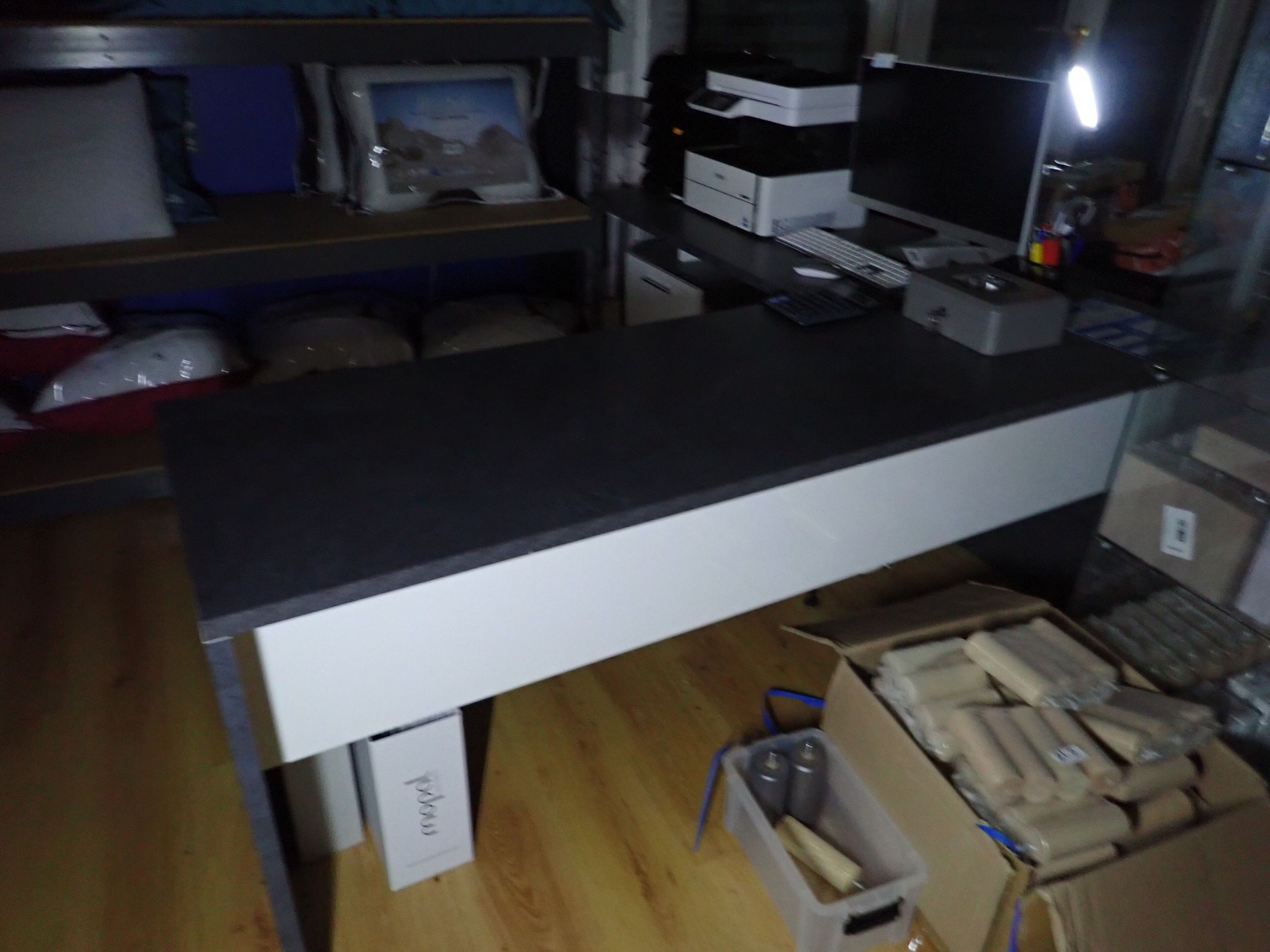 Corner desk with grey and white 3-drawer side pedestal 182x160, sold empty (without computer) judicial lot, Price 40