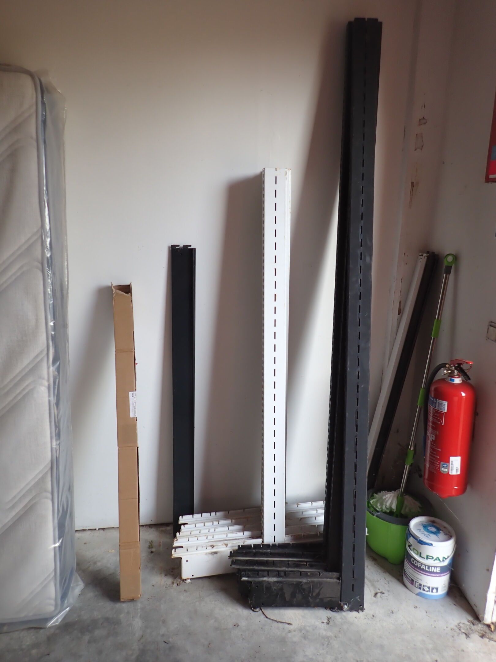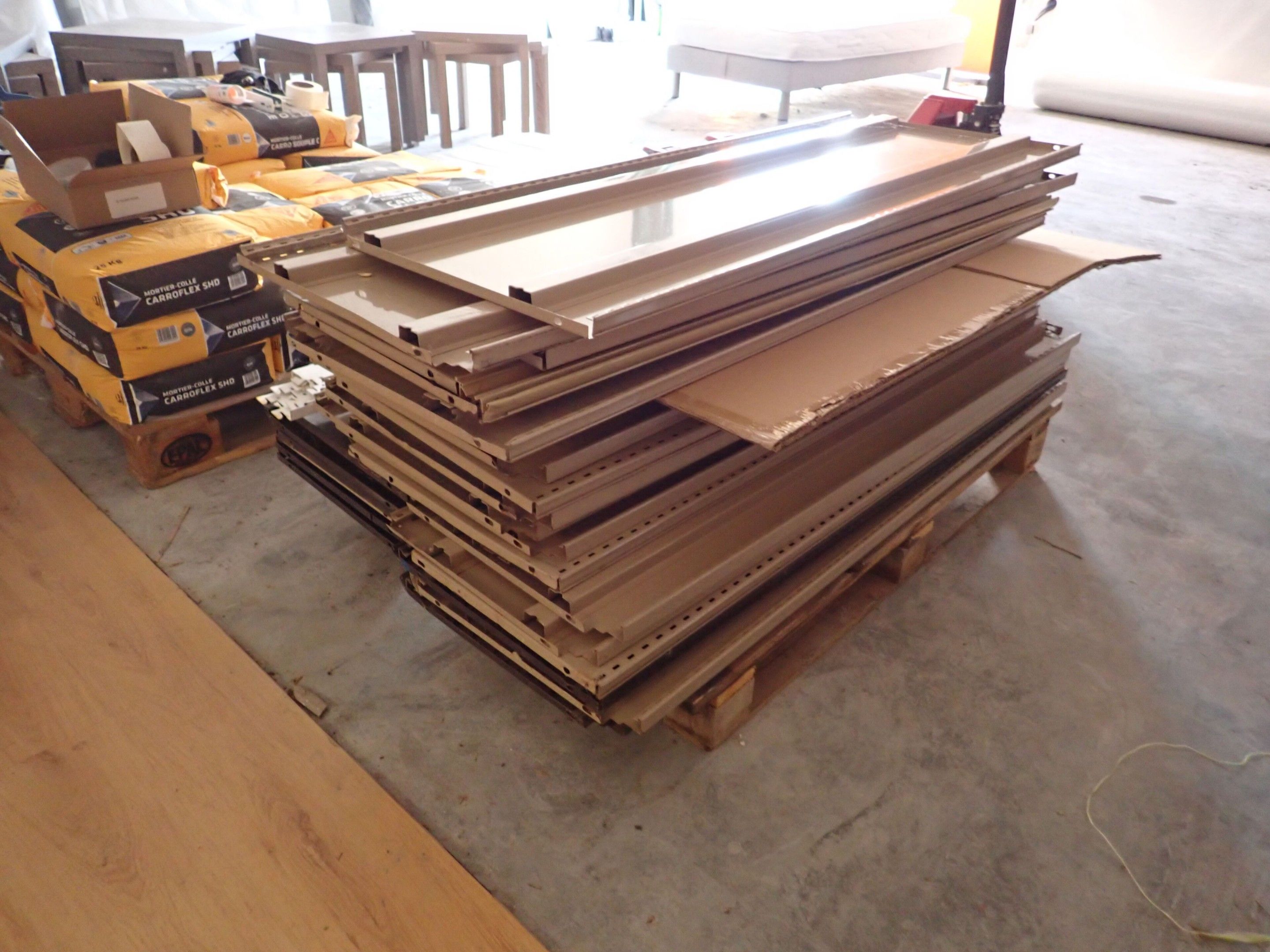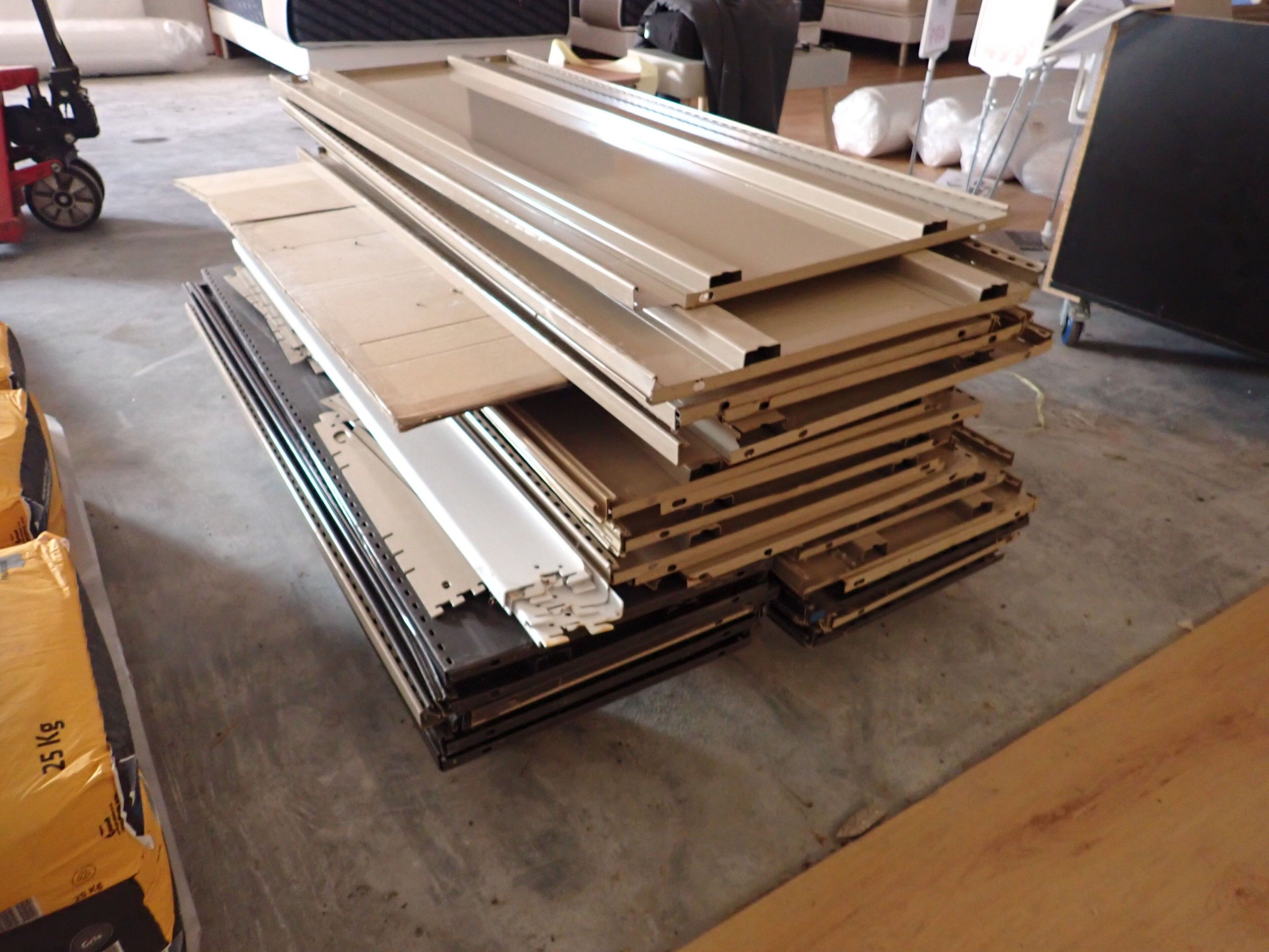1 section of gondola 6 levels 133x57xh220 modular with gondola elements including 5 double-sided white metal feet 40xh160 with 24 trays, sold empty, Judicial lot, Price 20