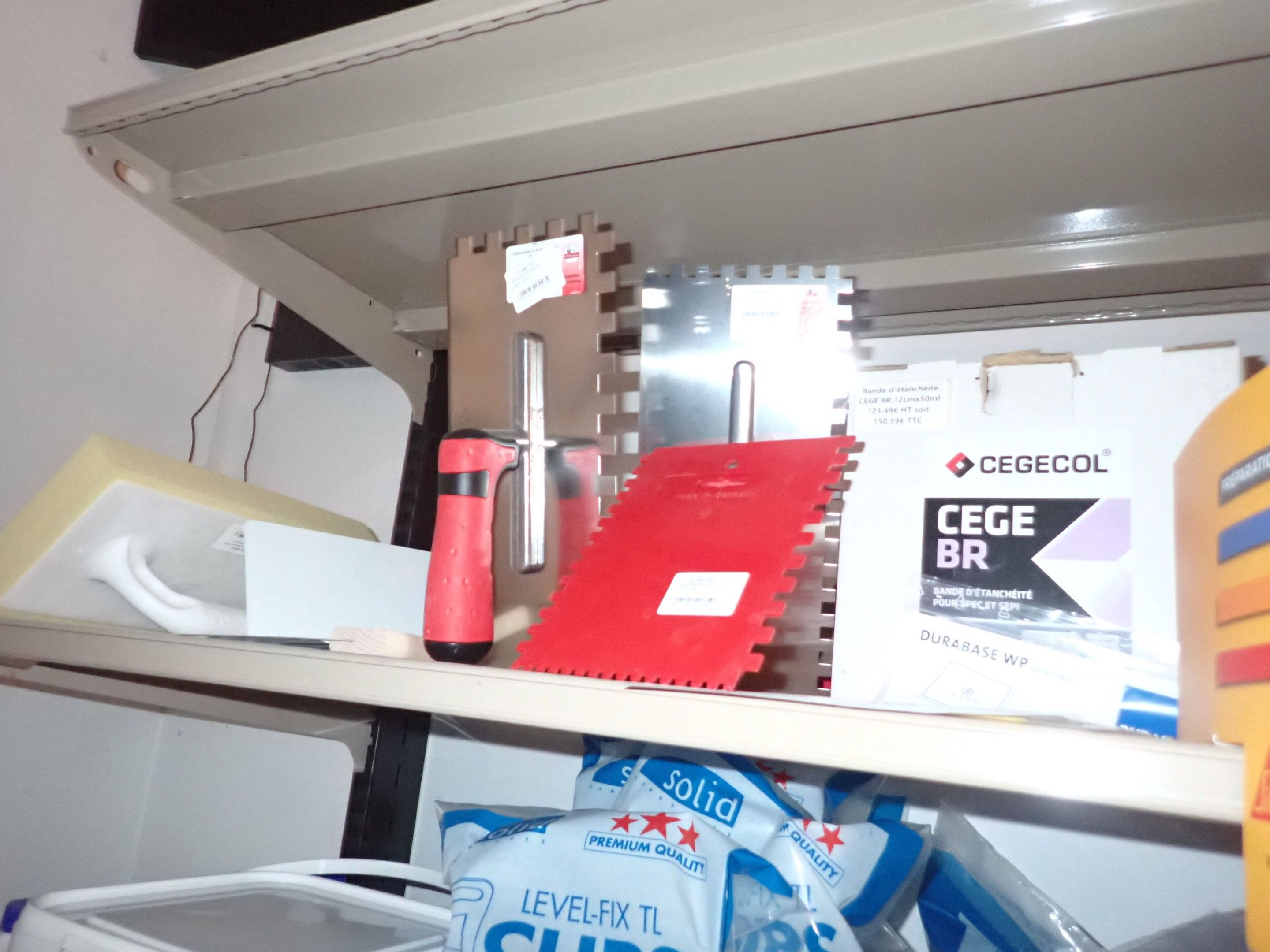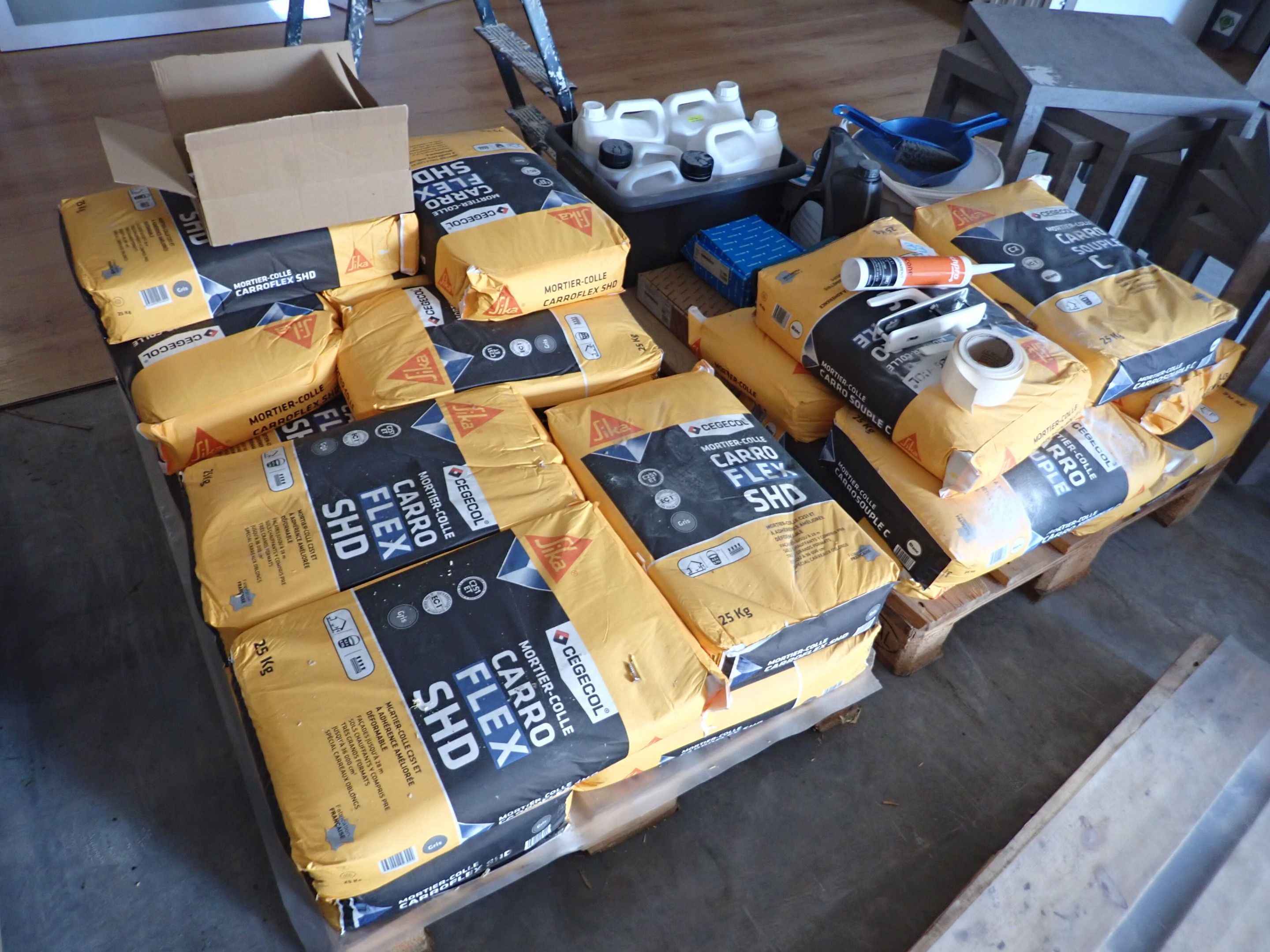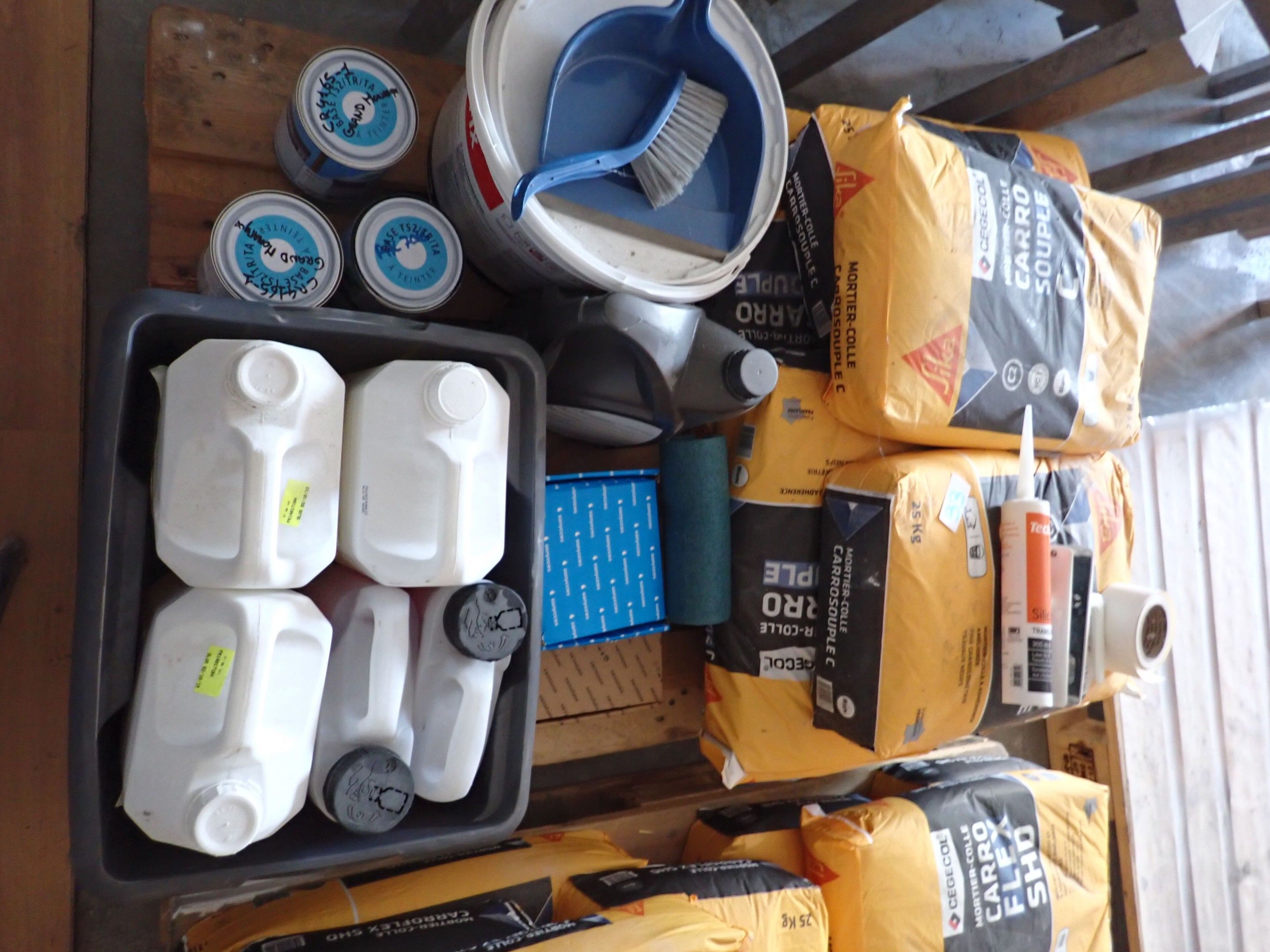 Batch 22 25 kg bags of CARRO flex xshd adhesive mortar, biden, paint, bags of level fix TL, self-levelling cross-bars, bags of Livel Fix TL, self-levelling cross-bars, bags of CEGECOL square joint mortar, HELLCRAU silicone cartridges, various small hand tools, Judicial Batch Price 60