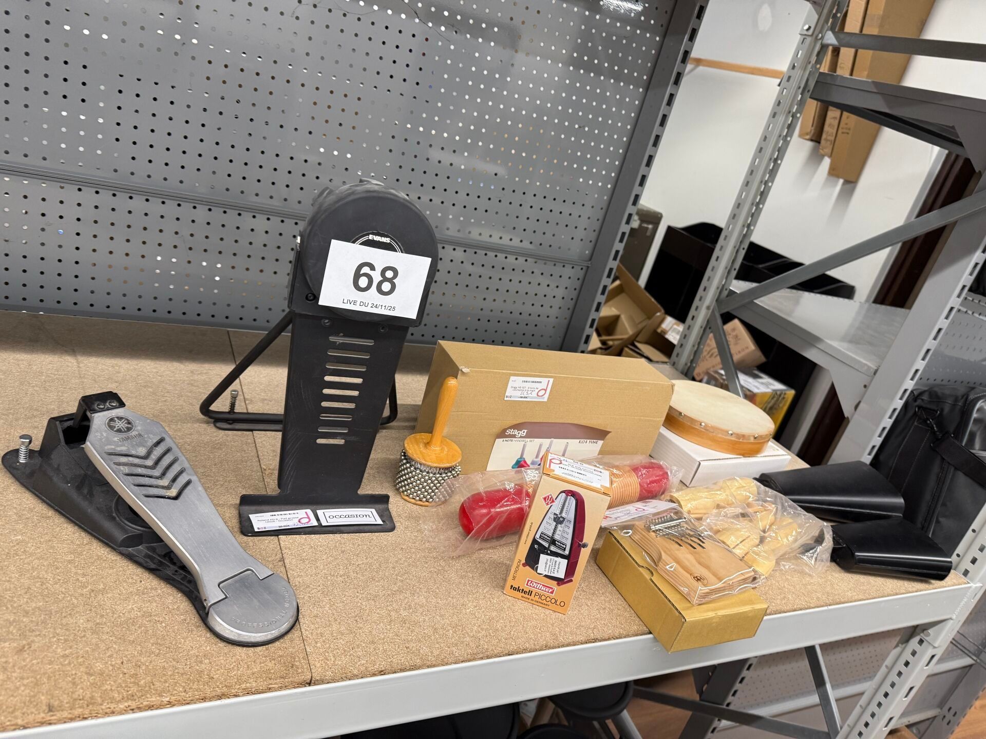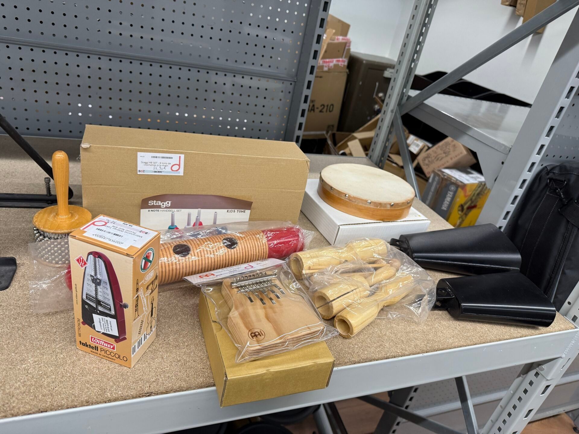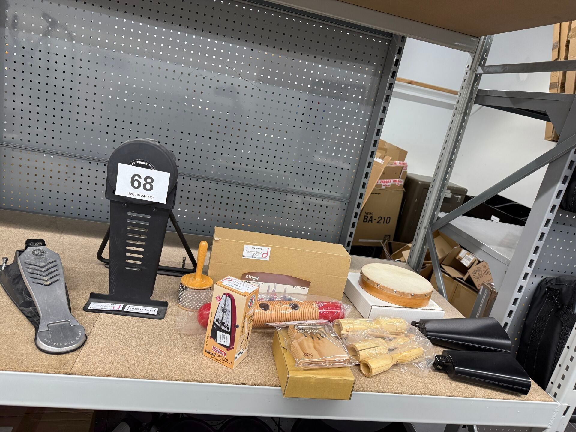 Set of small percussion instruments including bells, kalimba, tambourine, bells, electronic bass drum pad and electronic hi-hat pedal