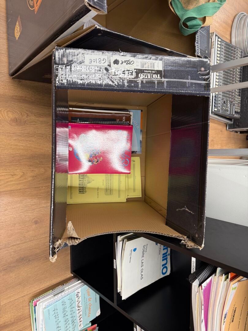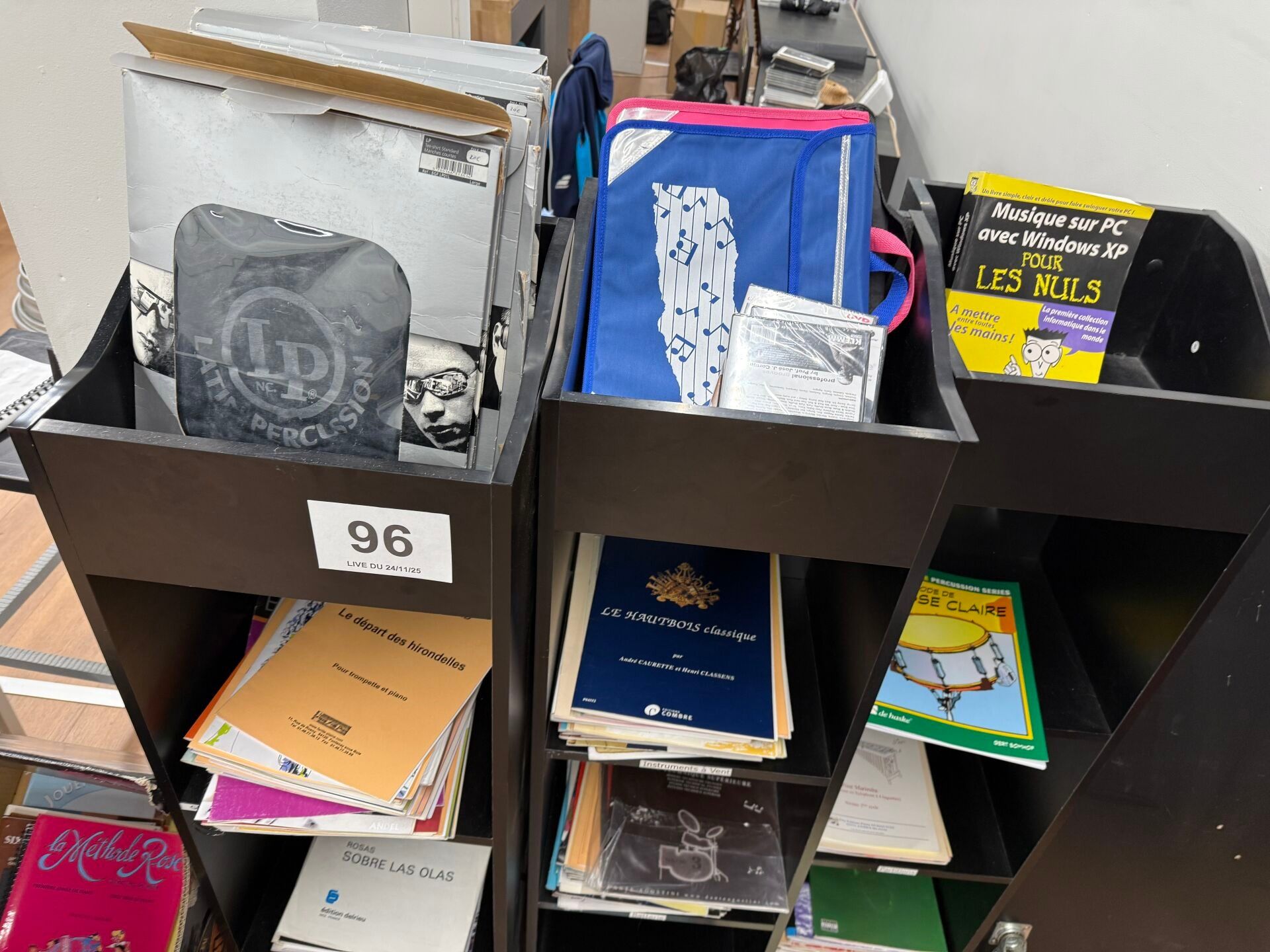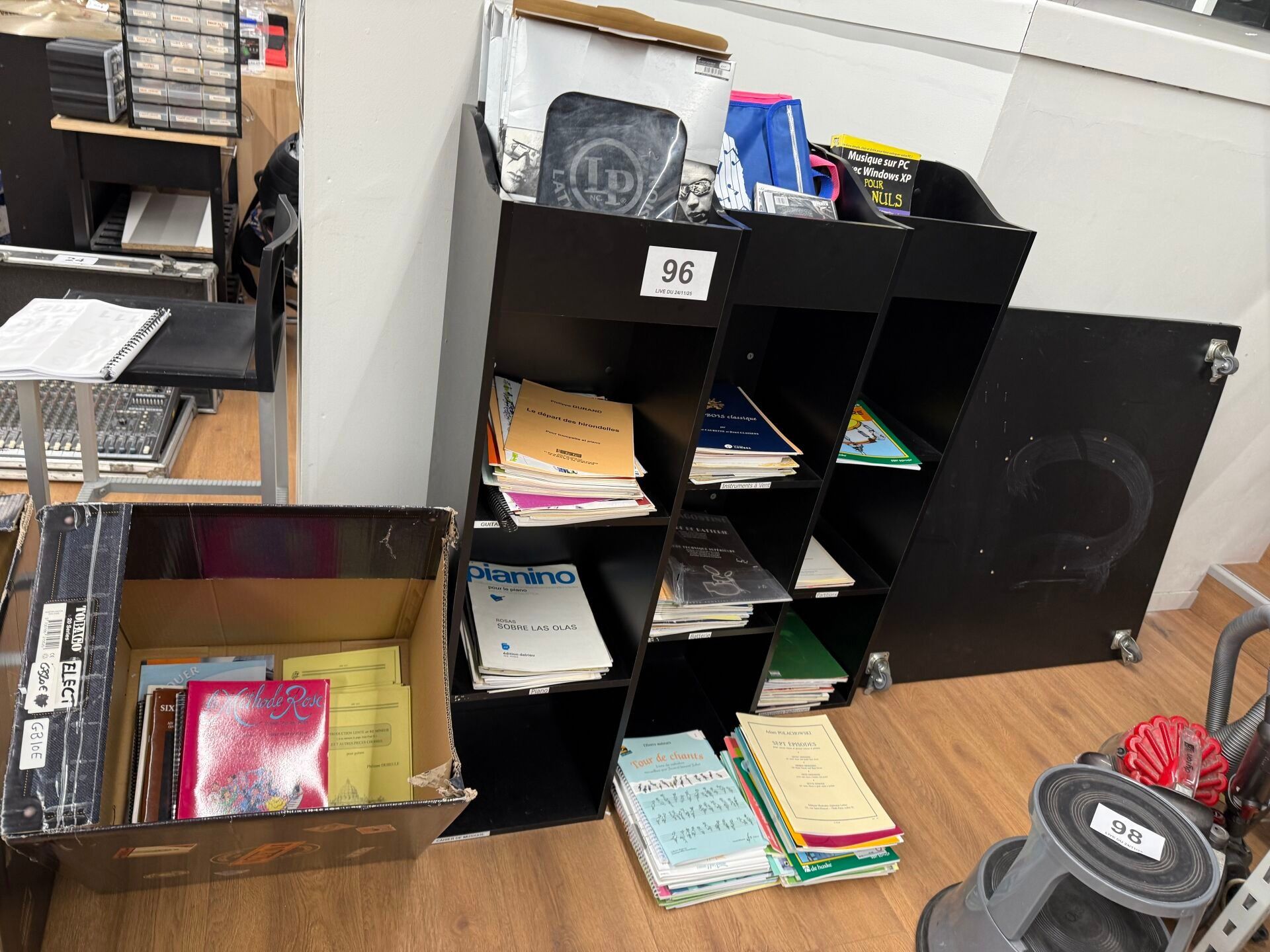 Set of 3 shelves and their contents of scores, methods and t-shirts