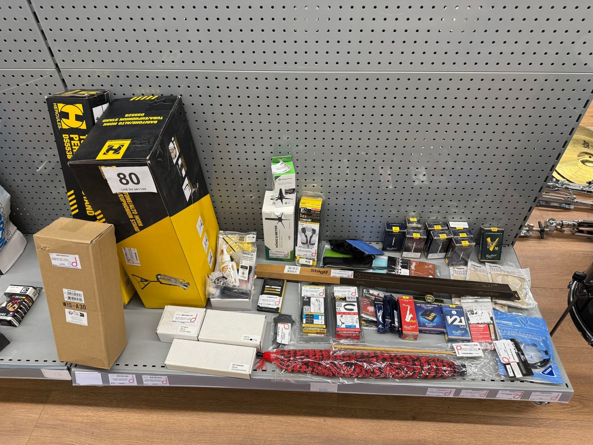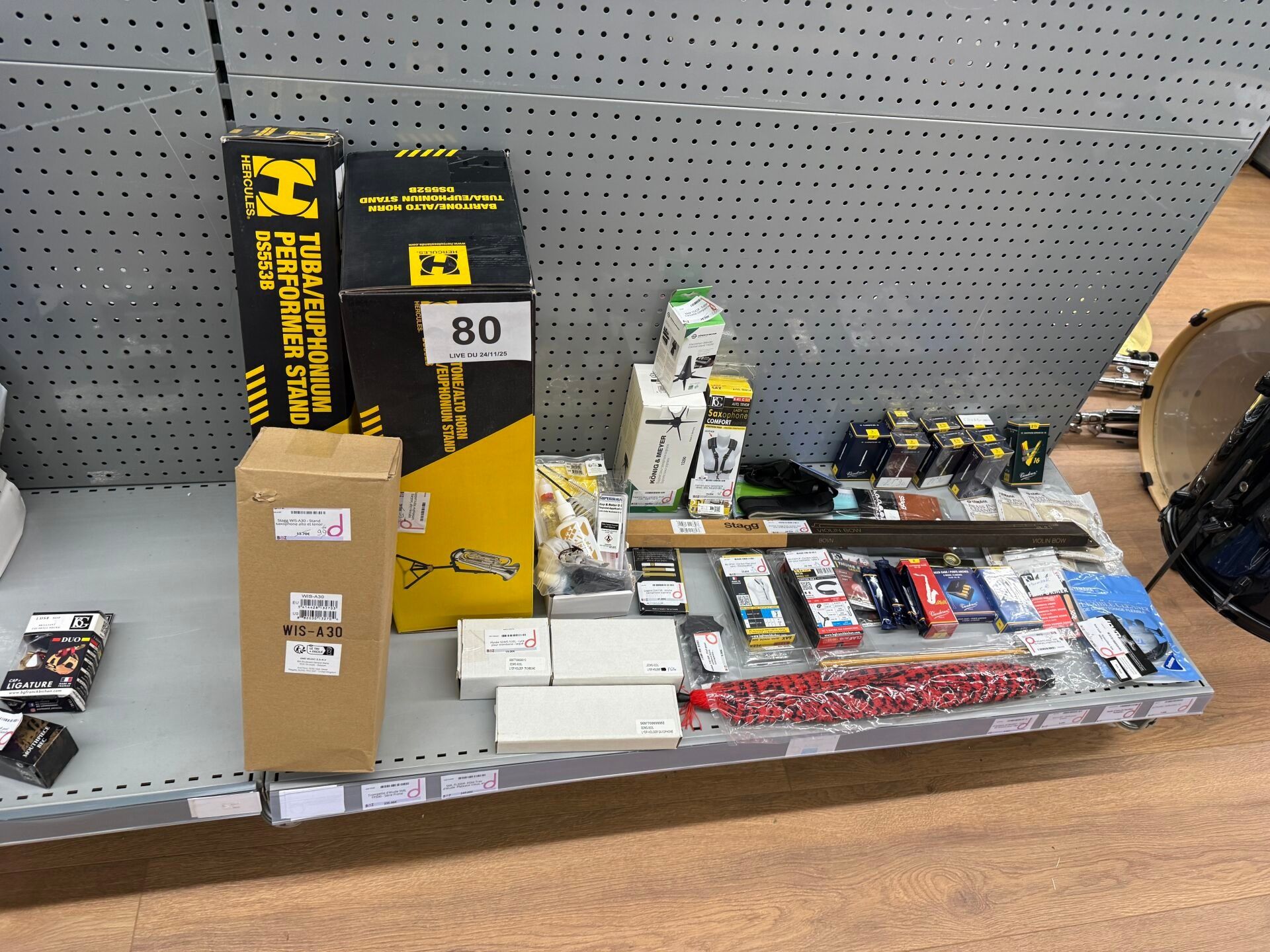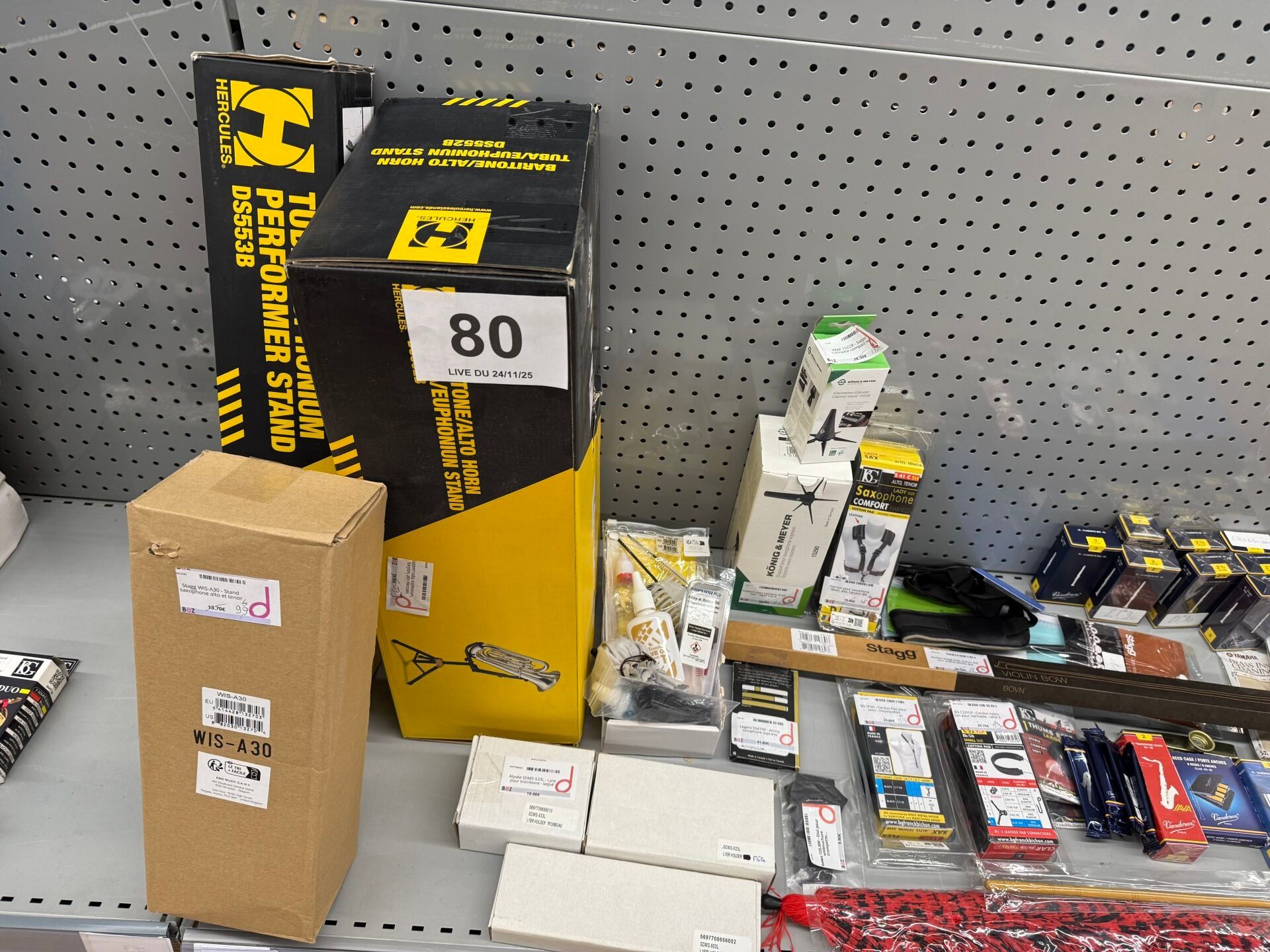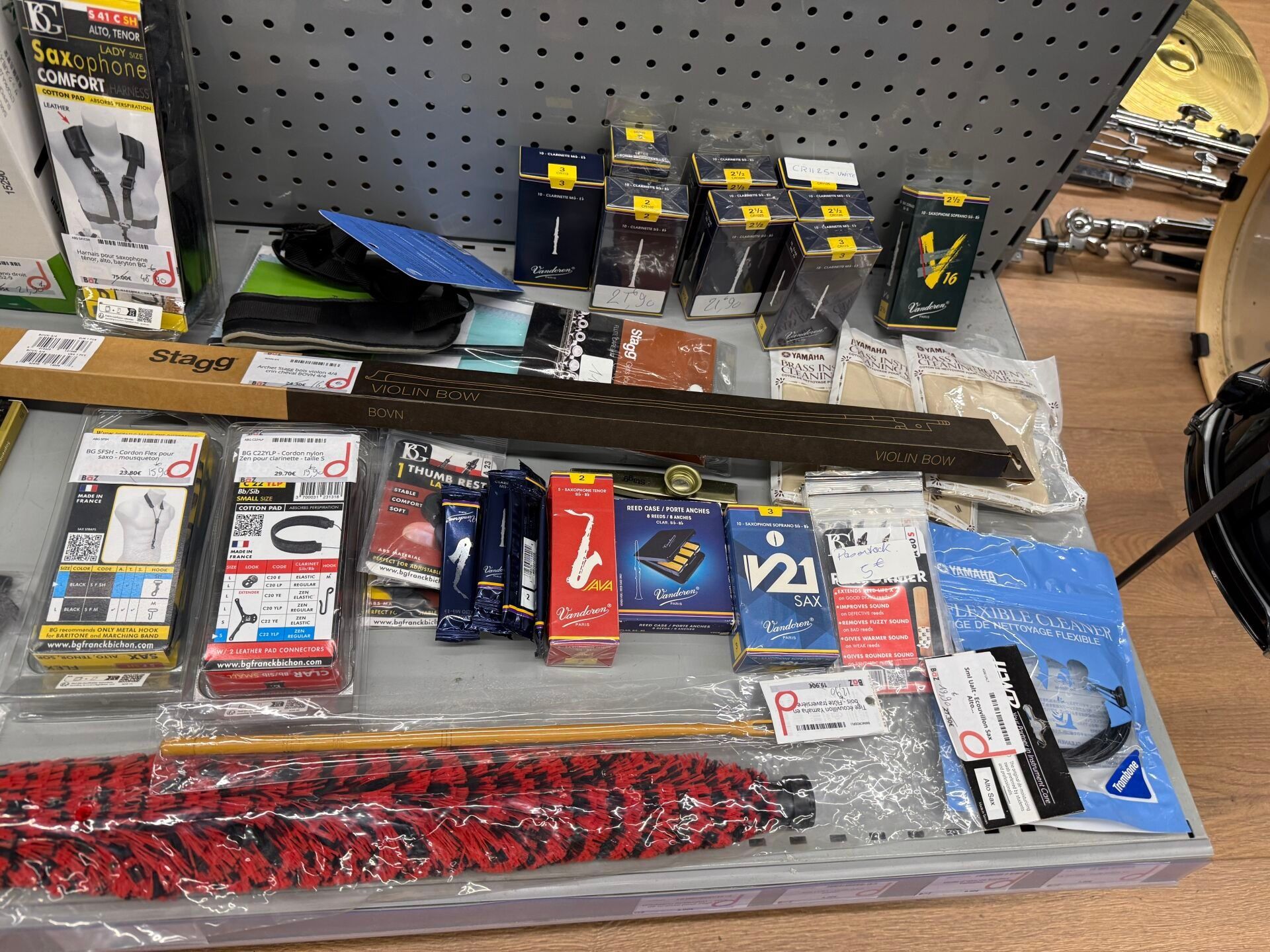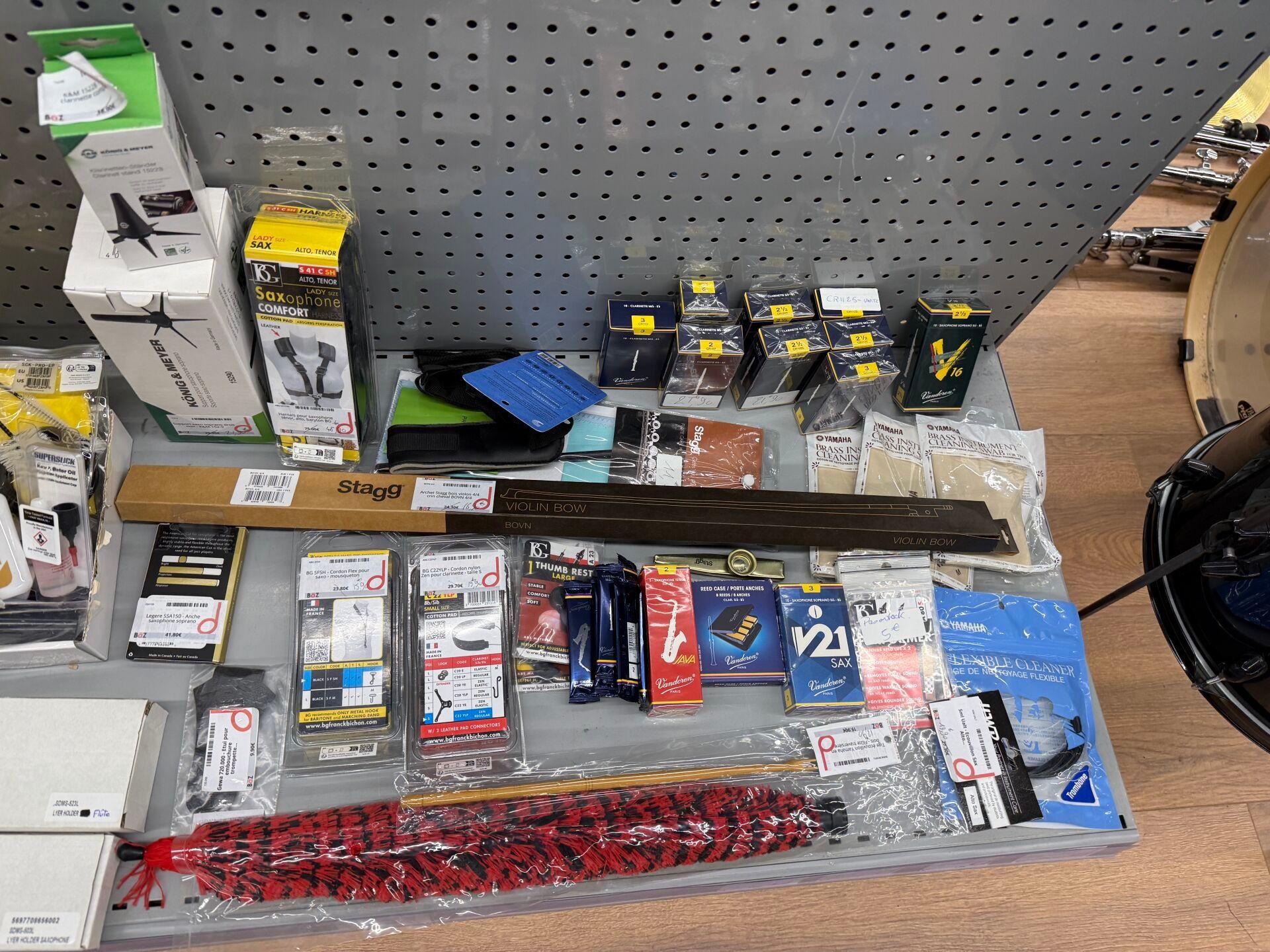 Batch of accessories for wind instruments including stands, lyres, reeds, harnesses and maintenance products