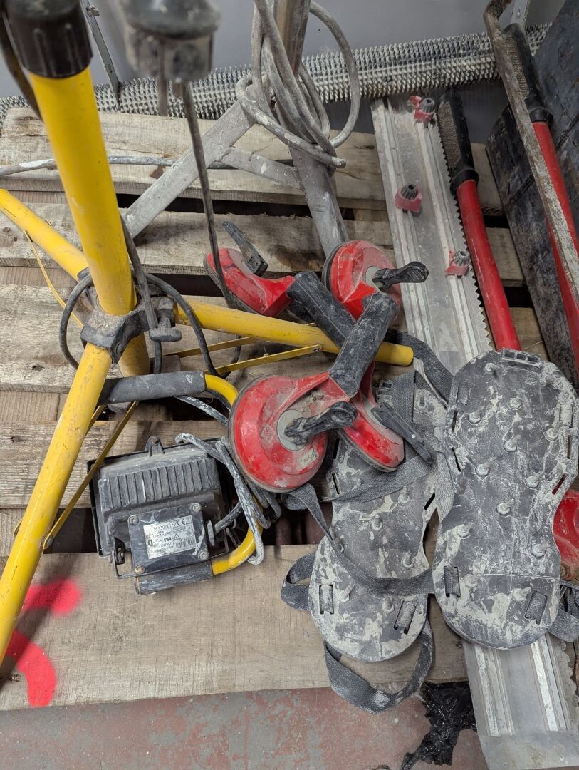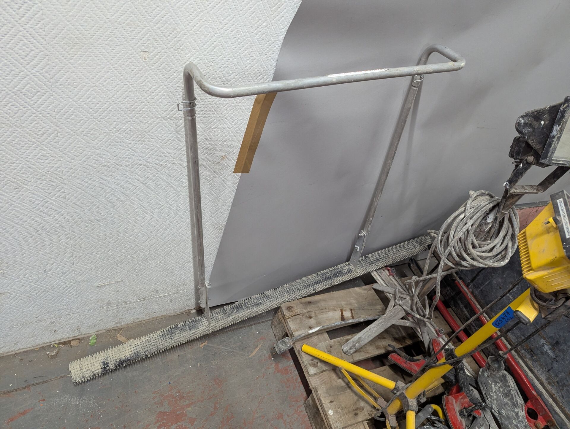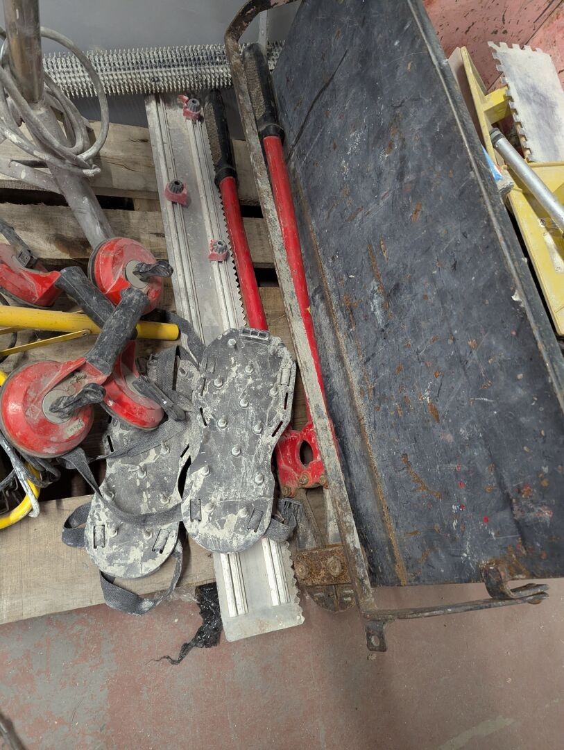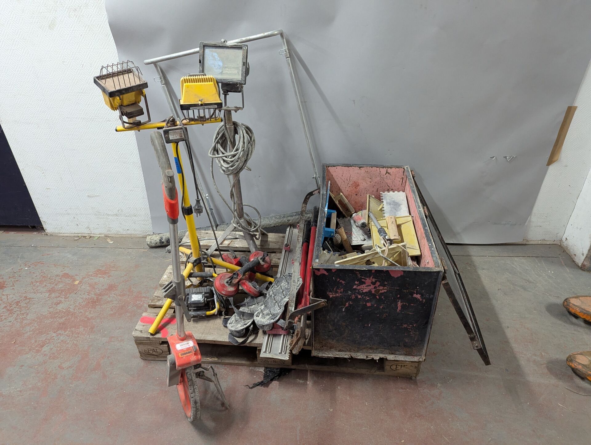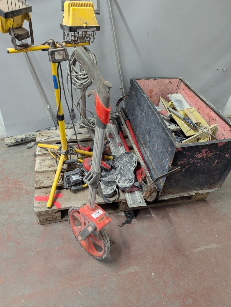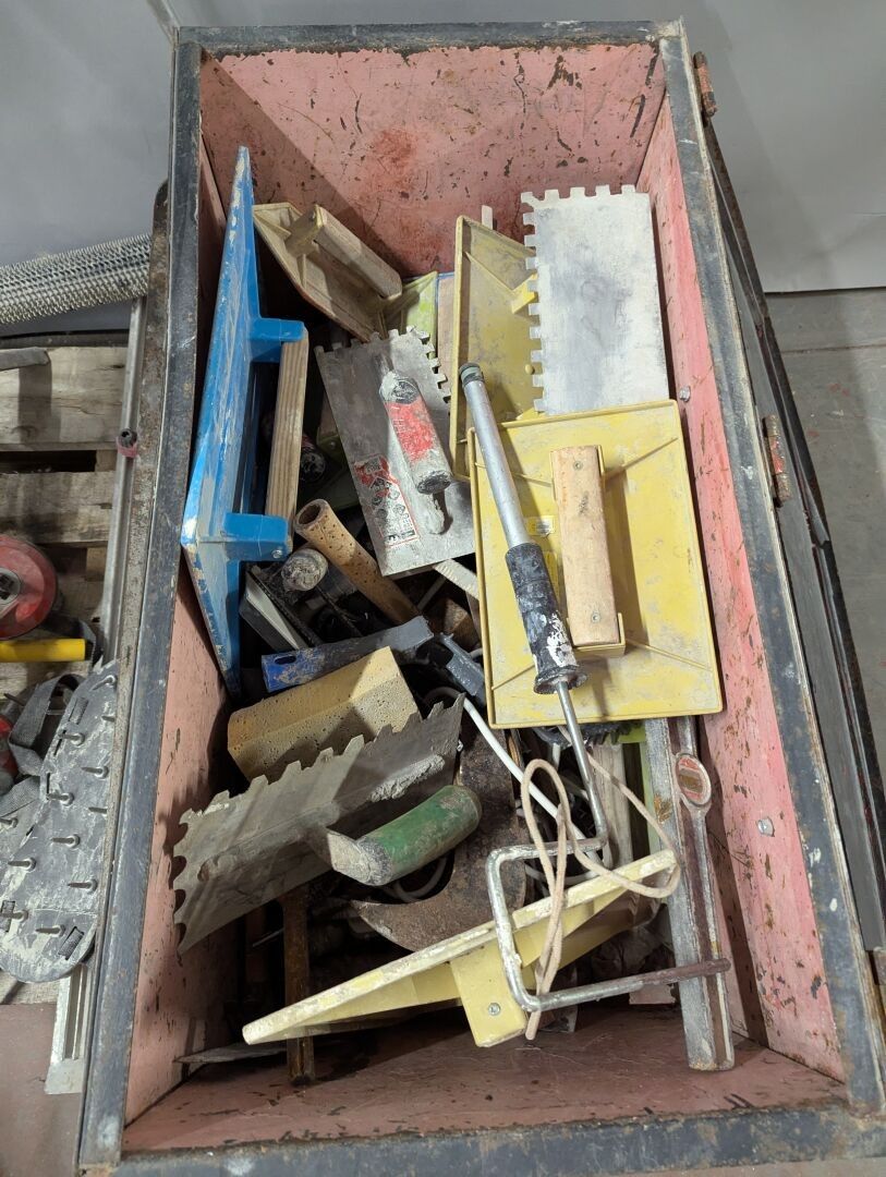 - Grey metal case with small hand tools including crowbar, level, screwdriver, float, trowel, roller and saw