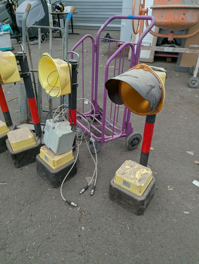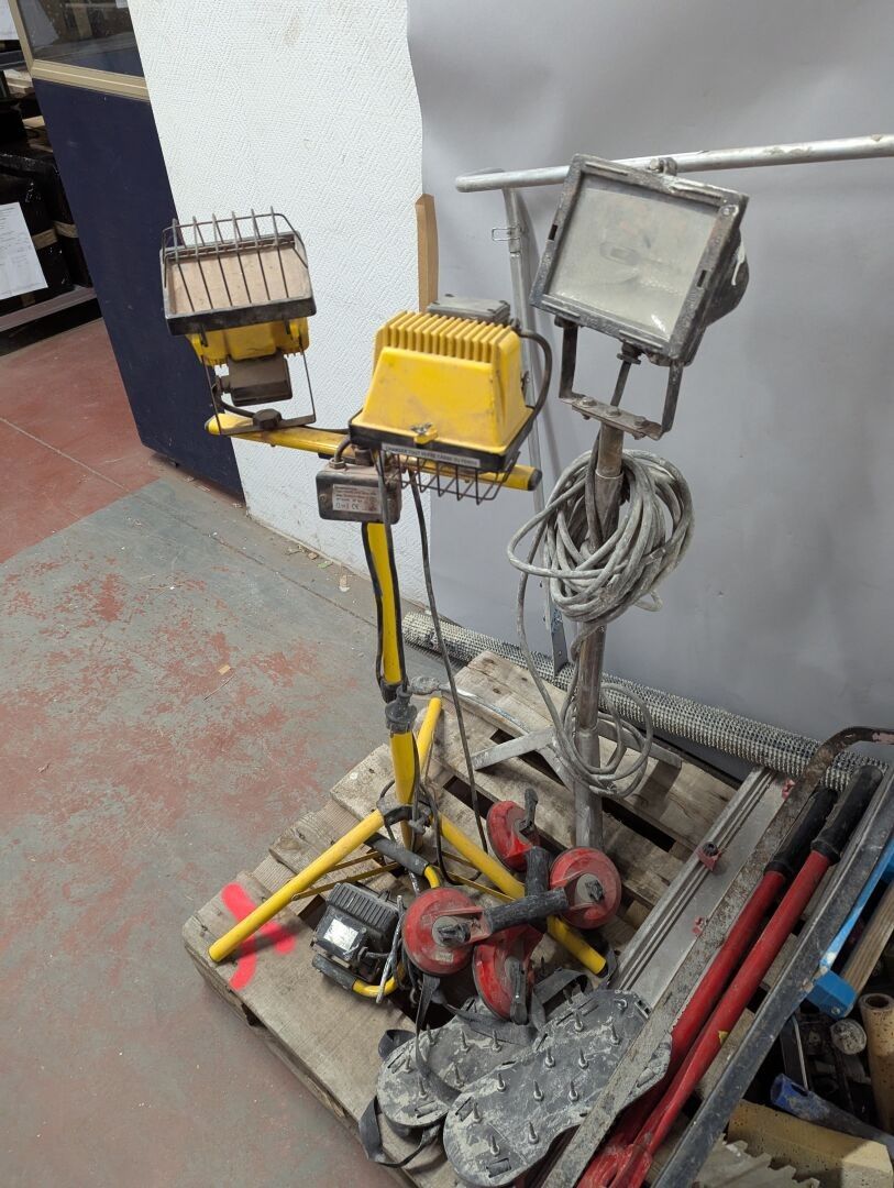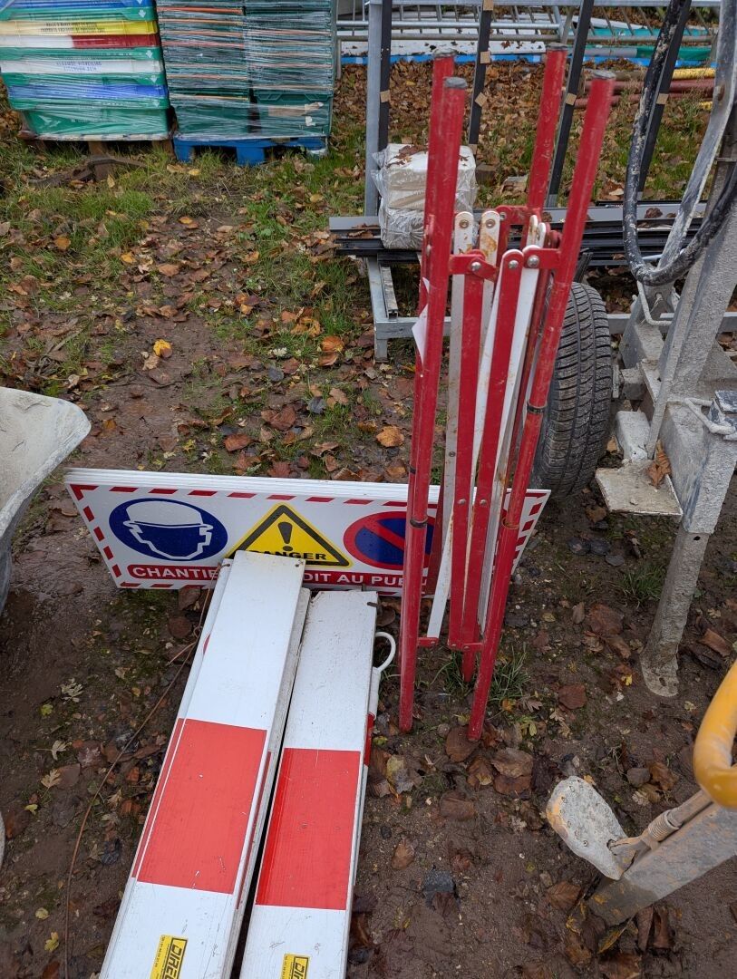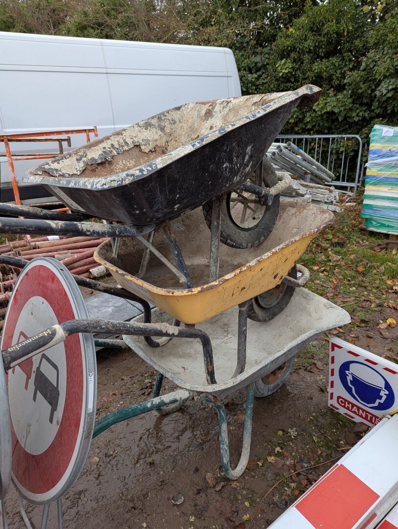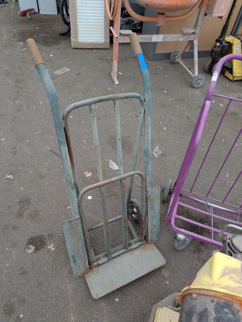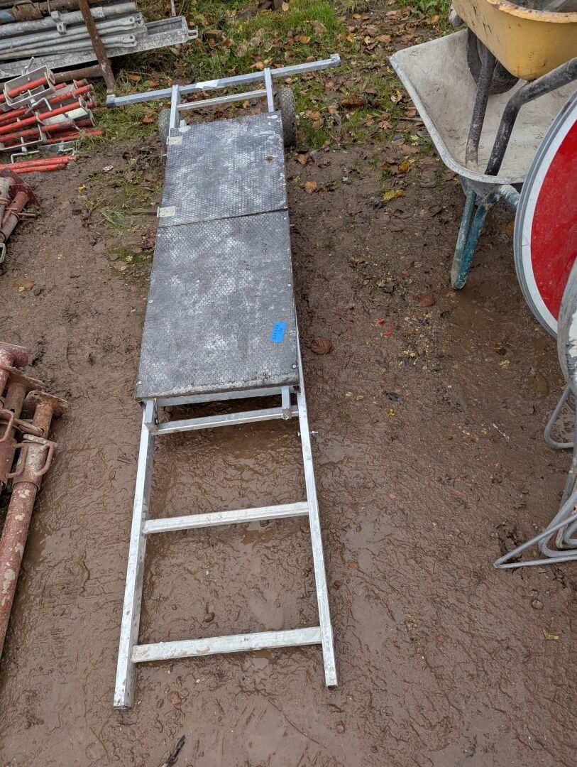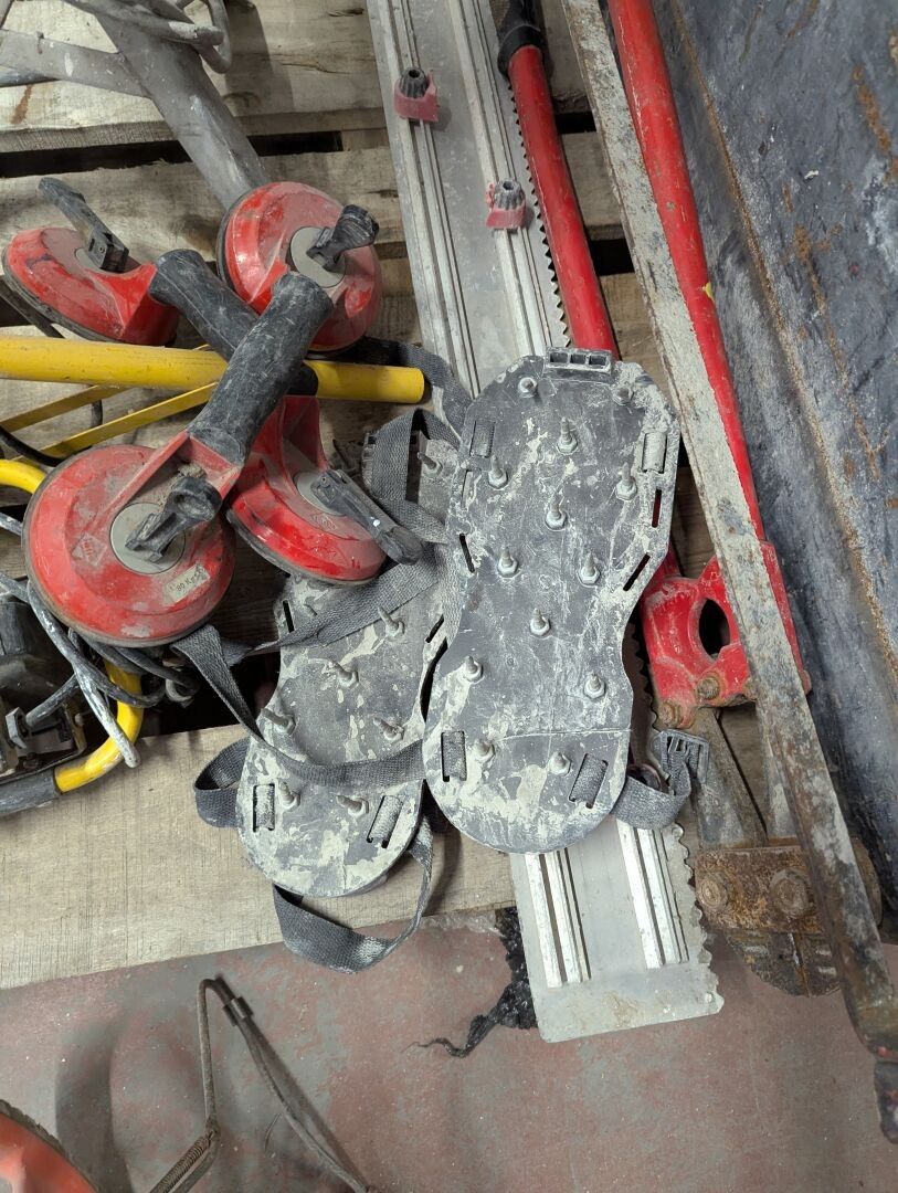- Grey metal case with small hand tools including crowbar, level, screwdriver, float, trowel, roller and saw
