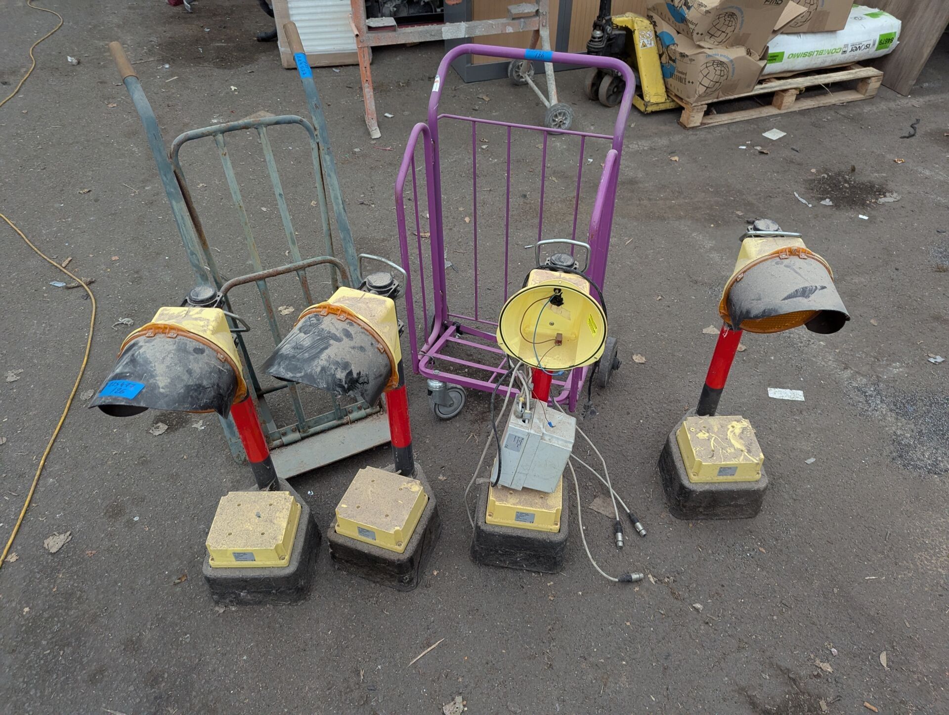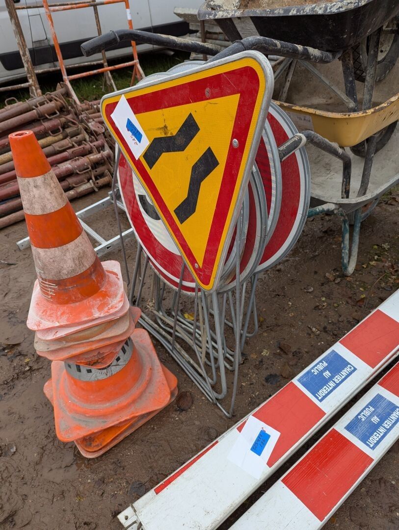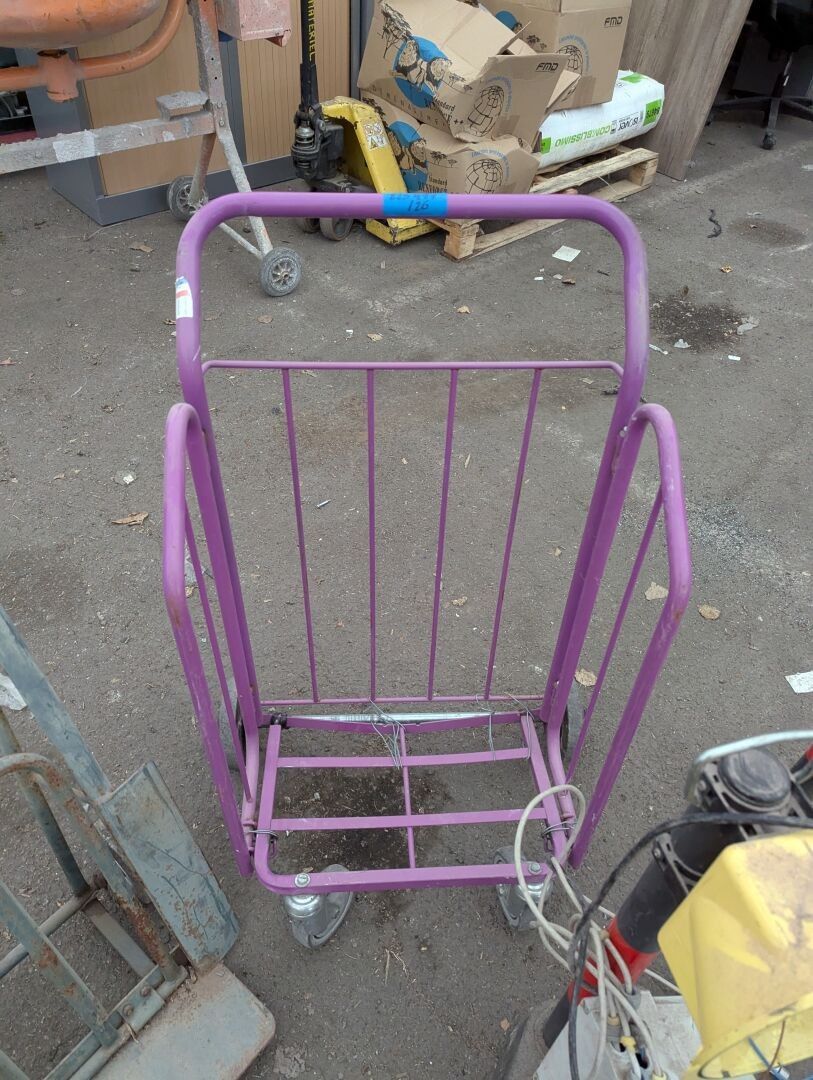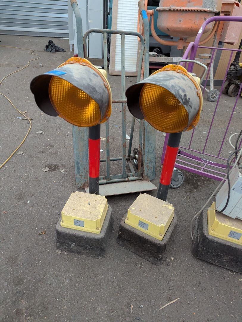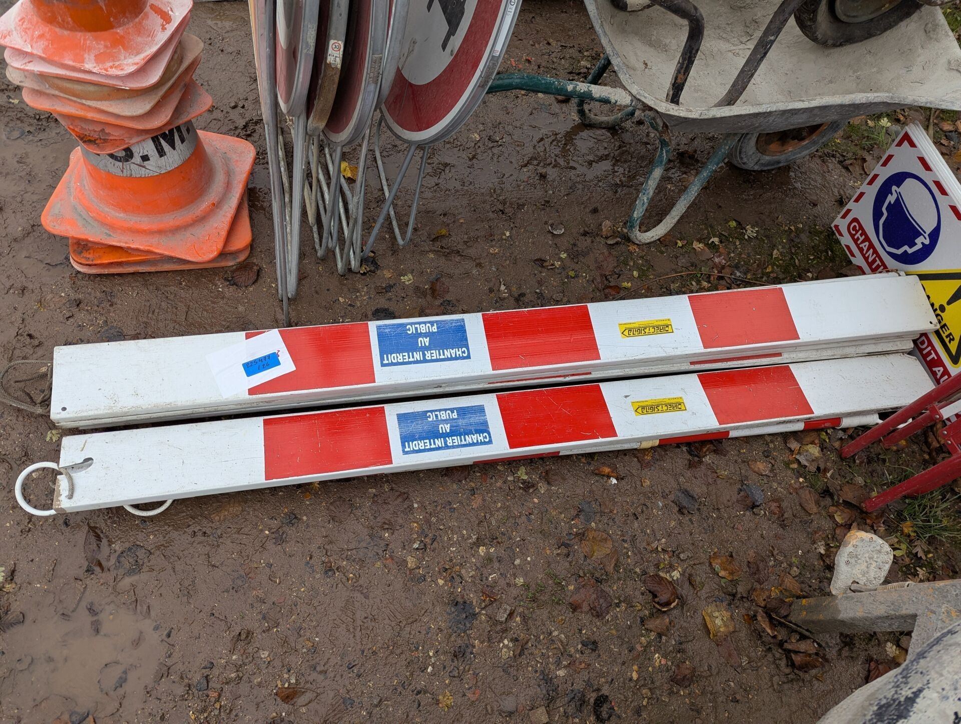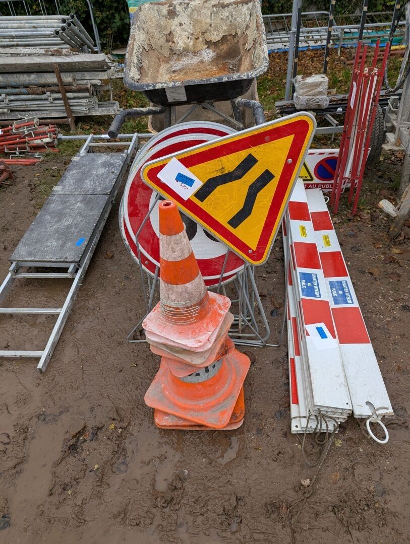 - Grey metal case with small hand tools including crowbar, level, screwdriver, float, trowel, roller and saw