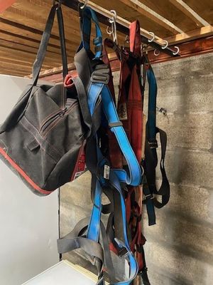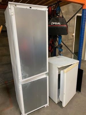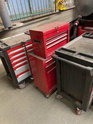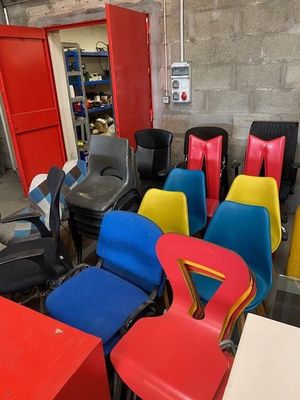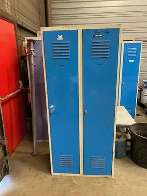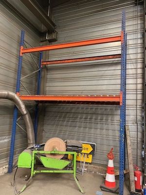 1 small blue shelf, 2 blue tables and 1 yellow shelf