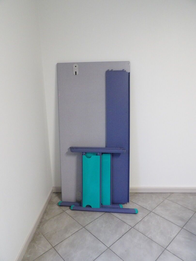 2 height-adjustable wooden trestles + 2 red fabric and black canvas armchairs +1 laminate-topped table +1 dismantled grey desk + 1 wood and fabric chair