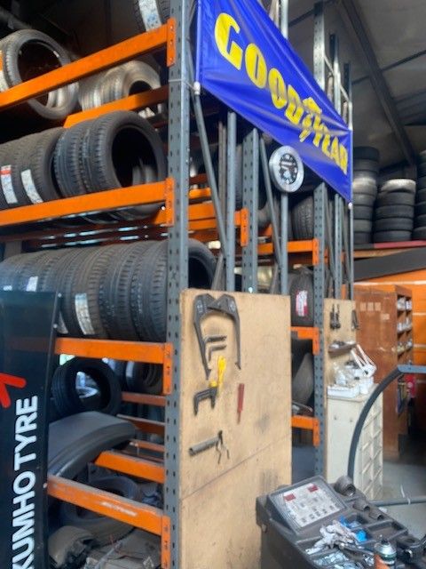 LOT of orange lacquered metal tyre racks.