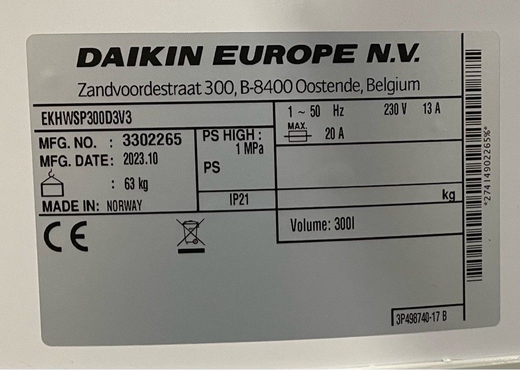 300-litre "DAIKIN" hot water tank, untested, as is.