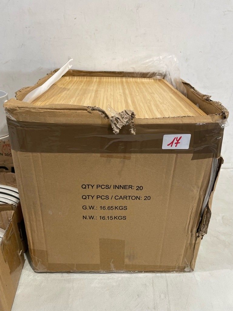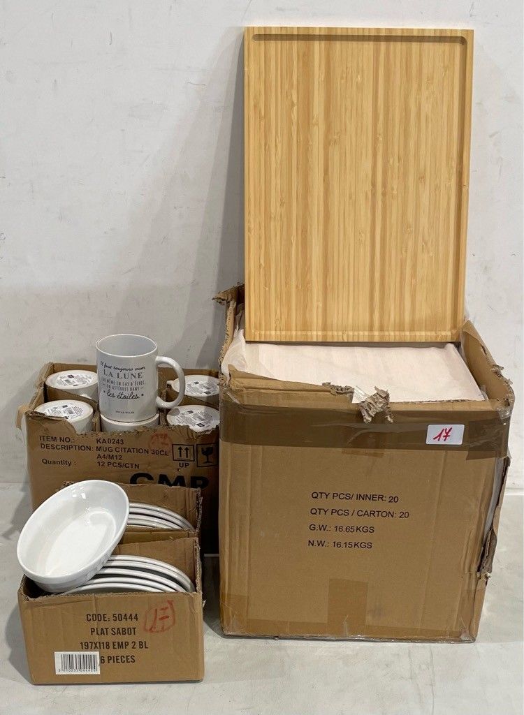 Set of wooden trays (40cm X 30cm approx.), fancy mugs and small oval dishes, as is.