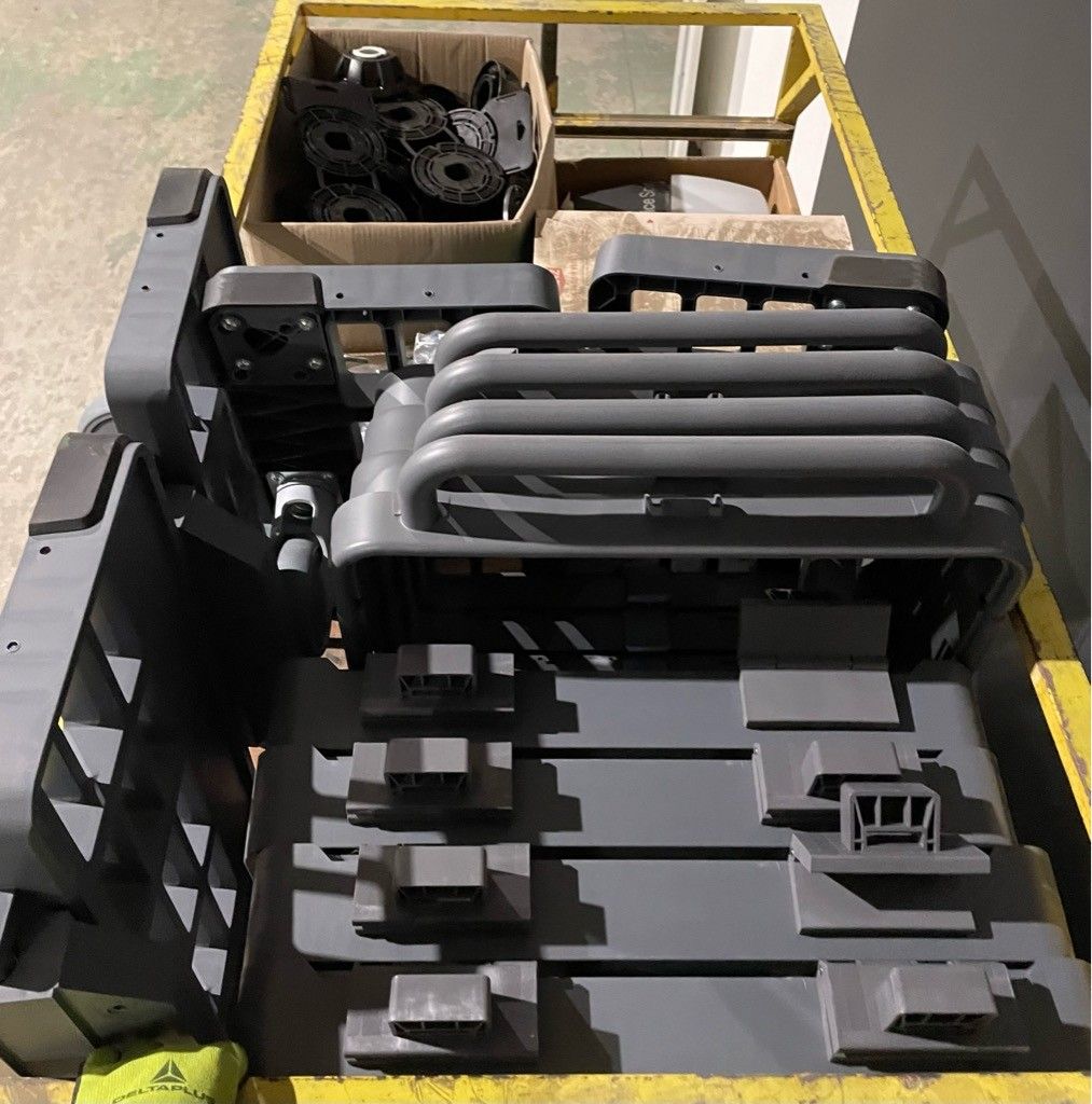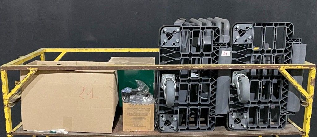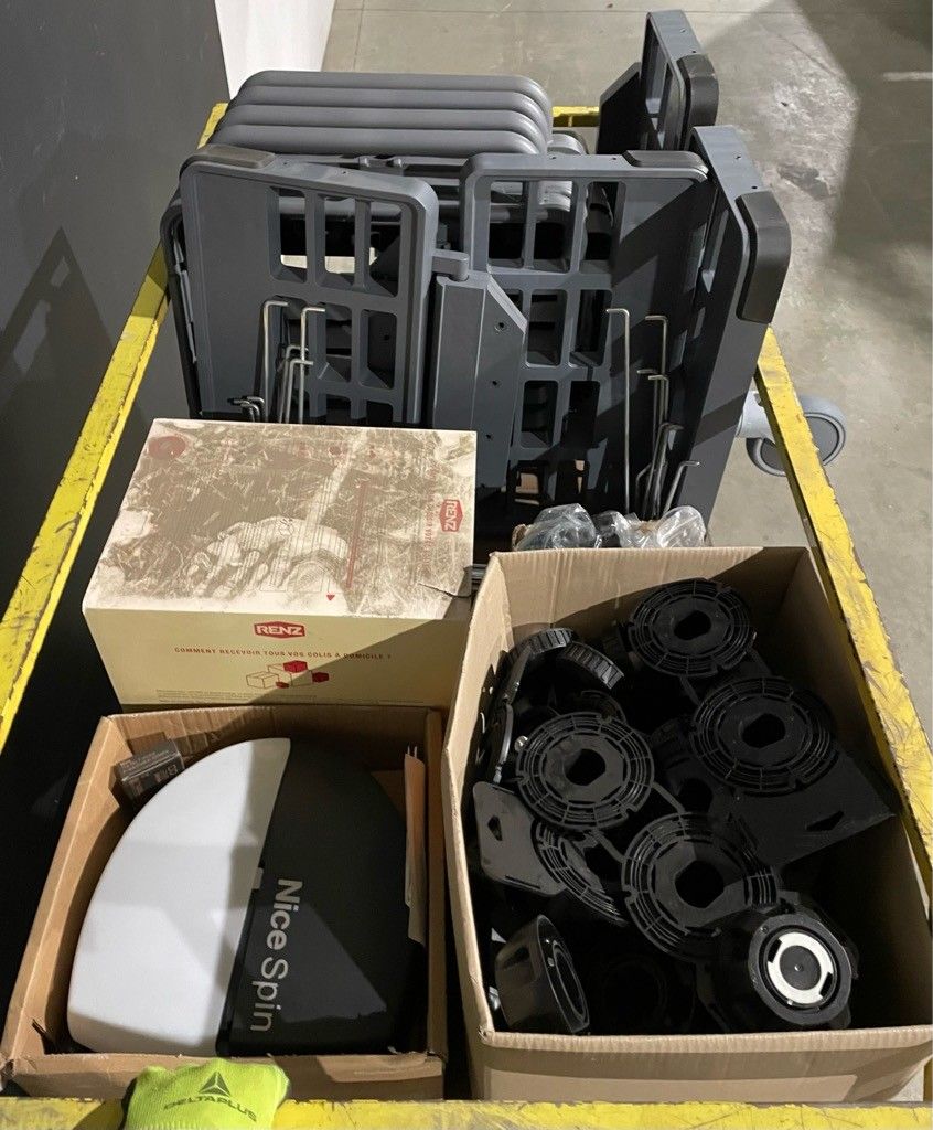 On the entire upper level of the trolley: letterbox, "Nice Spin" garage door motor, box of adjustable feet, "vileda" elements, as is (untested, possibility of malfunction, etc.).