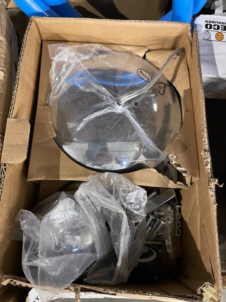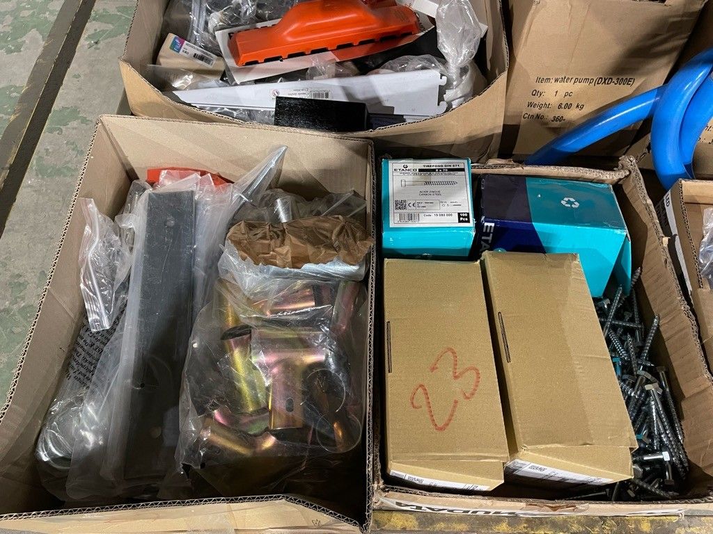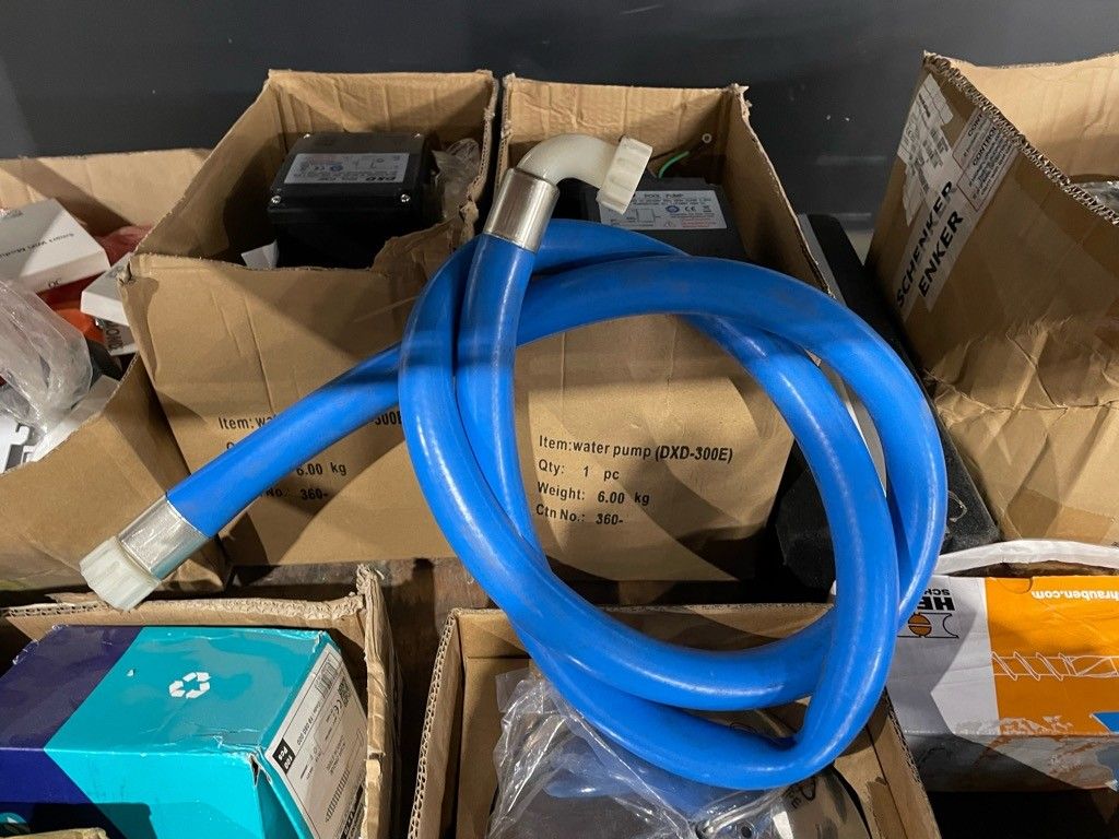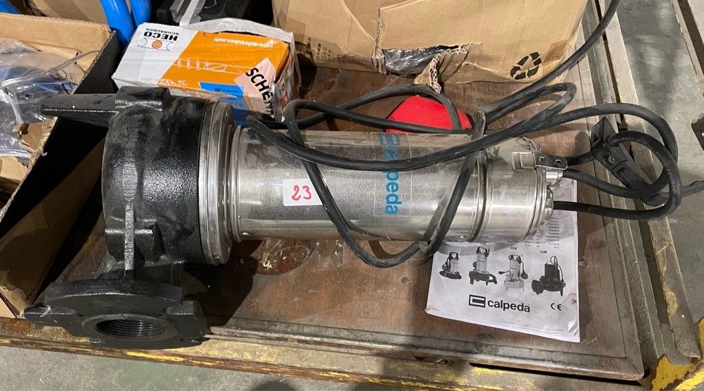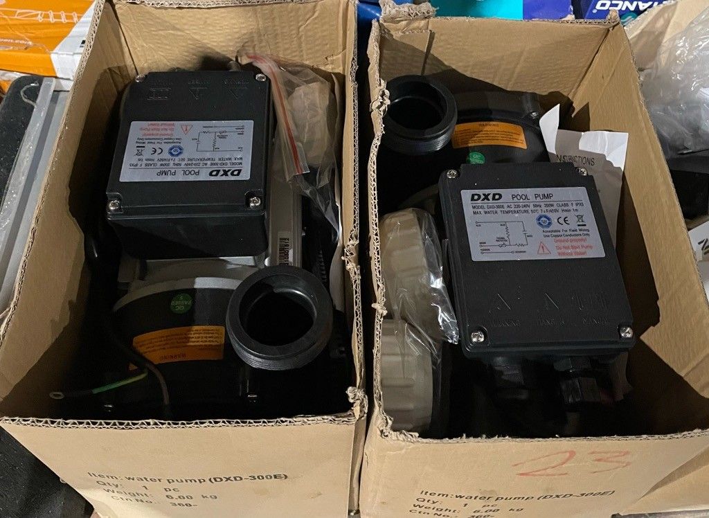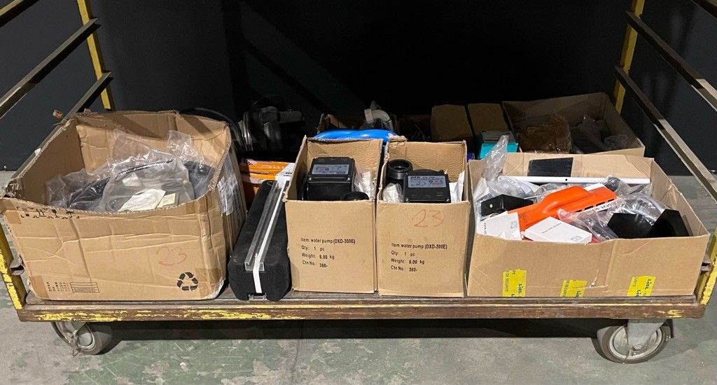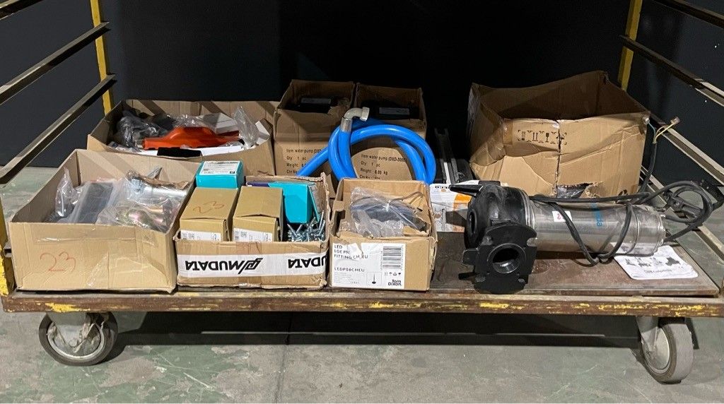 On the entire lower level of the trolley: "DXD" swimming pool pumps, air conditioning stabiliser, "calpeda" submersible pump, hardware and miscellaneous. air conditioning stabiliser, calpeda submersible pump, hardware and miscellaneous, as is (untested, possibility of malfunction, etc.).