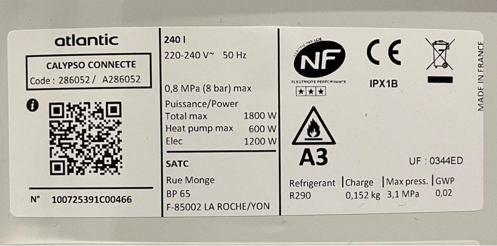 Water heater " ATLANTIC / CALYPSO CONNECTE " 240 litres , not tested , as is .