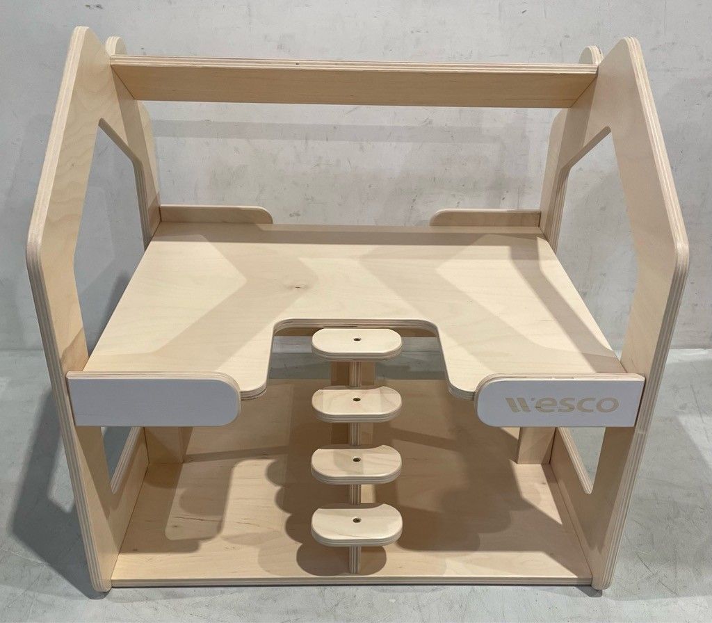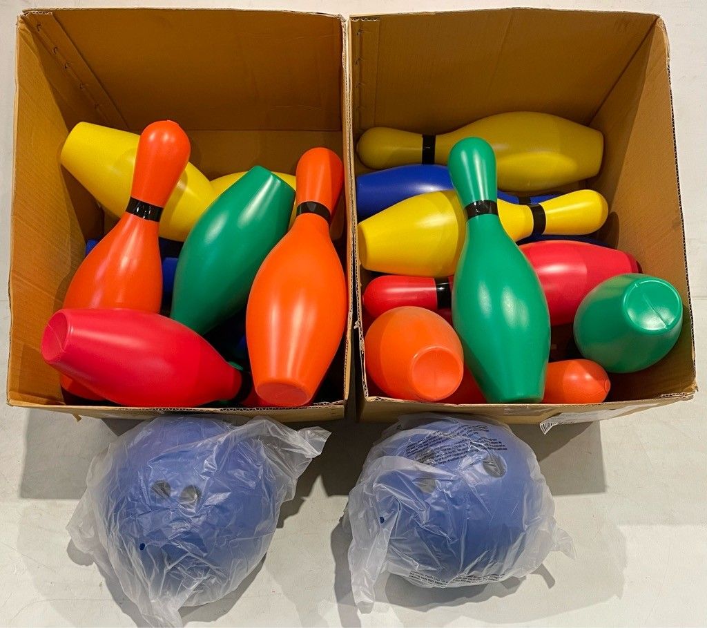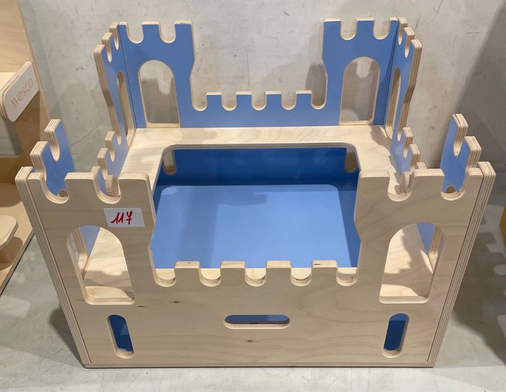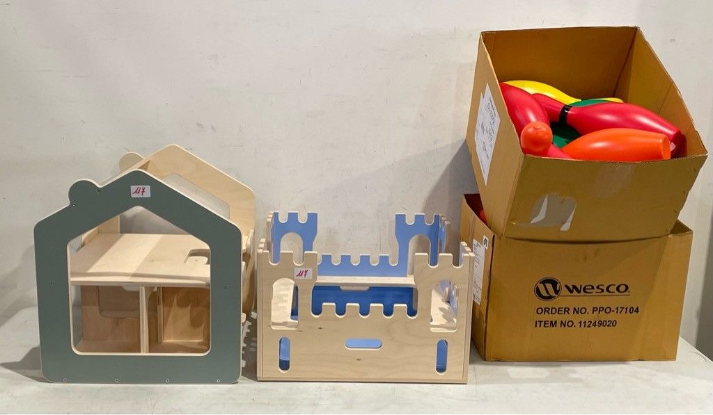 Wooden "wesco" house and castle (approx. 49cm high X 50cm wide X 44cm deep and 31cm high X 48cm wide X 48cm deep) plus plastic bowling pins and balls, as is.