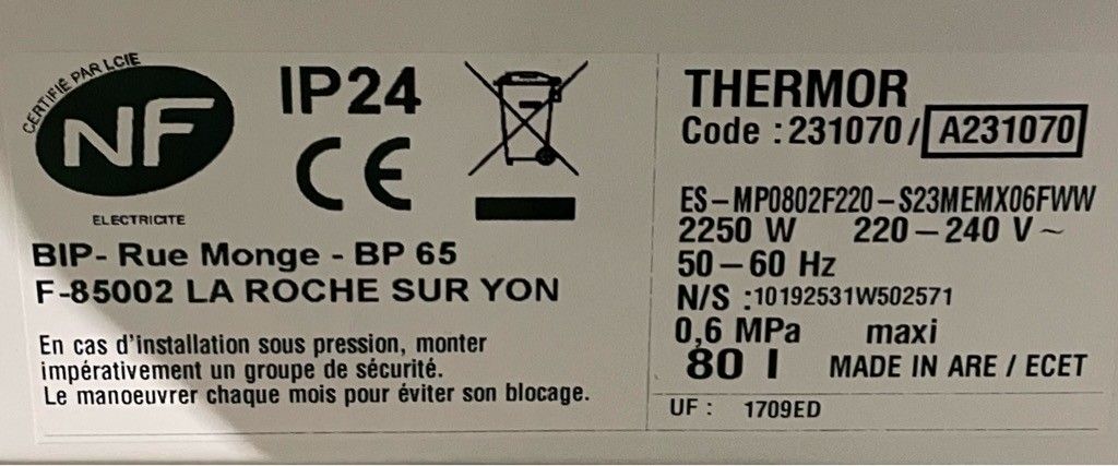 THERMOR" 80 litre water heater, untested, as is.