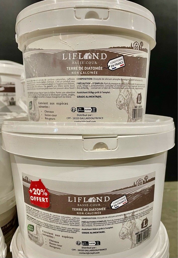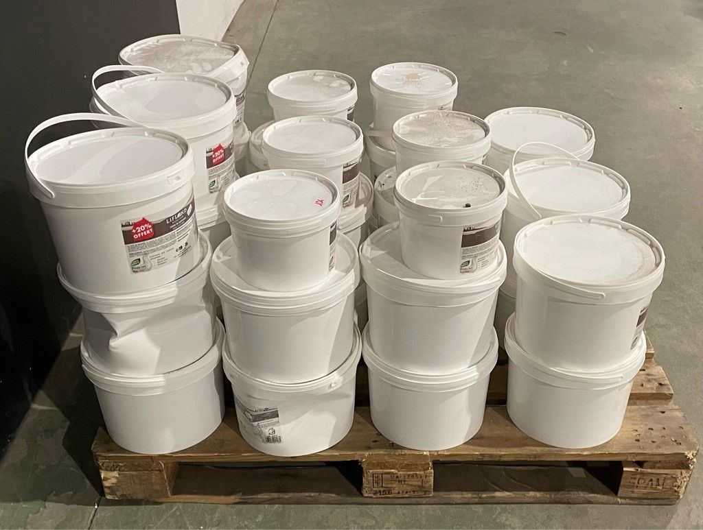 Pallet of Diatomaceous Earth in 3 and 1.25 kg buckets, as is.