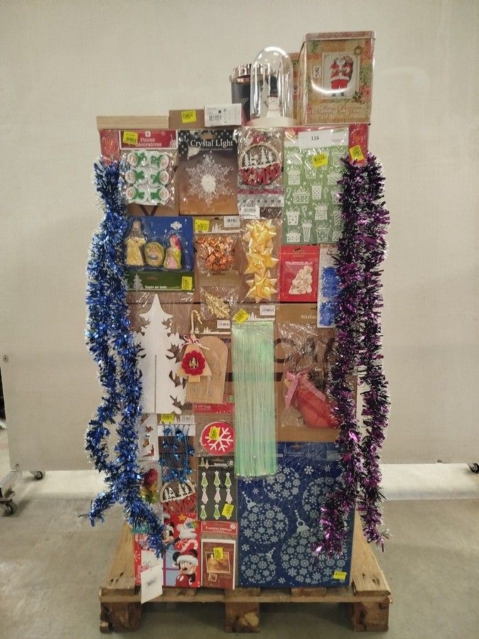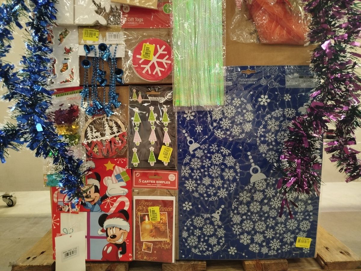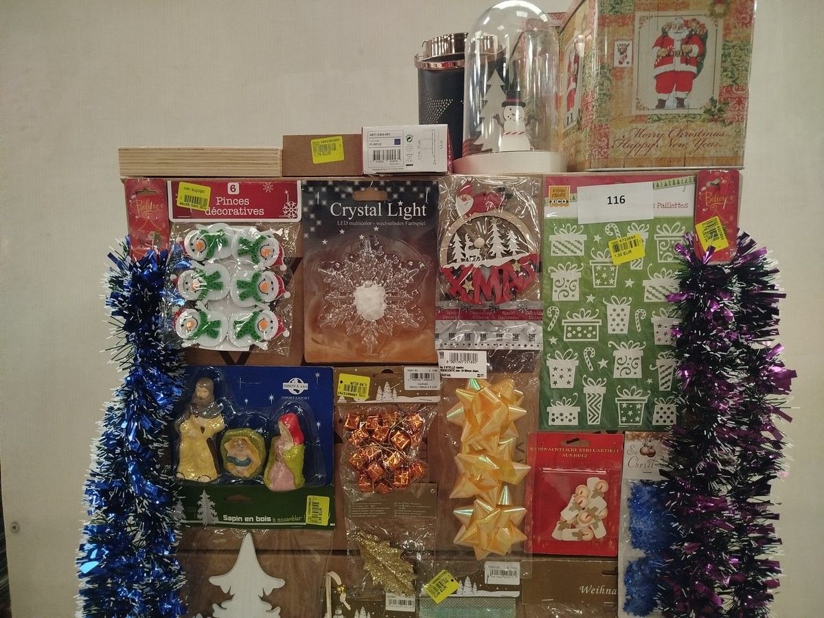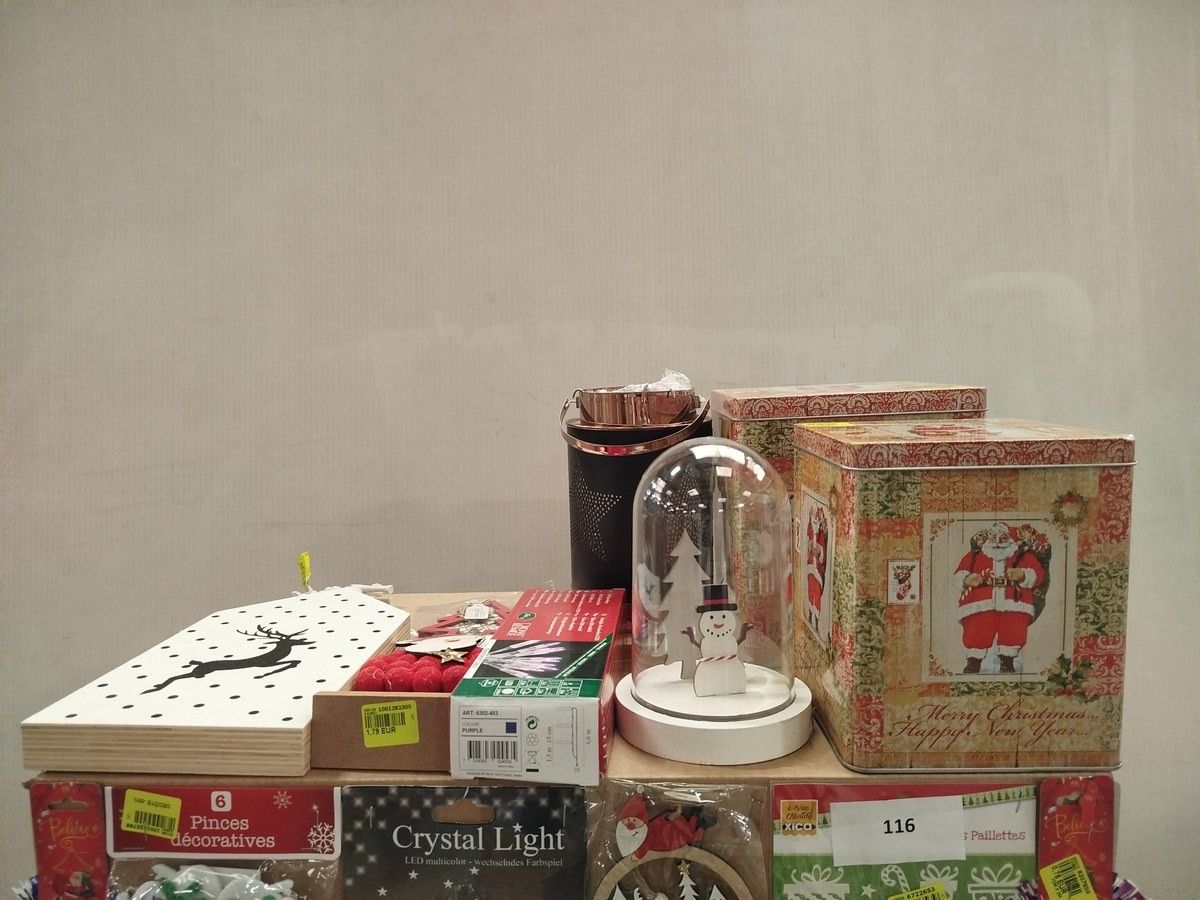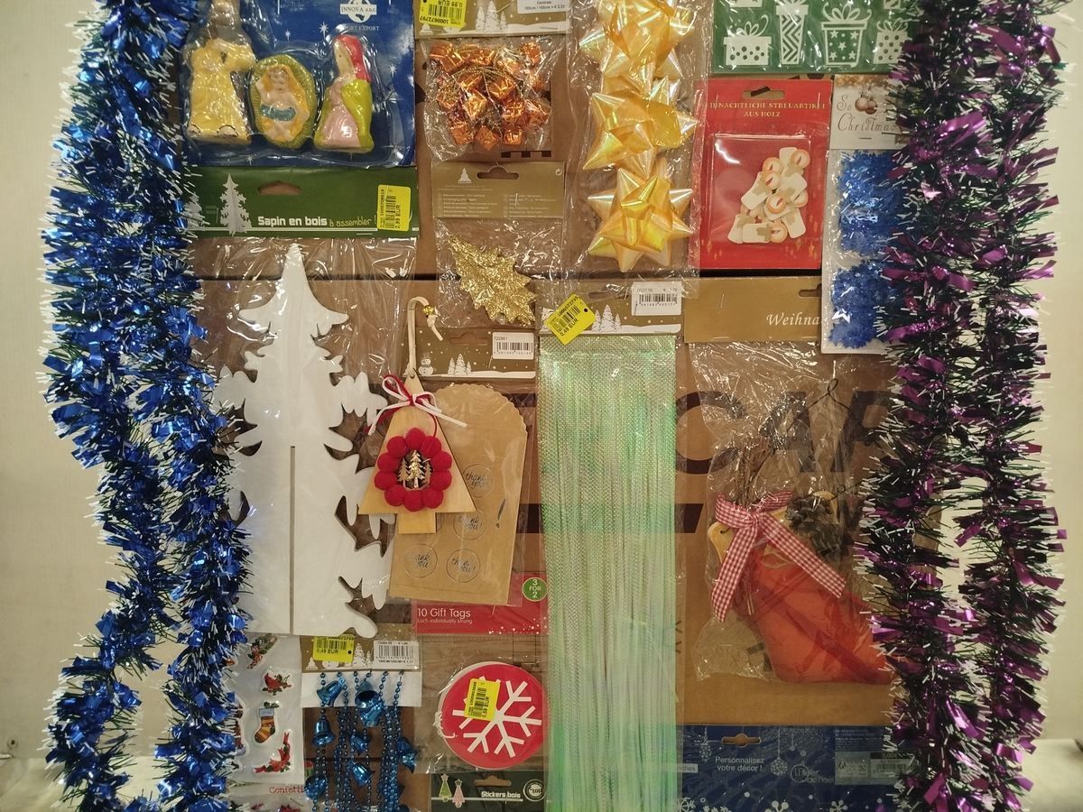 Pack of 3 boxes of Christmas decorations including: wooden objects, cards, stickers, napkins, decorations, etc.