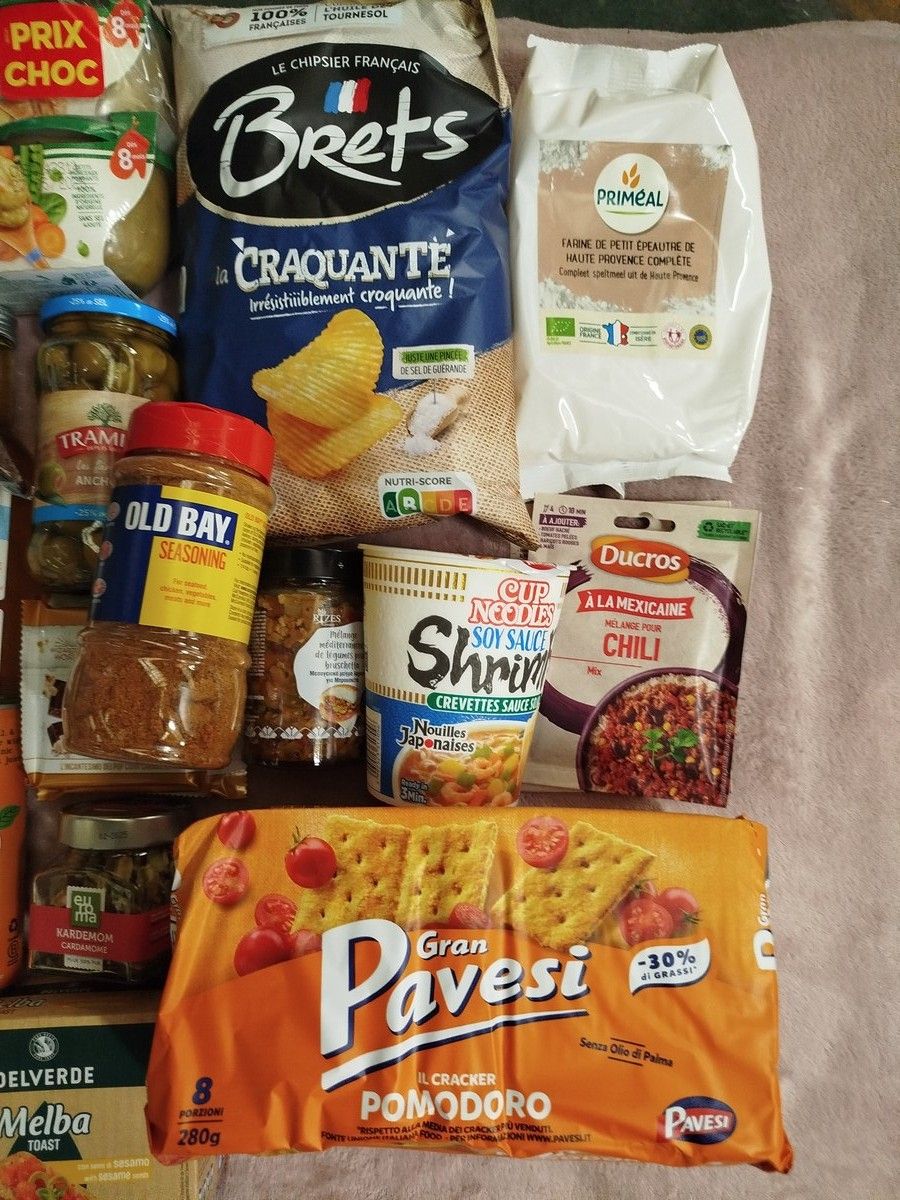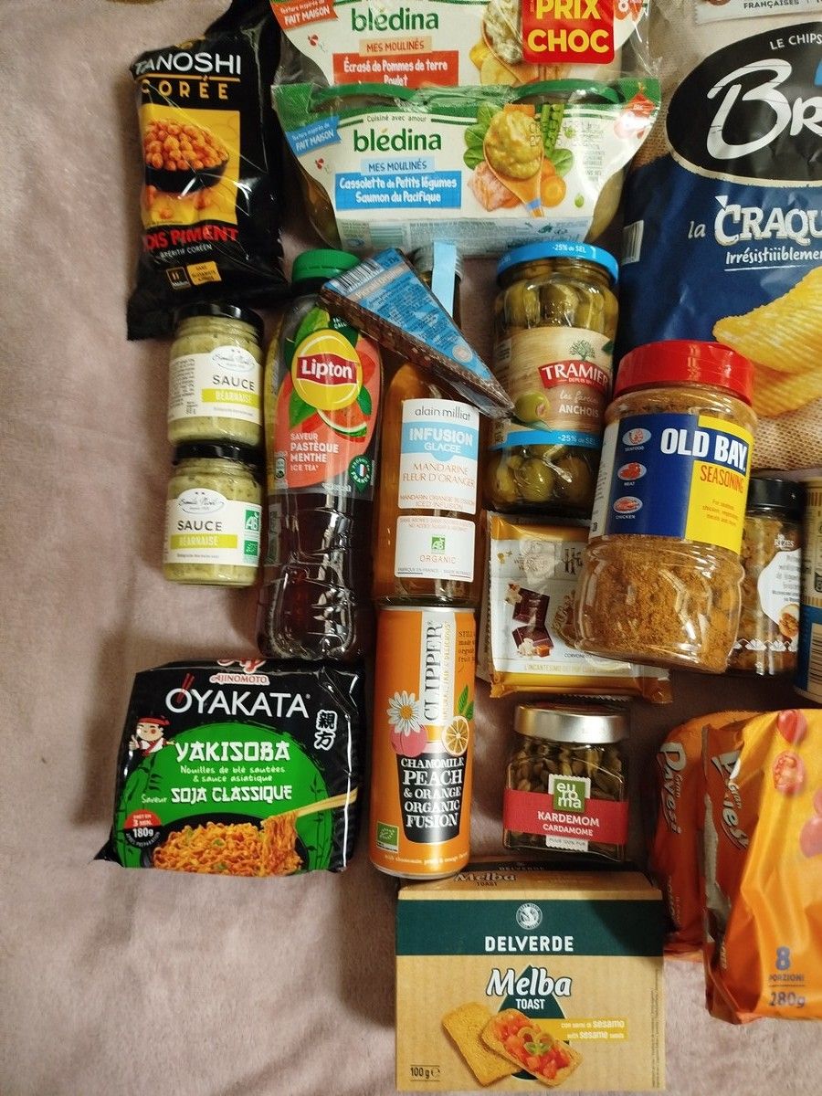 Batch of 34 anti-waste food parcels including: sauce pots, crisps, spices, blédina, Chinese noodles, etc.