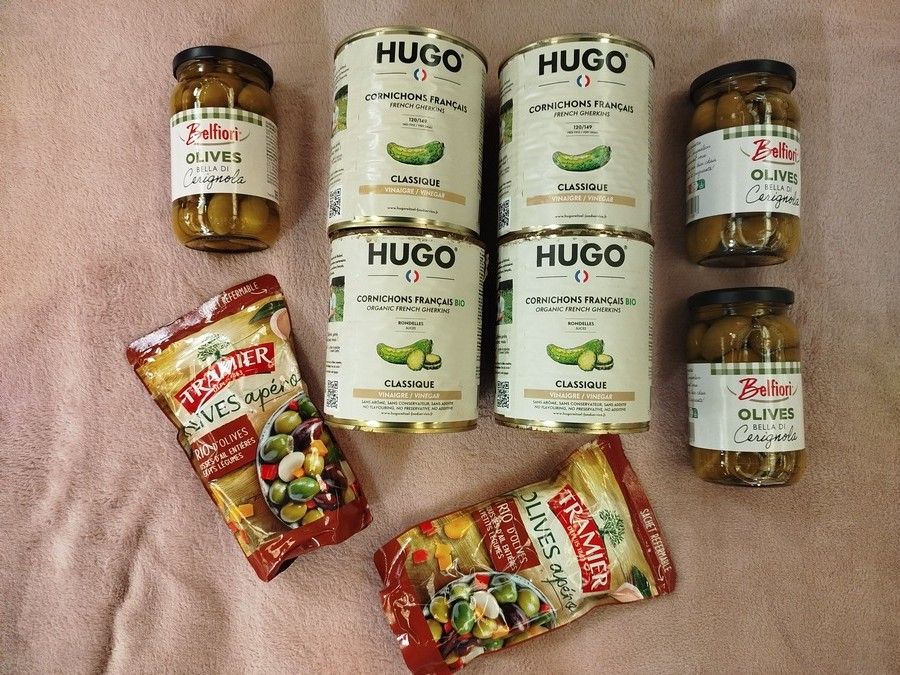 Batch of 71 anti-waste food parcels including: olives, gherkins, etc.