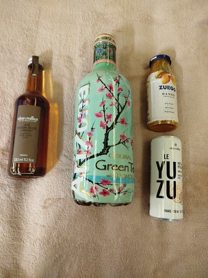 Batch of drinks including: 75 bottles of GREAN TEA original 1.5 L, 15 bottles of mango flavoured zuego 200ml, 2 cans of YUZU 250 ml and 2 bottles of pink grape juice 330ml.