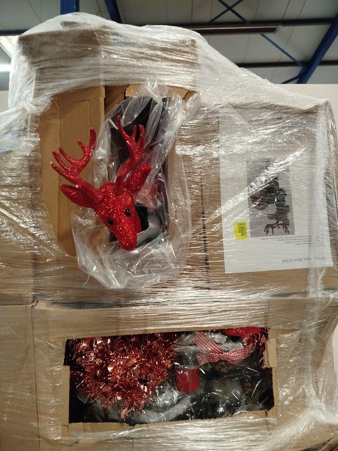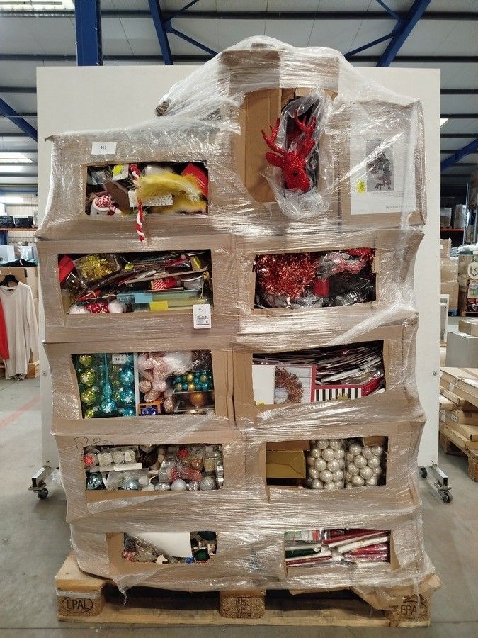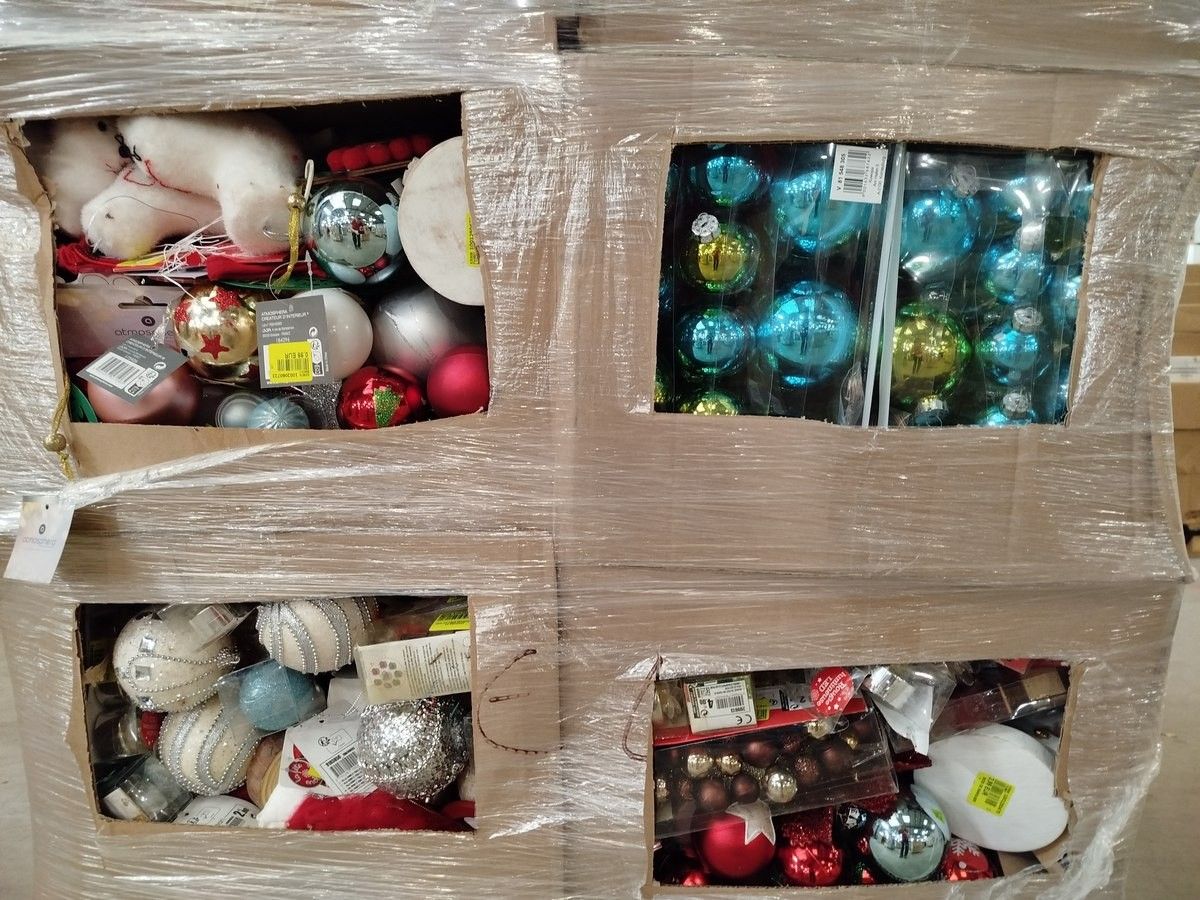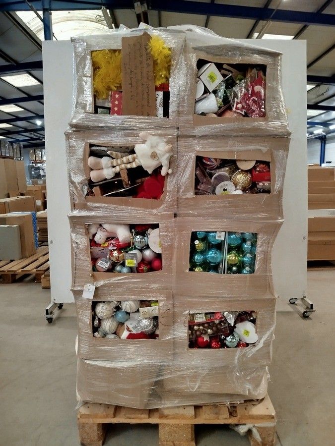 1 pallet of miscellaneous Christmas items including: packages of baubles, baubles, tablecloths, gurilandes, gift boxes, gnomes, LED candles, etc. - Batch of new products that may contain damaged and/or broken products.