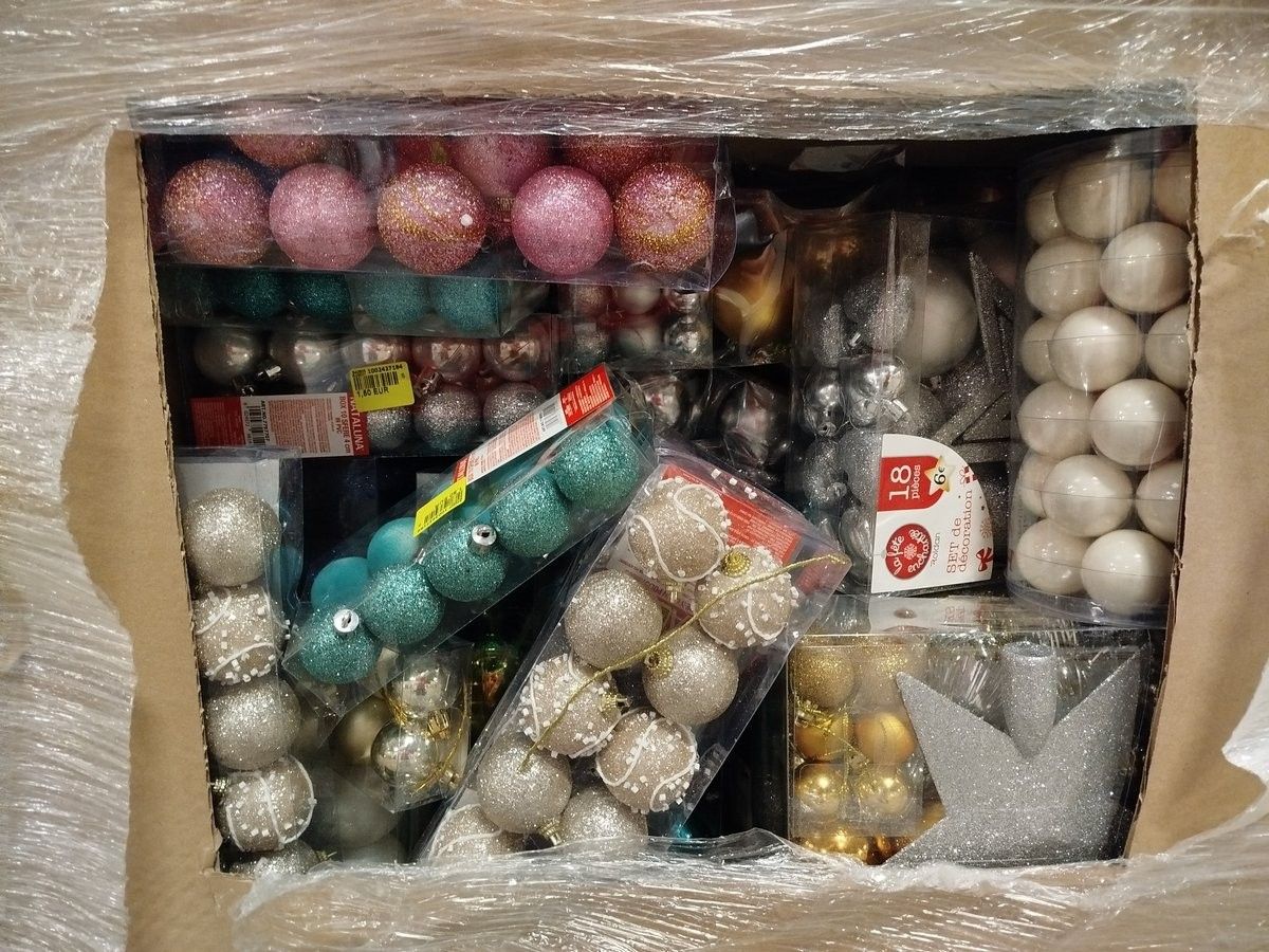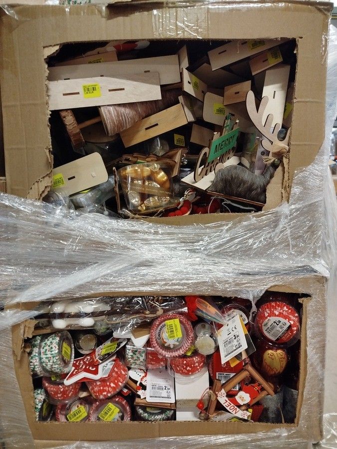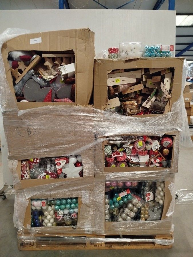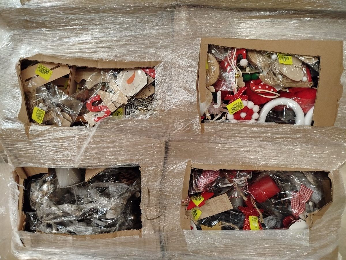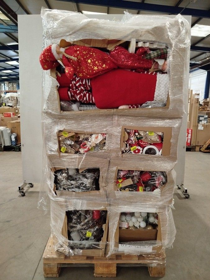 1 pallet of various Christmas items including: bauble boxes, gnomes, wooden decorations, table wreaths, cake moulds, etc. - Batch of new products that may contain damaged and/or broken products.