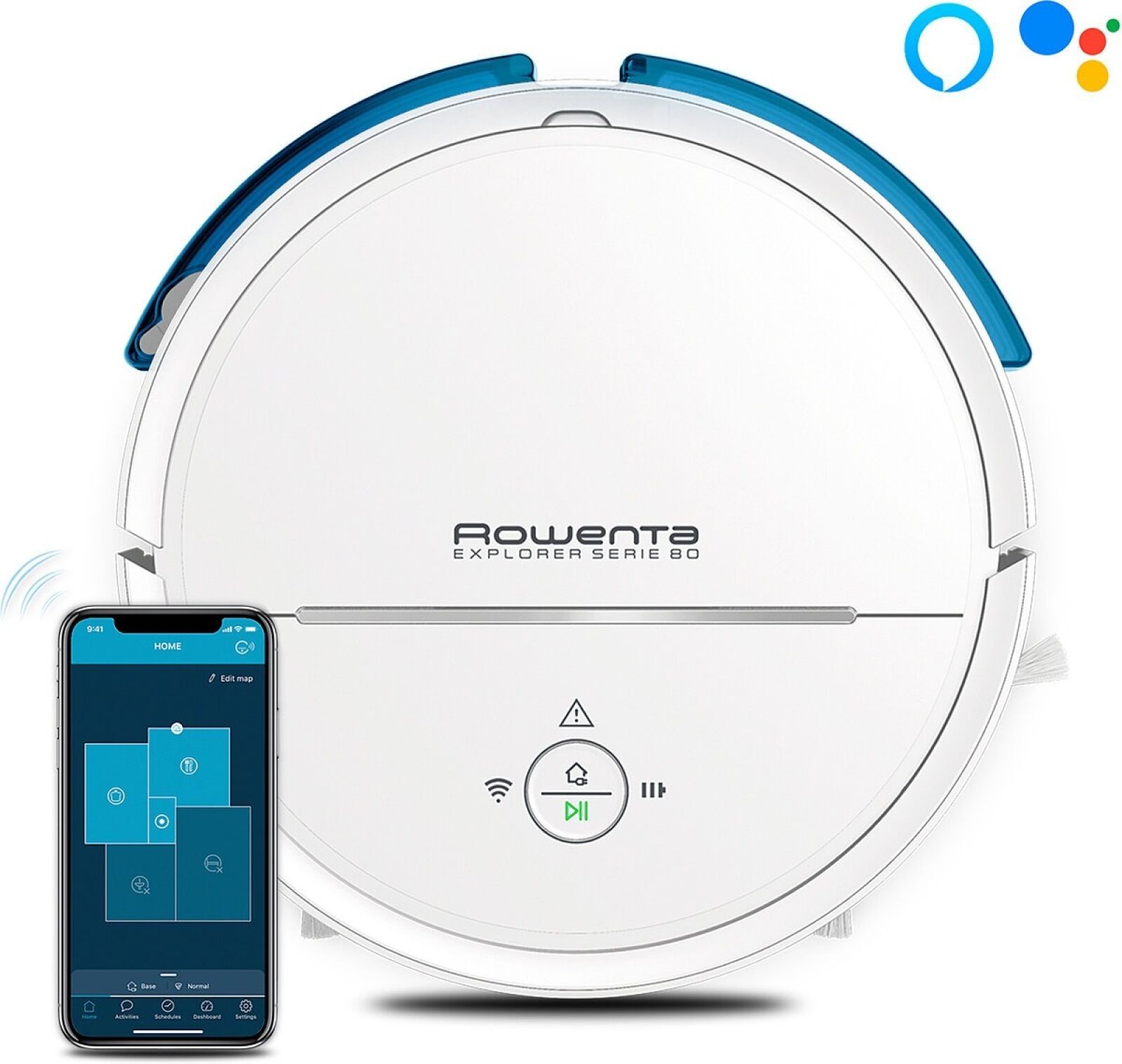 8072-500 / Robotic hoover with 3 navigation modes - ROWENTA - Explorer RR7747 - White - Anti-fall and anti-shock sensors - Lithium-ion battery - Up to 120 min autonomy - 3 h charging time - 0.7 L bagless collector - HEPA filter - Control via mobile app - Noise level 70 dB - Dimensions: 34 x 34 x 9.7 cm /// LIGHT TRACES OF USE
