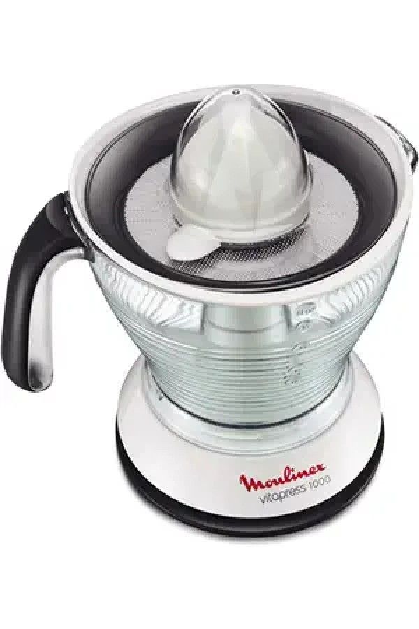 8350-432 / Electric juicer - MOULINEX - PC302B10 - Capacity : 1 L - Double rotating cone - 2 adjustable pulp filters - Automatic on/off function - Anti-drip system - Compact storage - Power : 25 W - Dimensions : 22 x 18 x 21,7 cm /// AS NEW