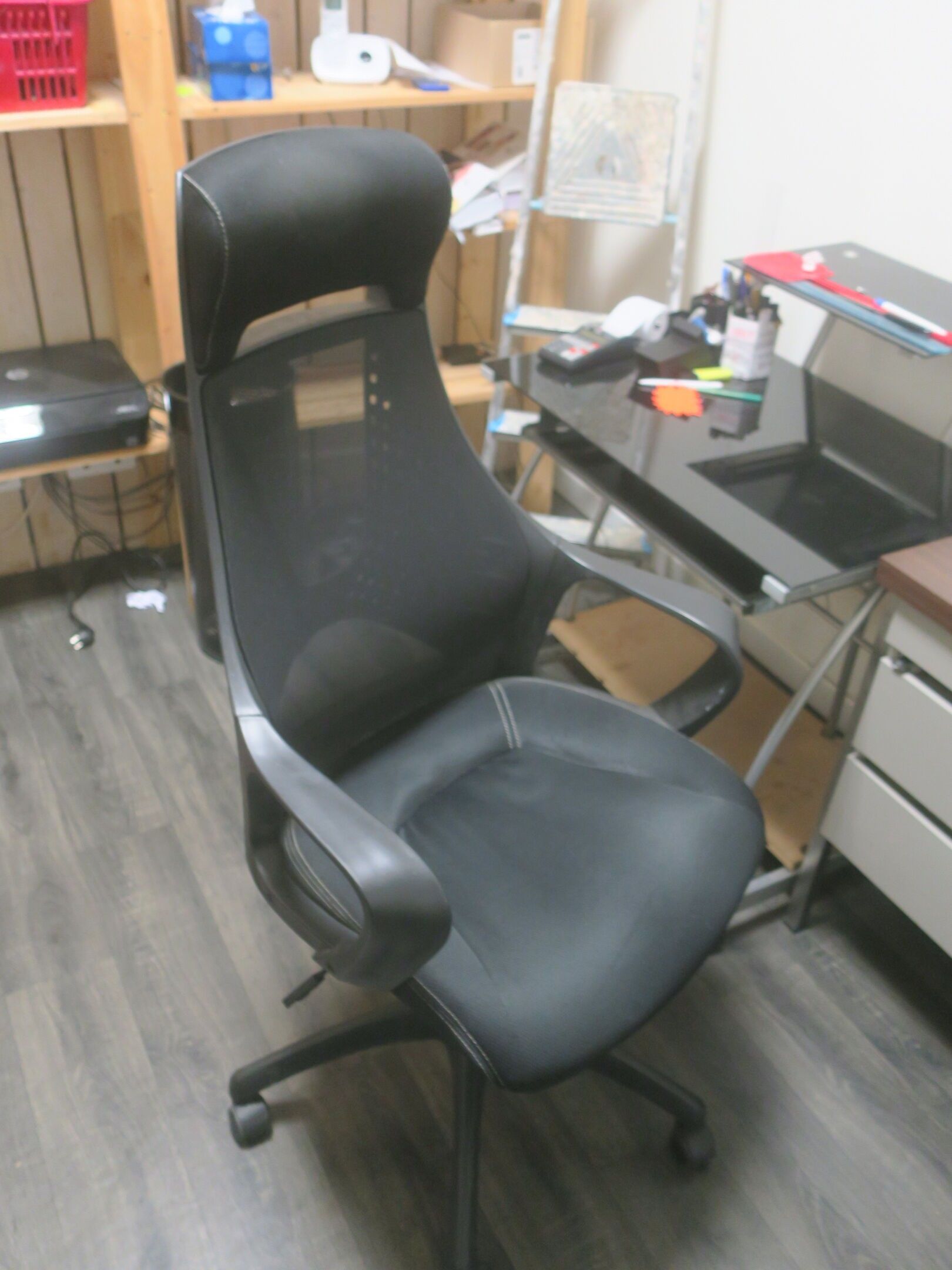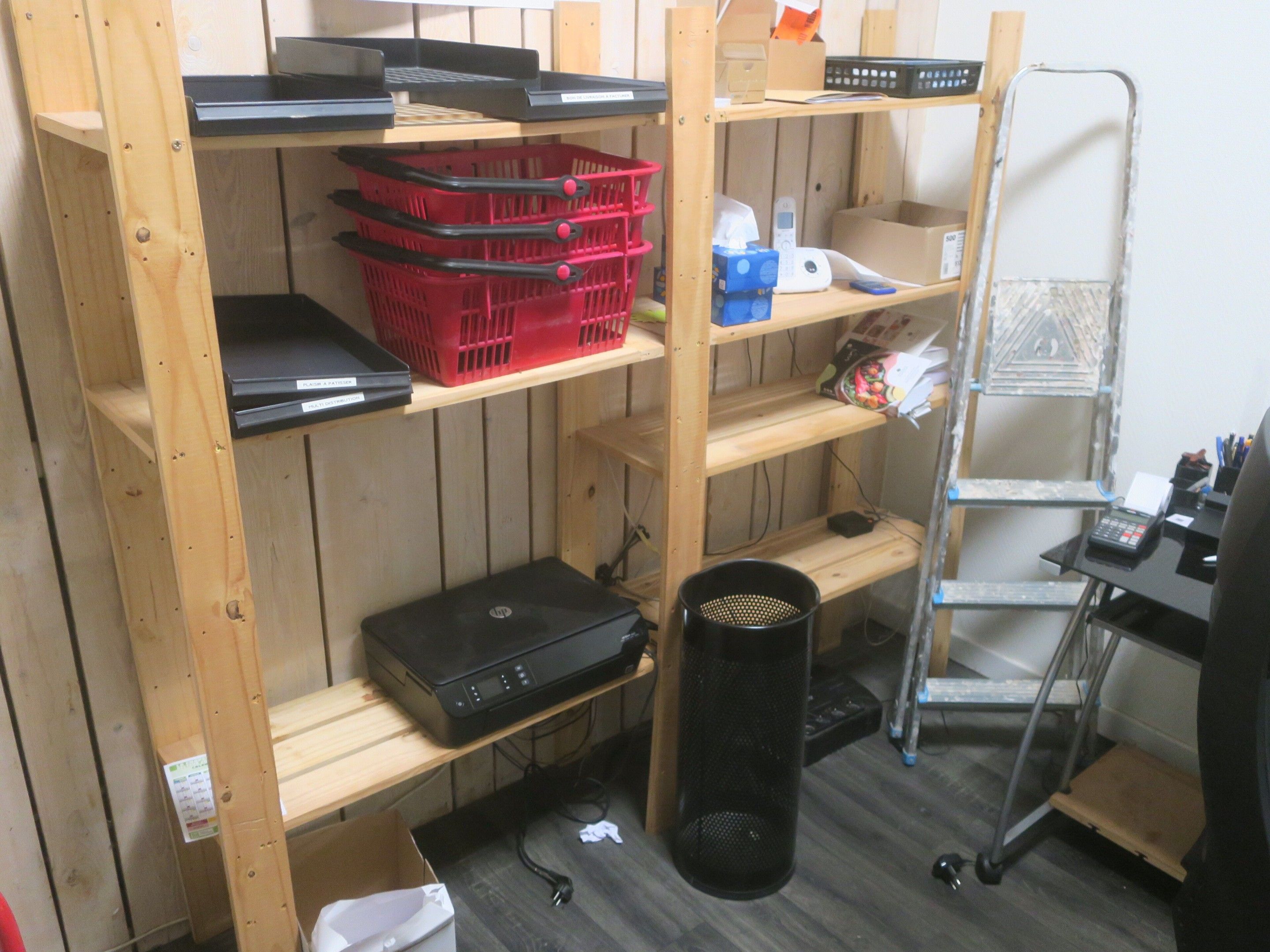 Executive armchair, 2 desks, 2 wooden shelves, "open" illumi…