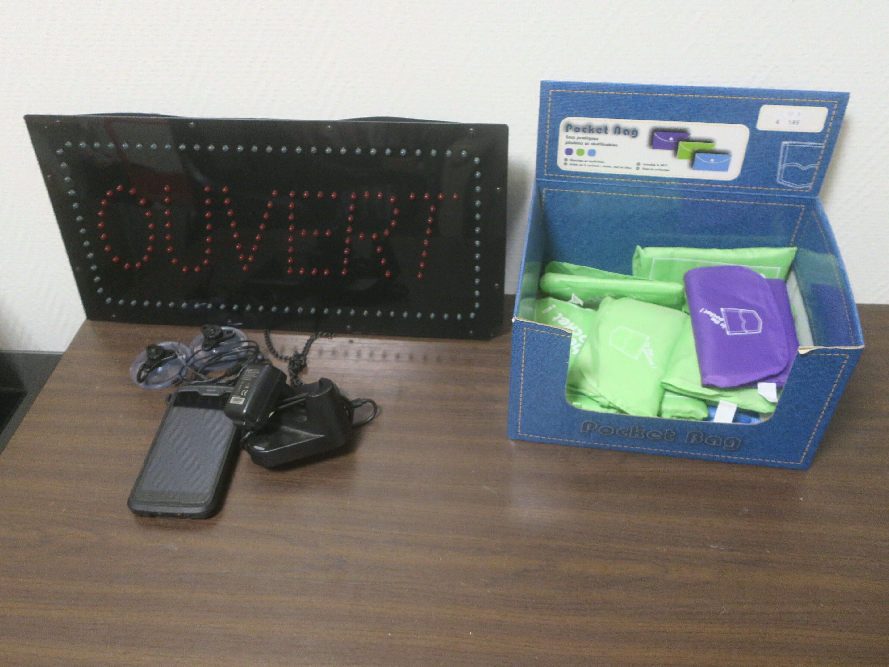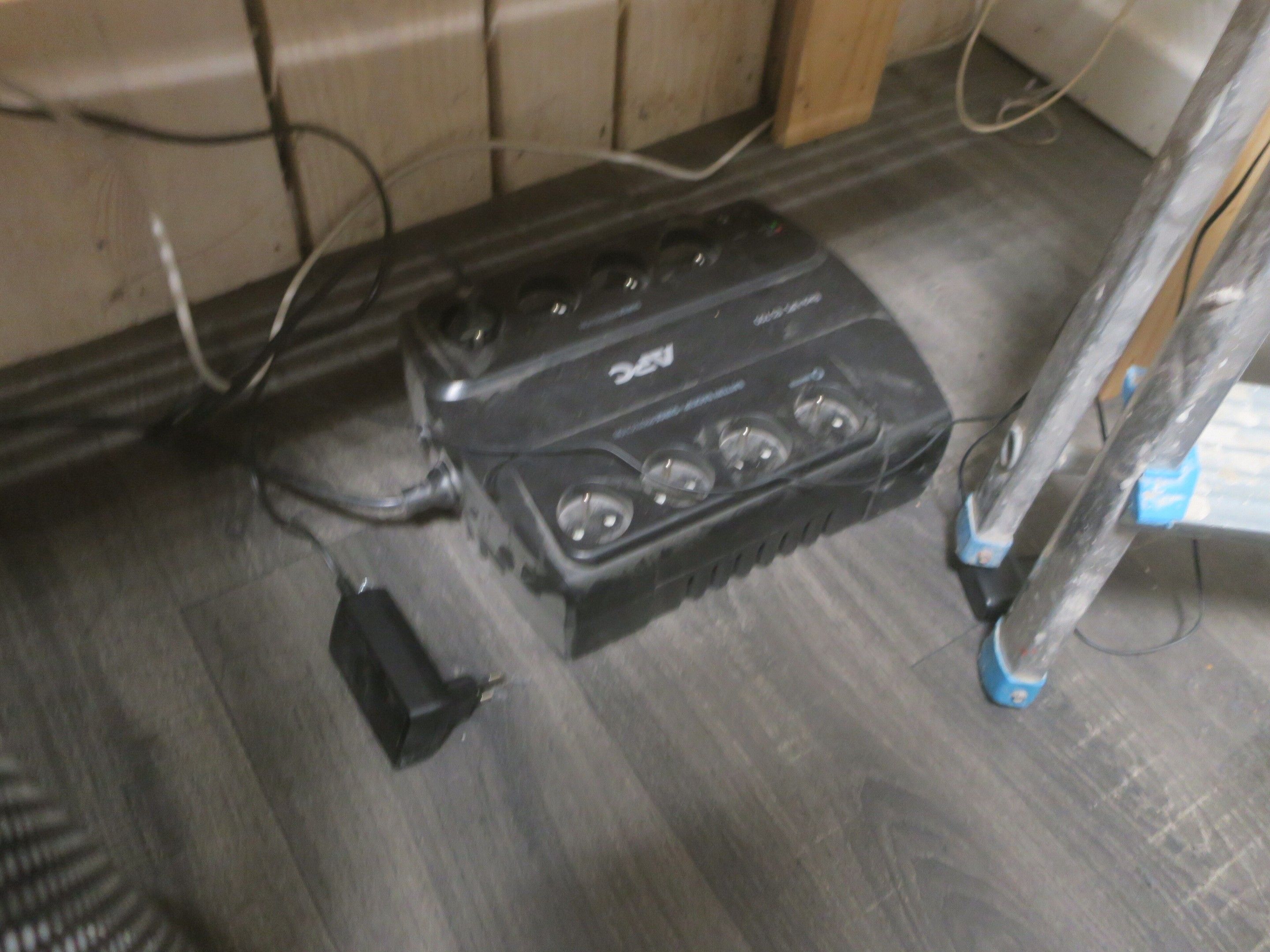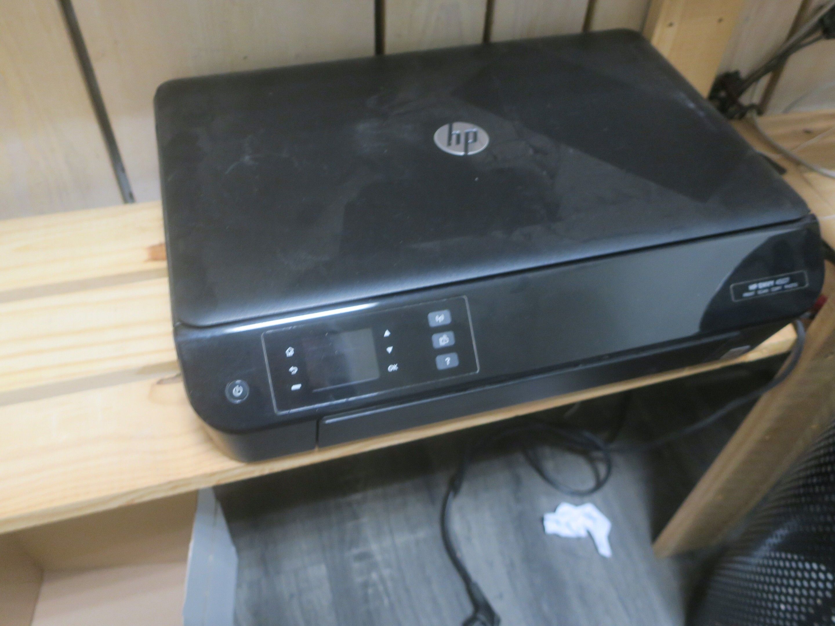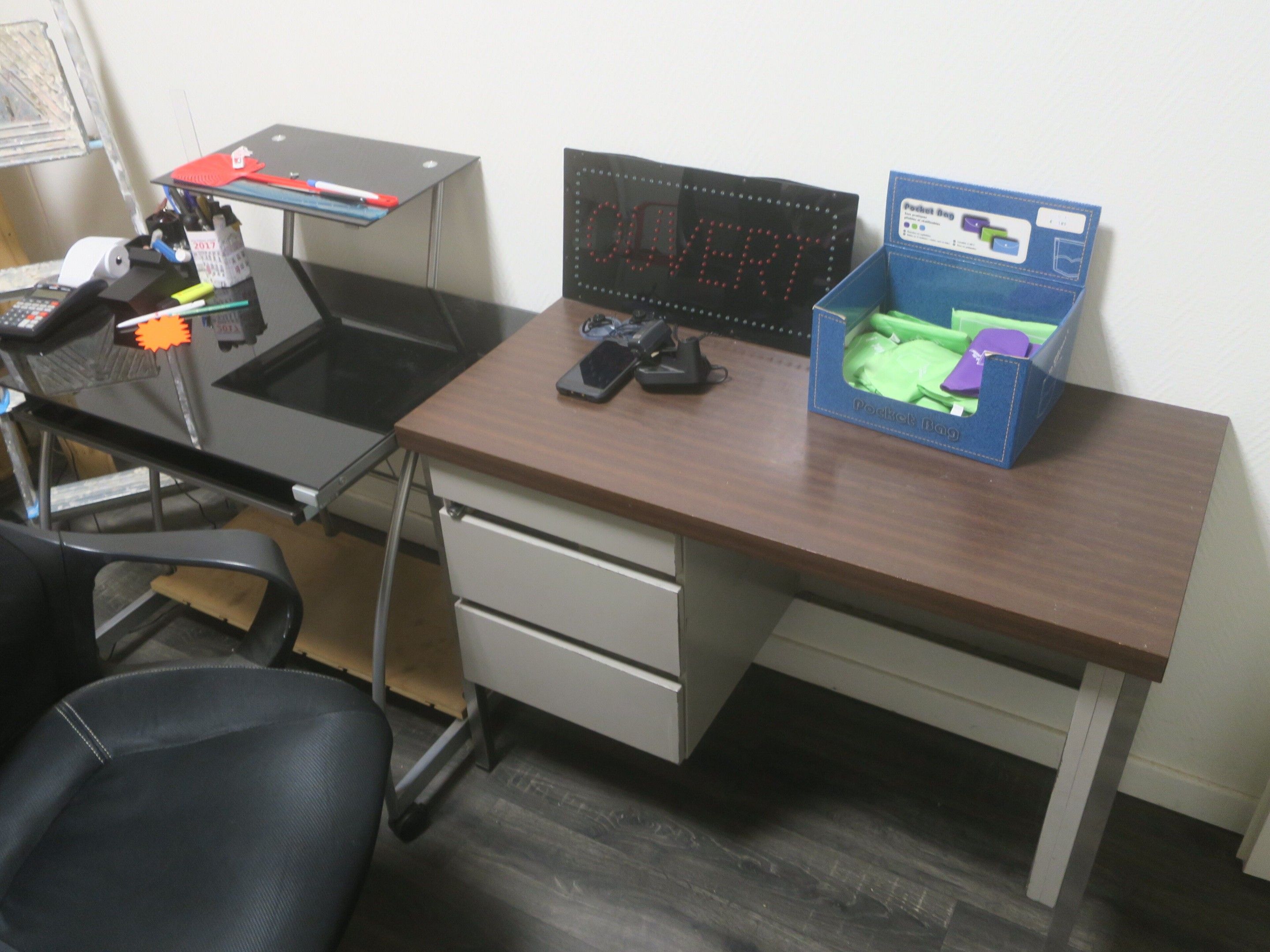 Executive armchair, 2 desks, 2 wooden shelves, "open" illuminated panel, pocket bags, Olivetti calculator, HP printer, APC UPS, telephone, office supplies, 3 shopping baskets, Judicial lot, Price at 30
