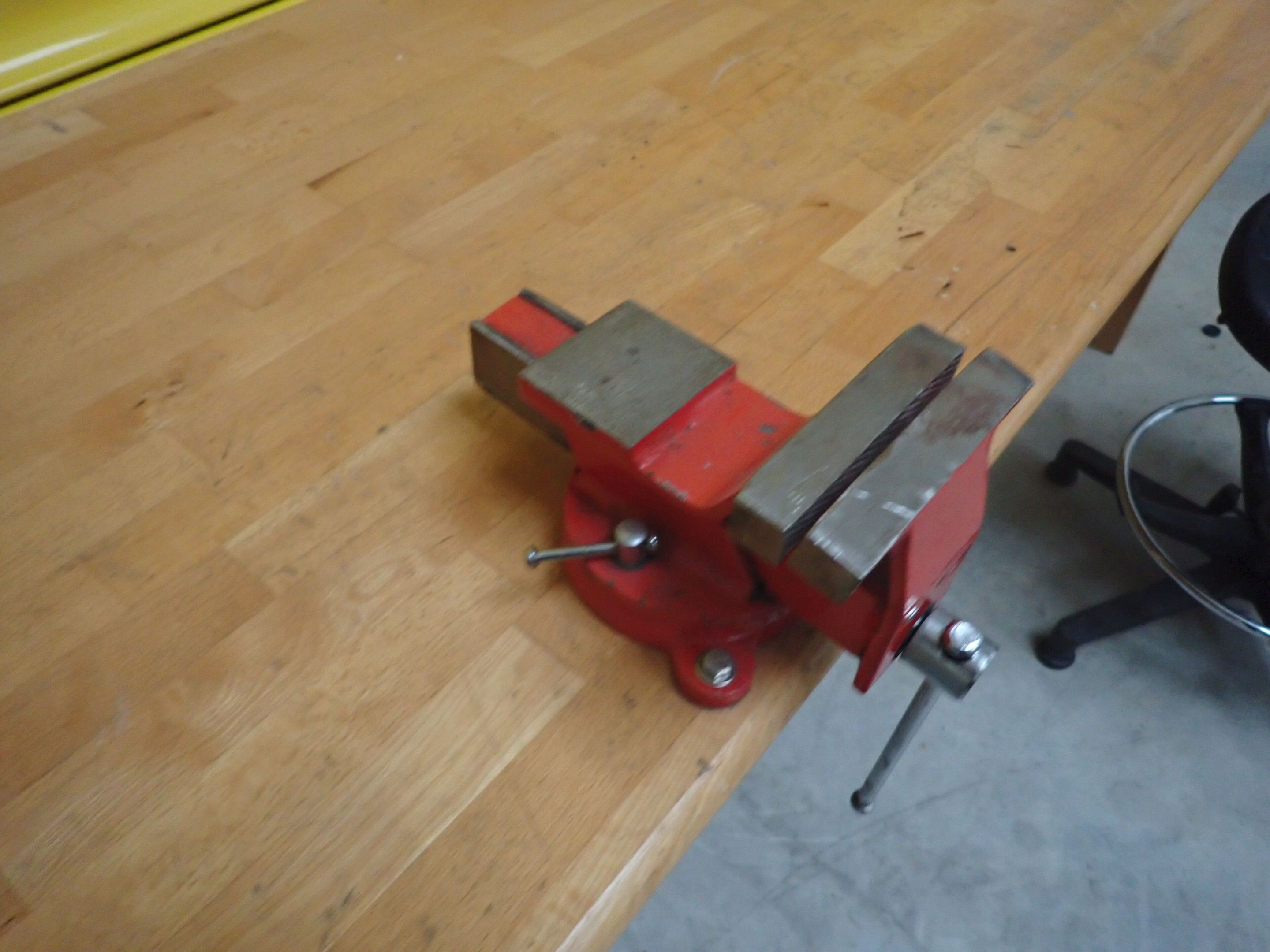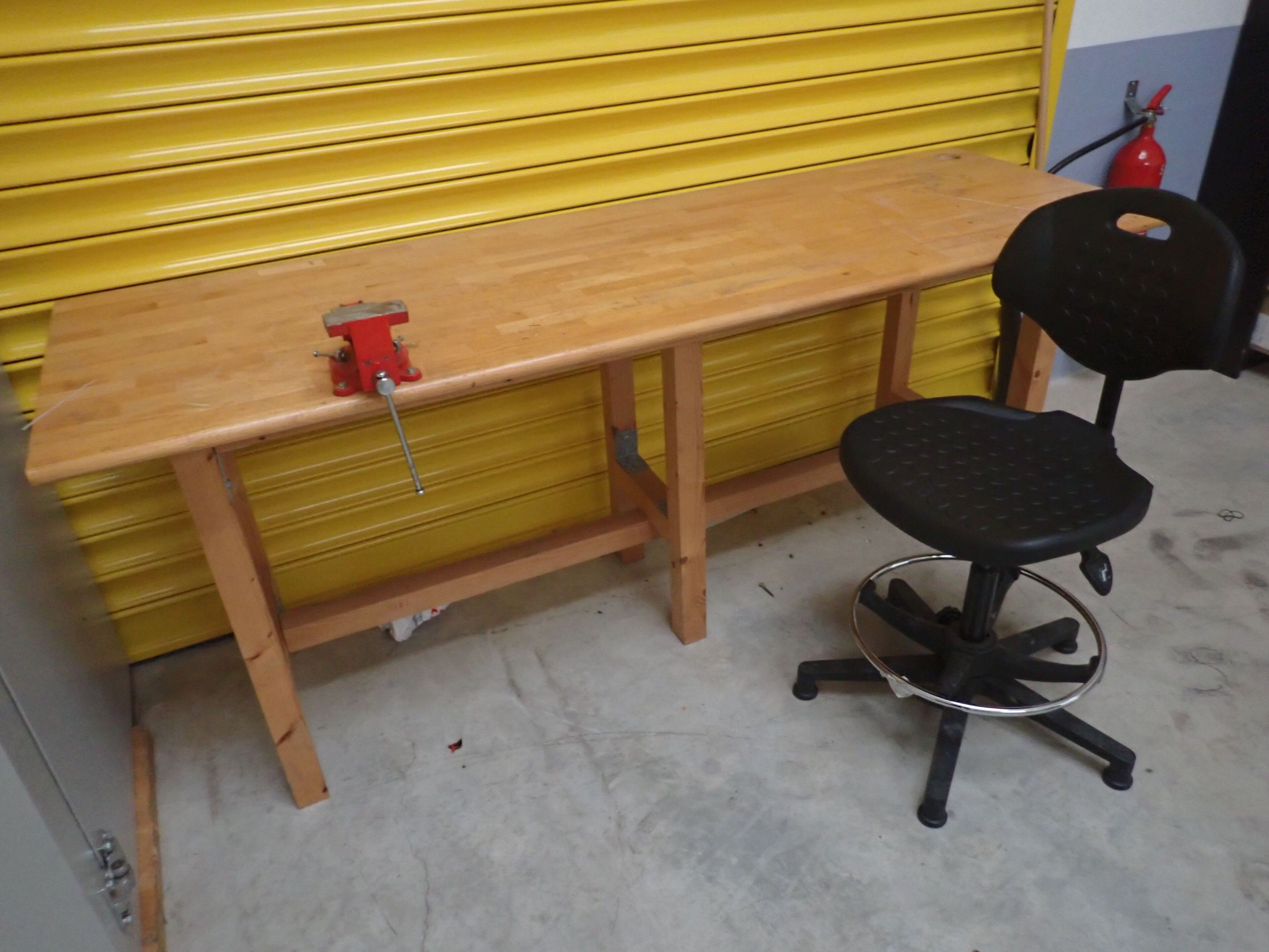 Wooden workbench with red vice 66x200, black high chair, jud…