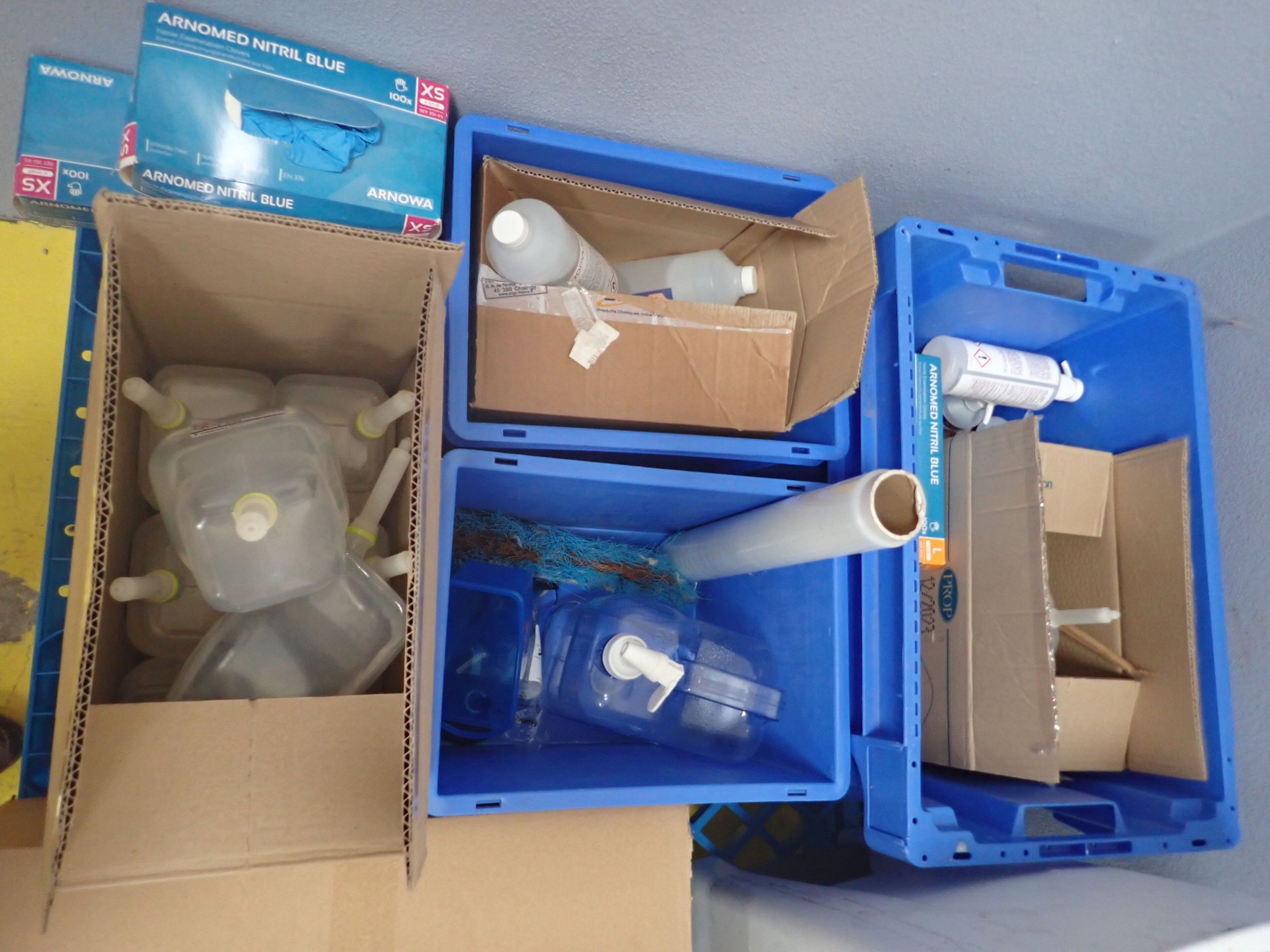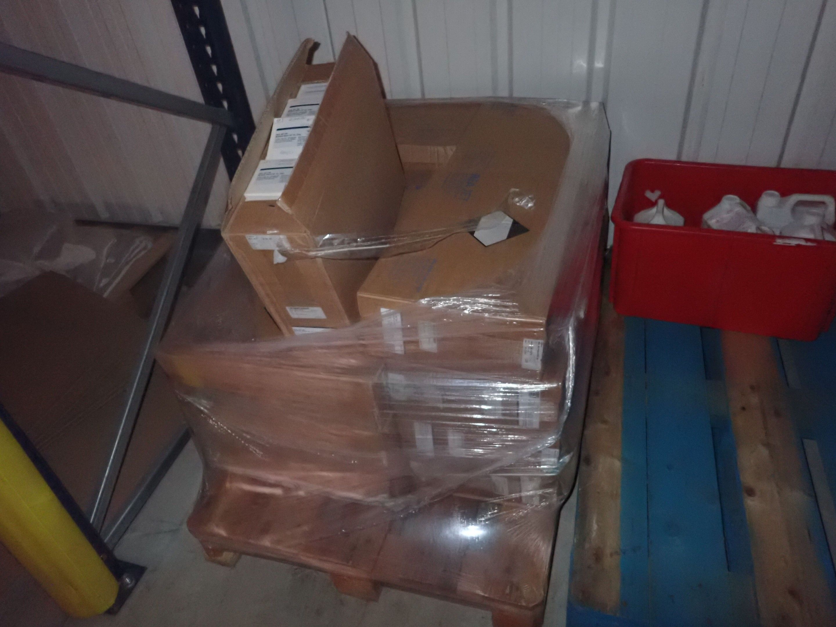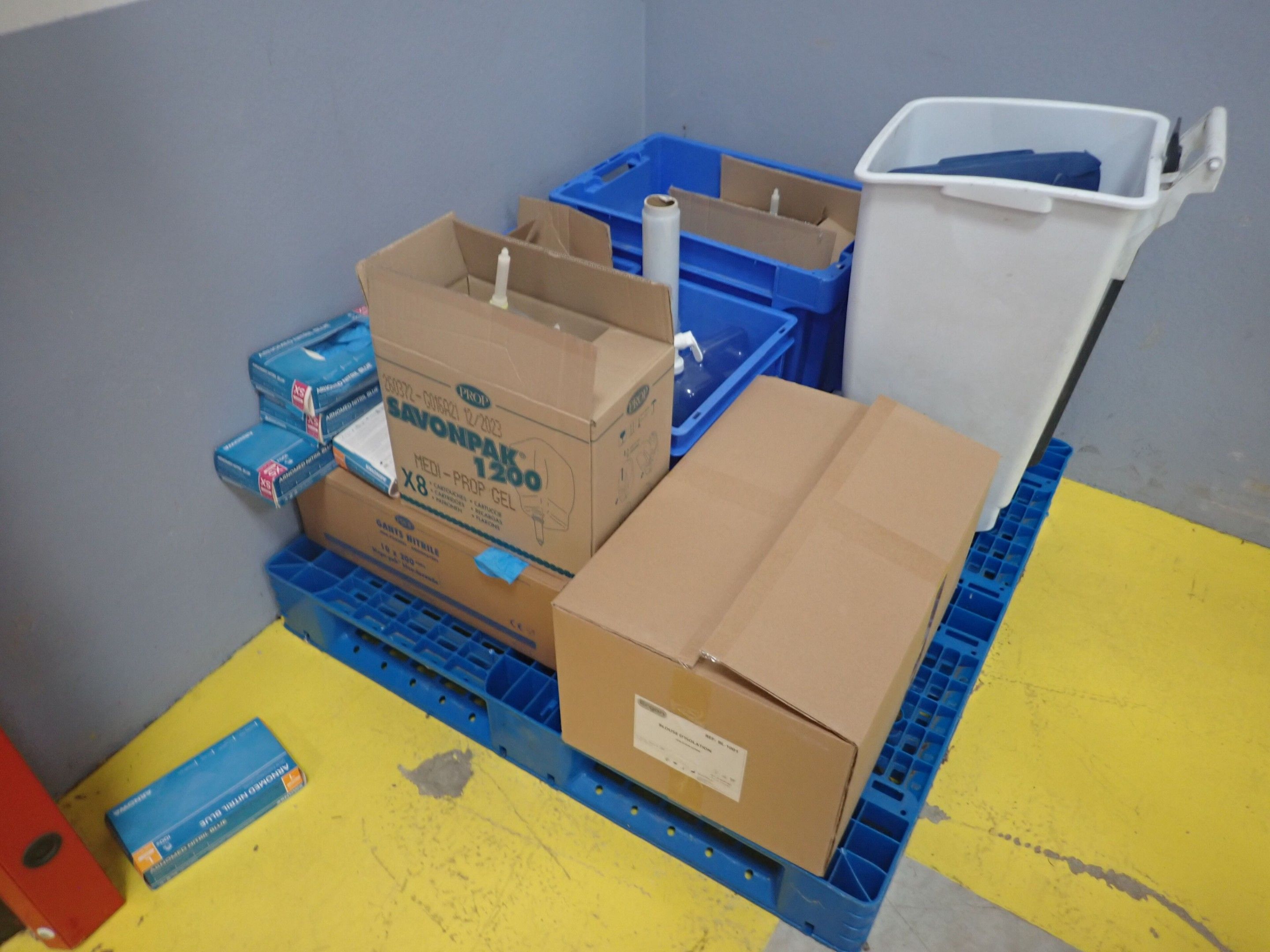 Batch 7 pallets of cartons, labels, cartridges, sachets, gloves, masks, hydroalcoholic gel, forensic batch, Price 50