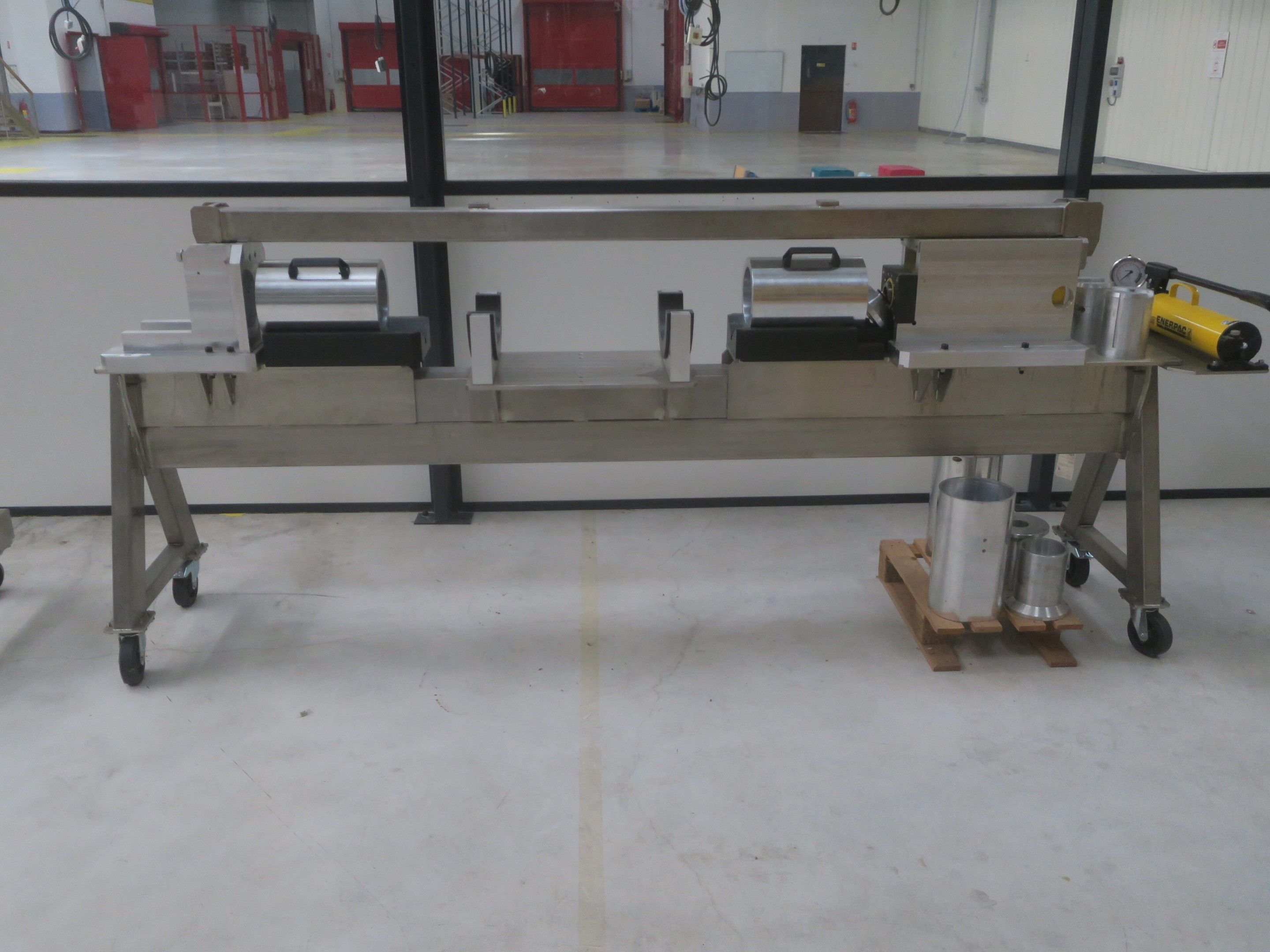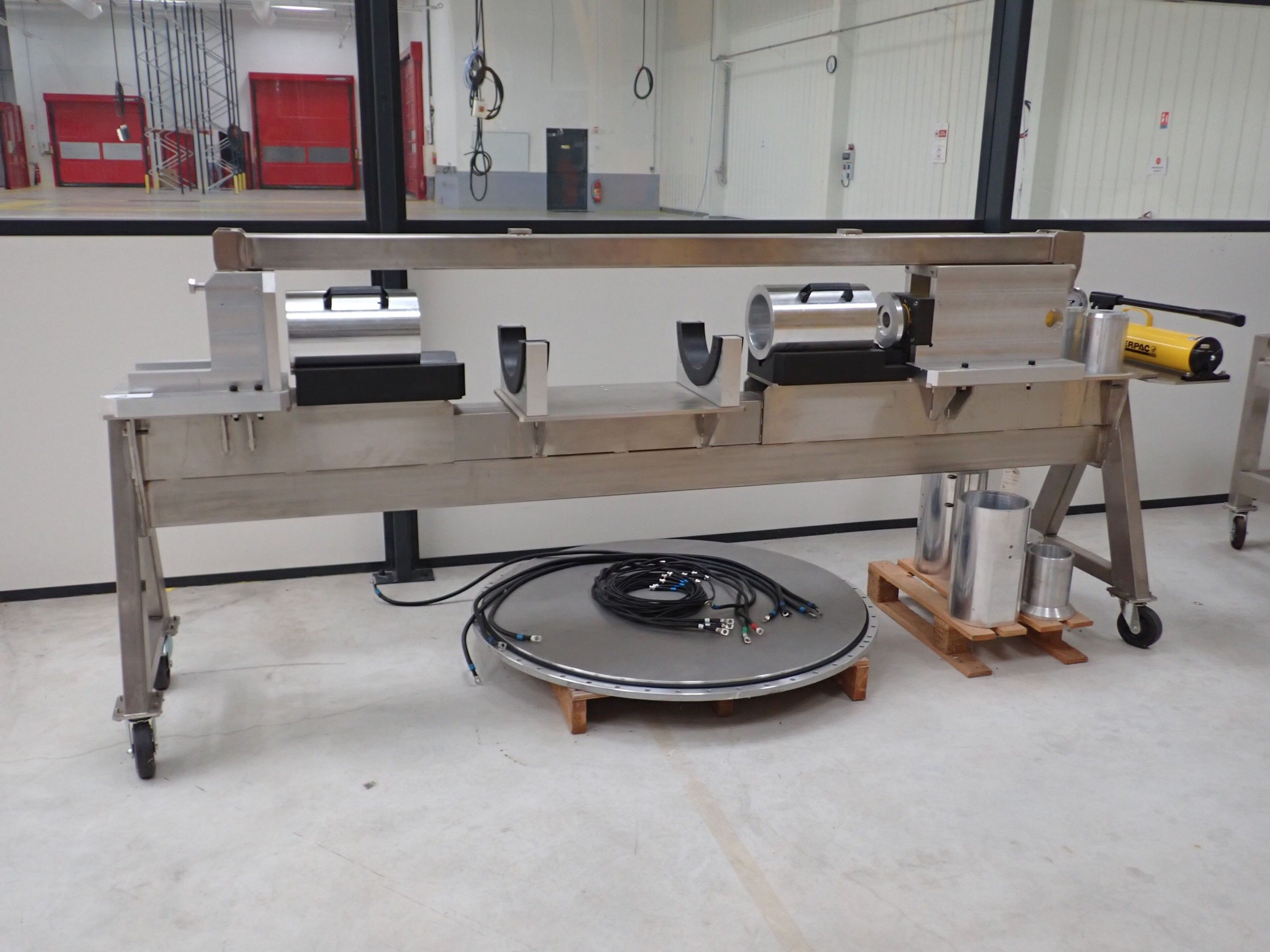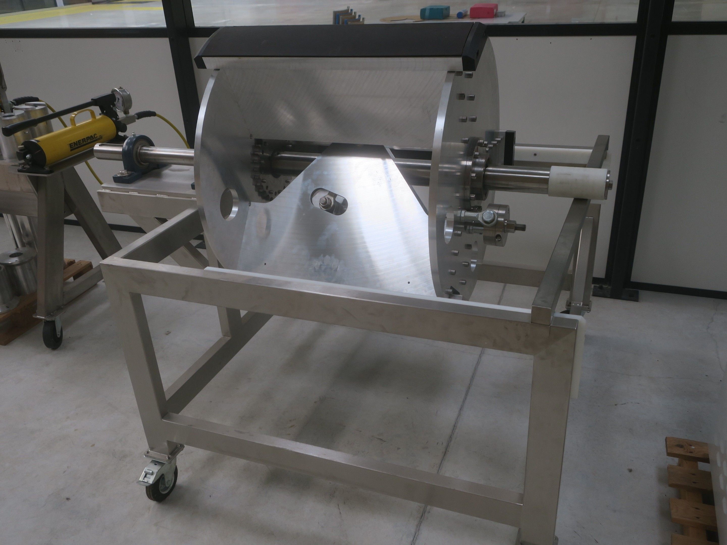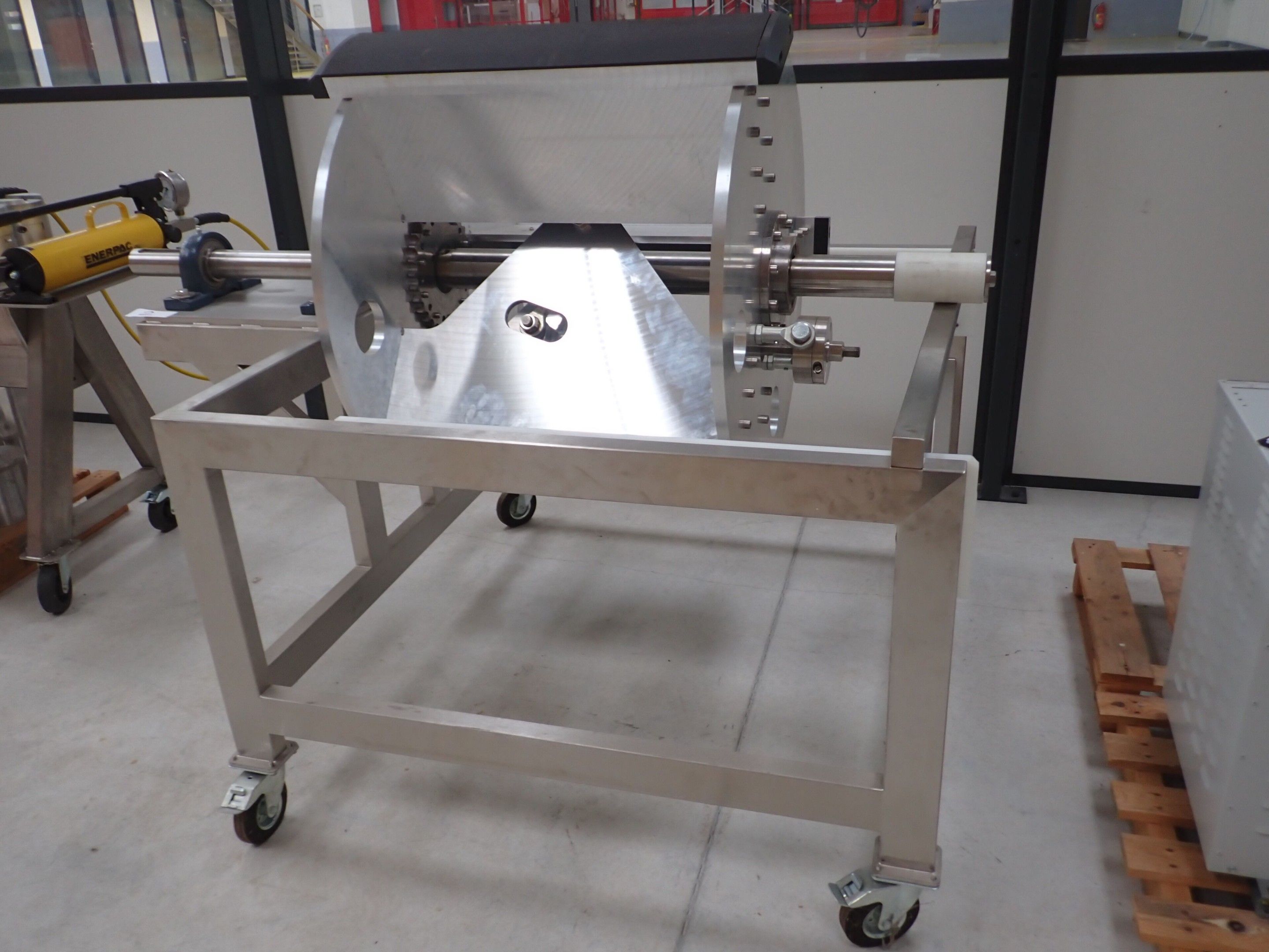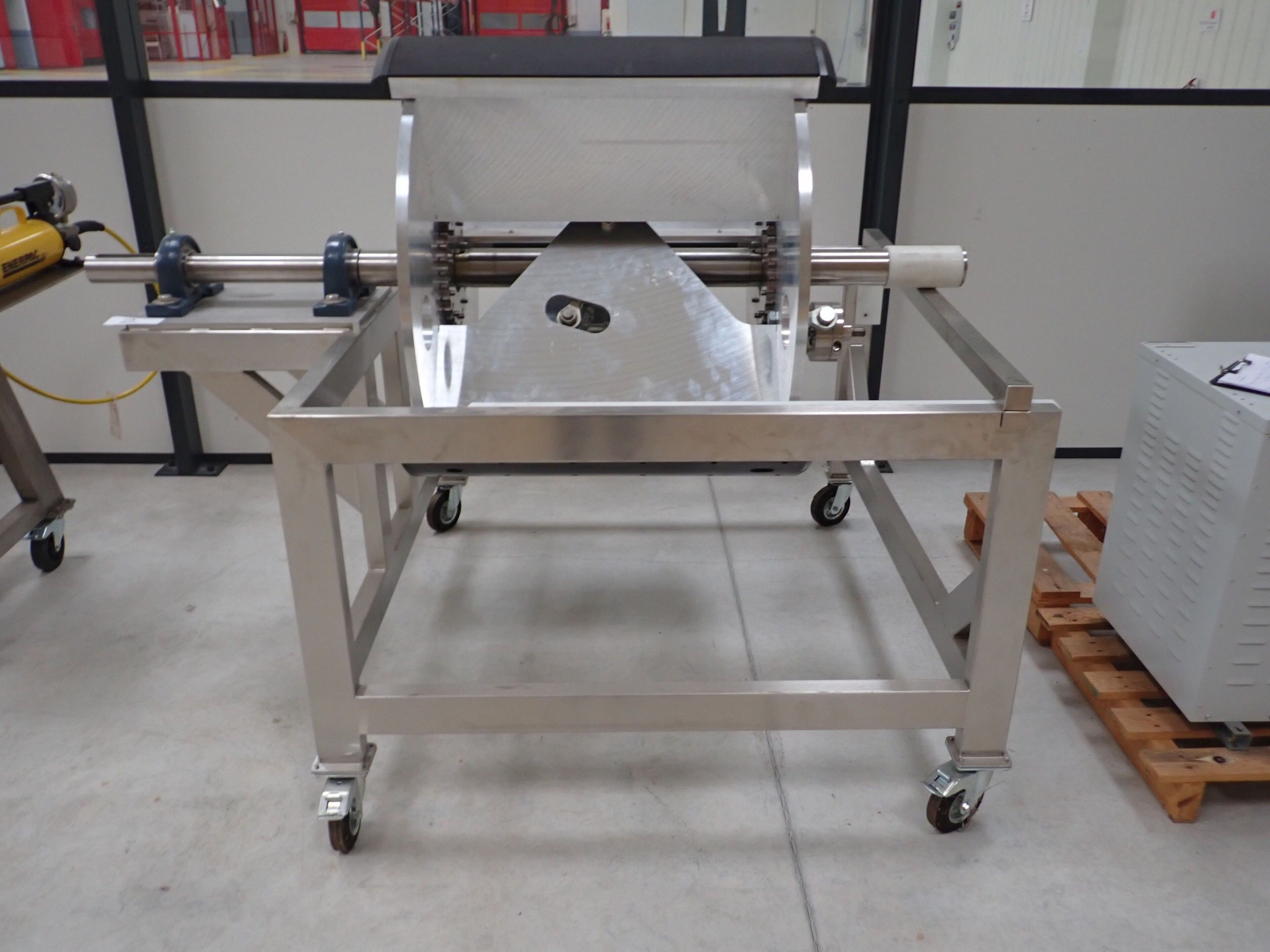 Horizontal mobile hydraulic press ENERPAC Ultima P80 manual with accessories, passage 161cm; mobile stainless steel winder on stainless steel base 178x130xh134, diameter 90, axle 178; mobile stainless steel trolley with reel holder 145x74xh82; trolley with feed table with 4 bearings for stainless steel reels 13x87xh83, mobile stainless steel feed table for winder; accessories, legal lot, Price 300