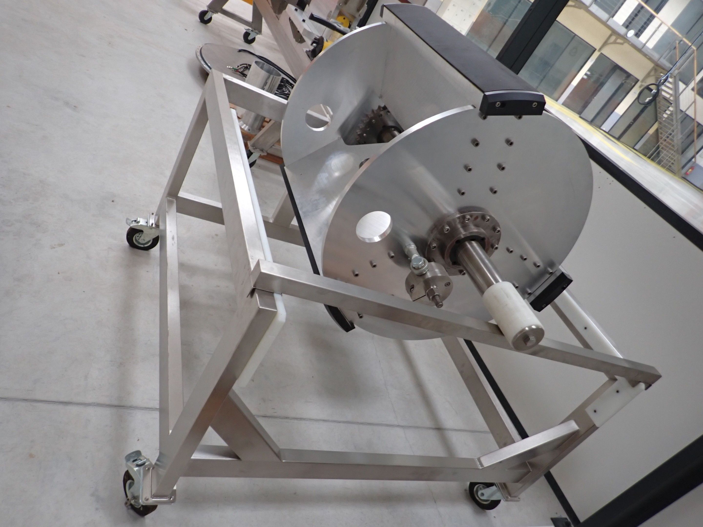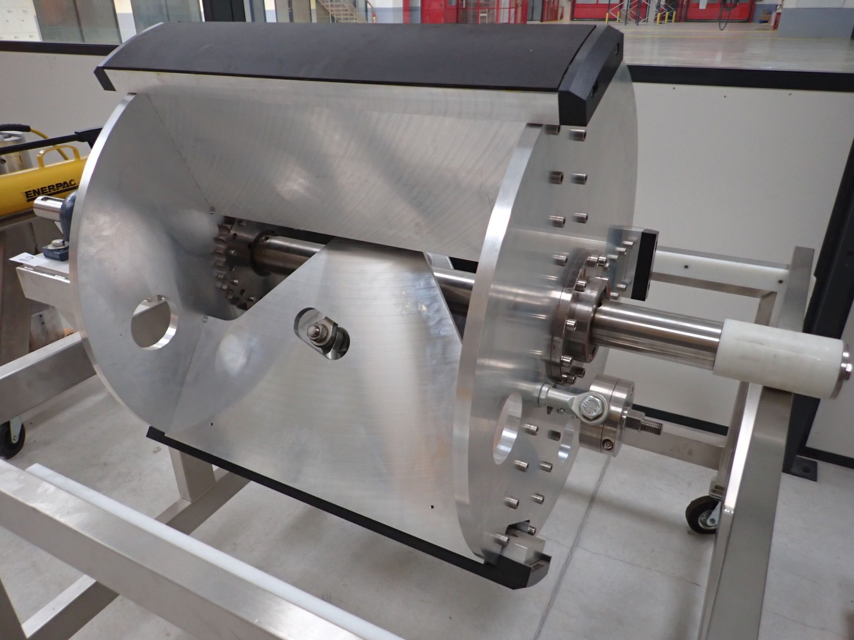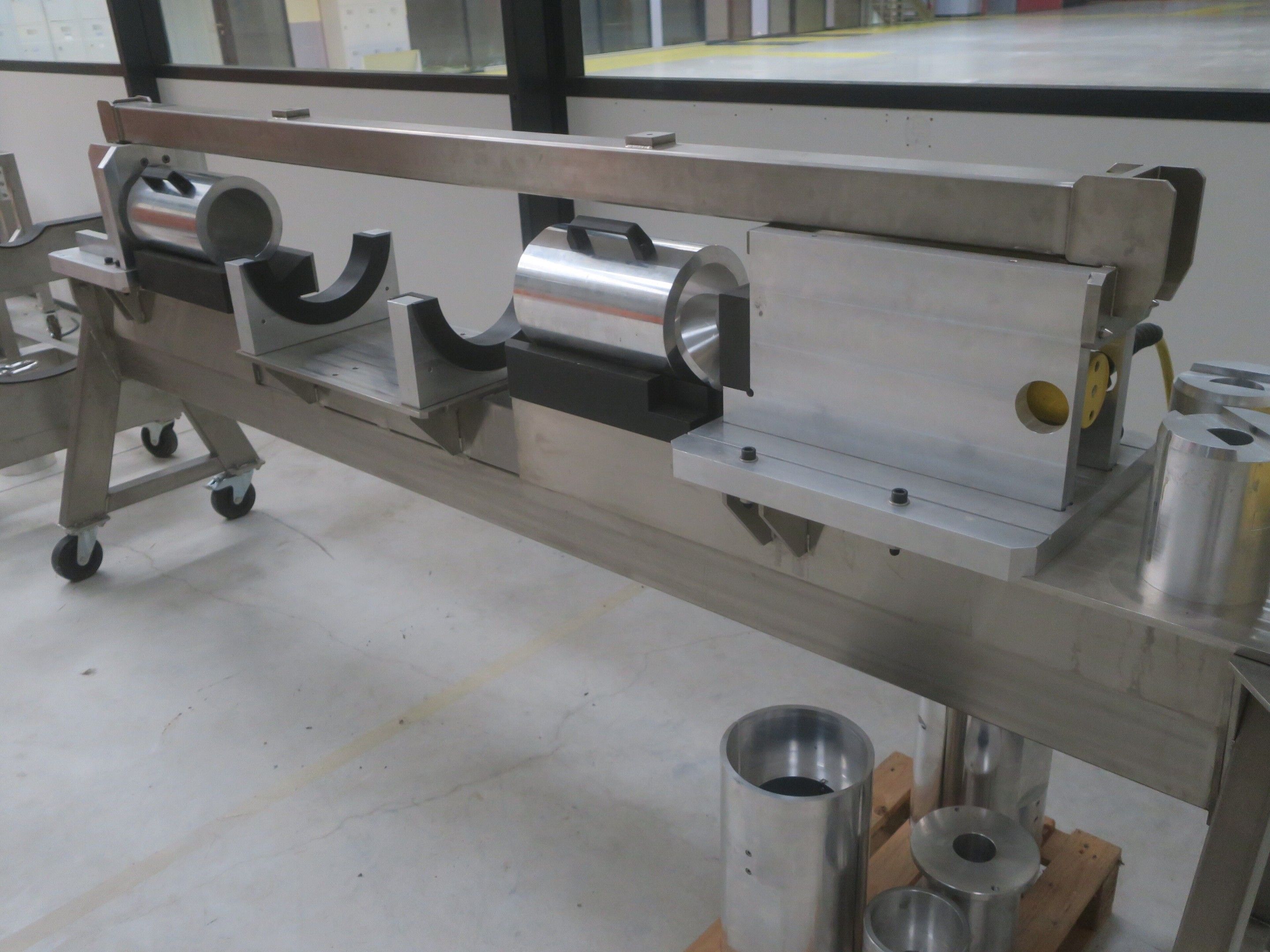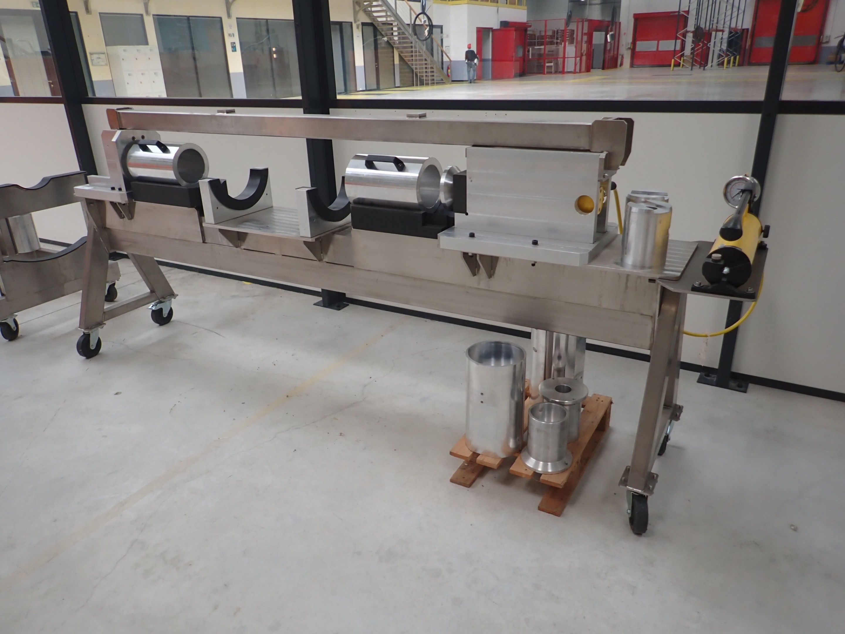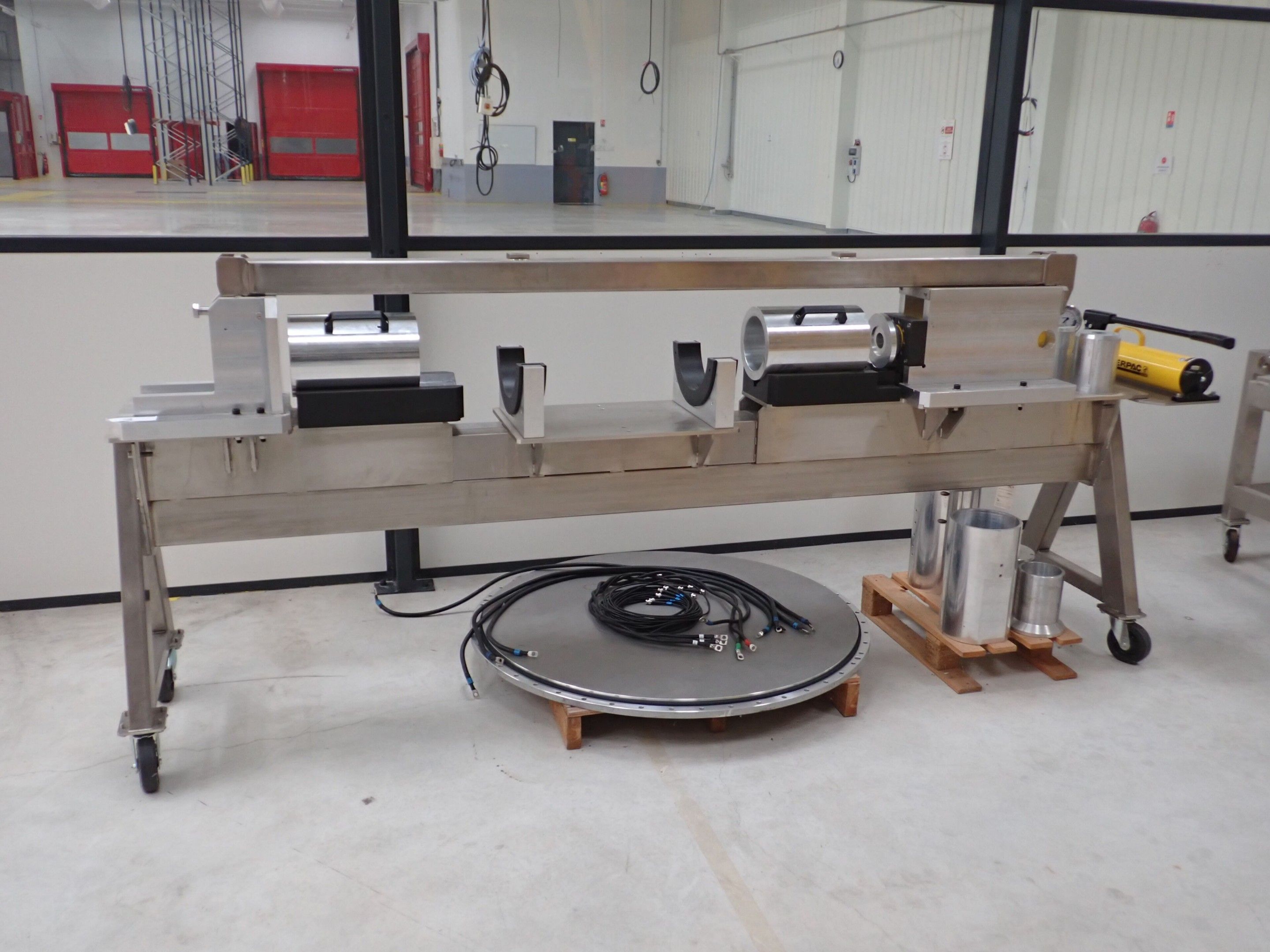 Horizontal mobile hydraulic press ENERPAC Ultima P80 manual with accessories, passage 161cm; mobile stainless steel winder on stainless steel base 178x130xh134, diameter 90, axle 178; mobile stainless steel trolley with reel holder 145x74xh82; trolley with feed table with 4 bearings for stainless steel reels 13x87xh83, mobile stainless steel feed table for winder; accessories, legal lot, Price 300