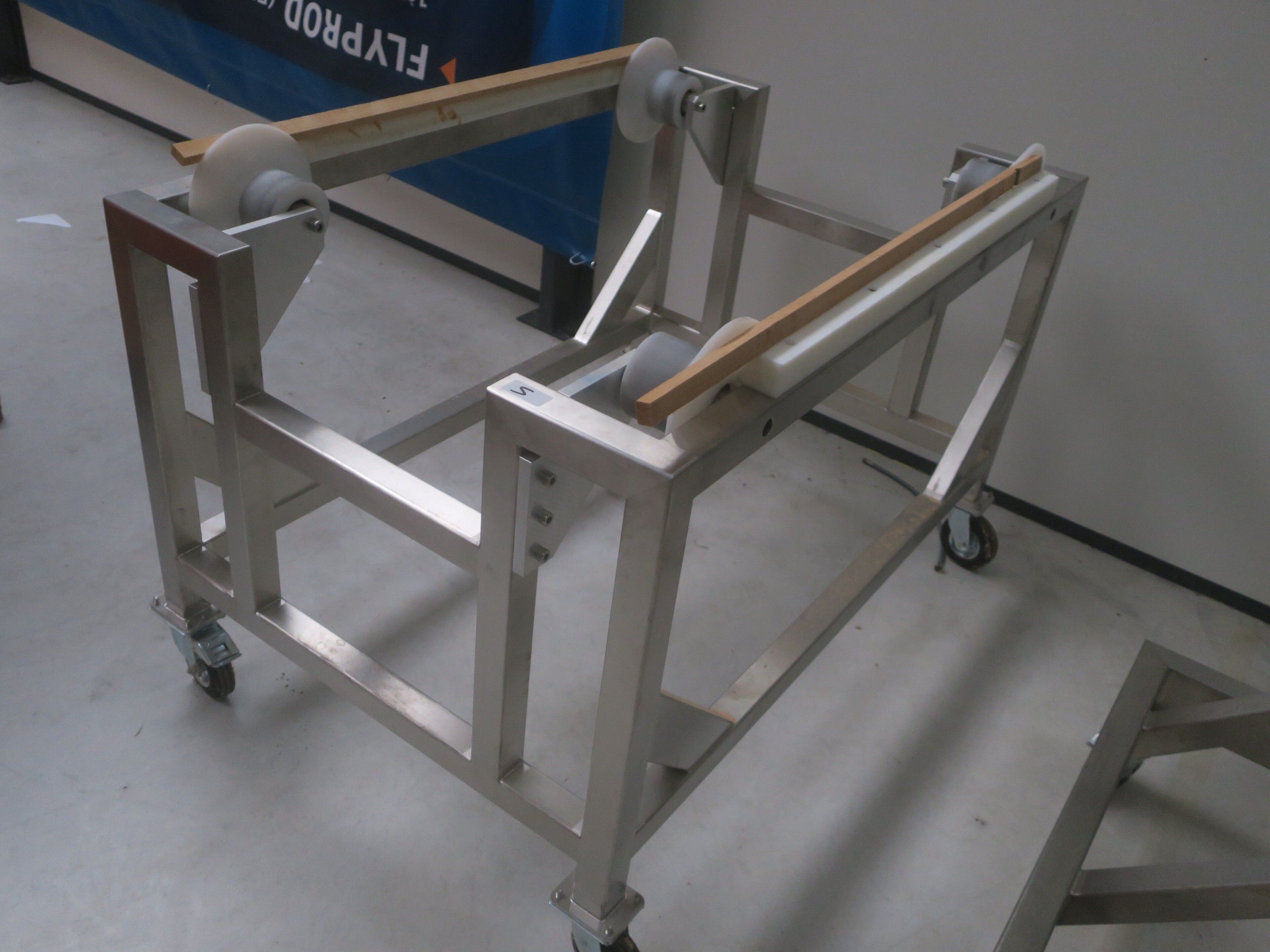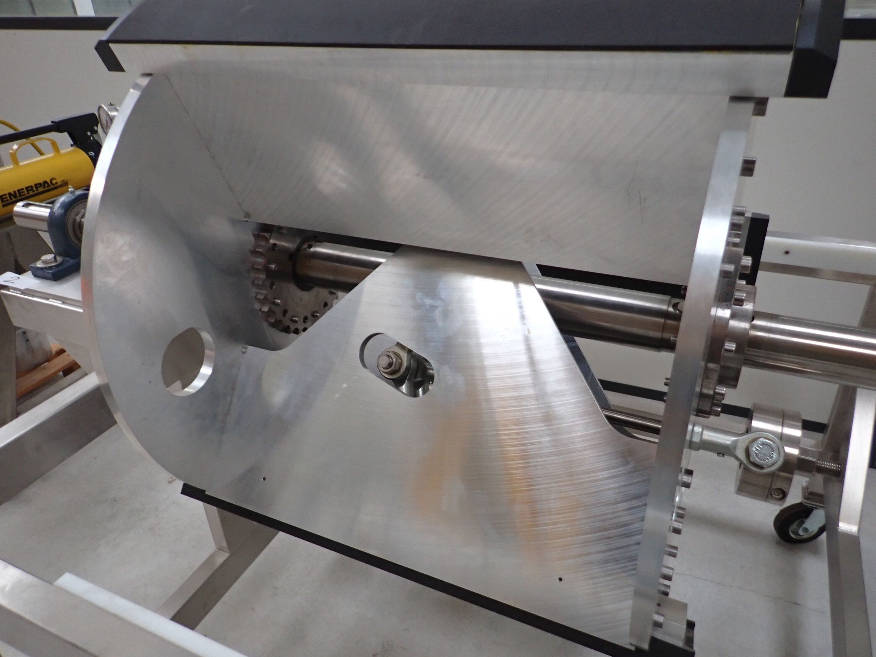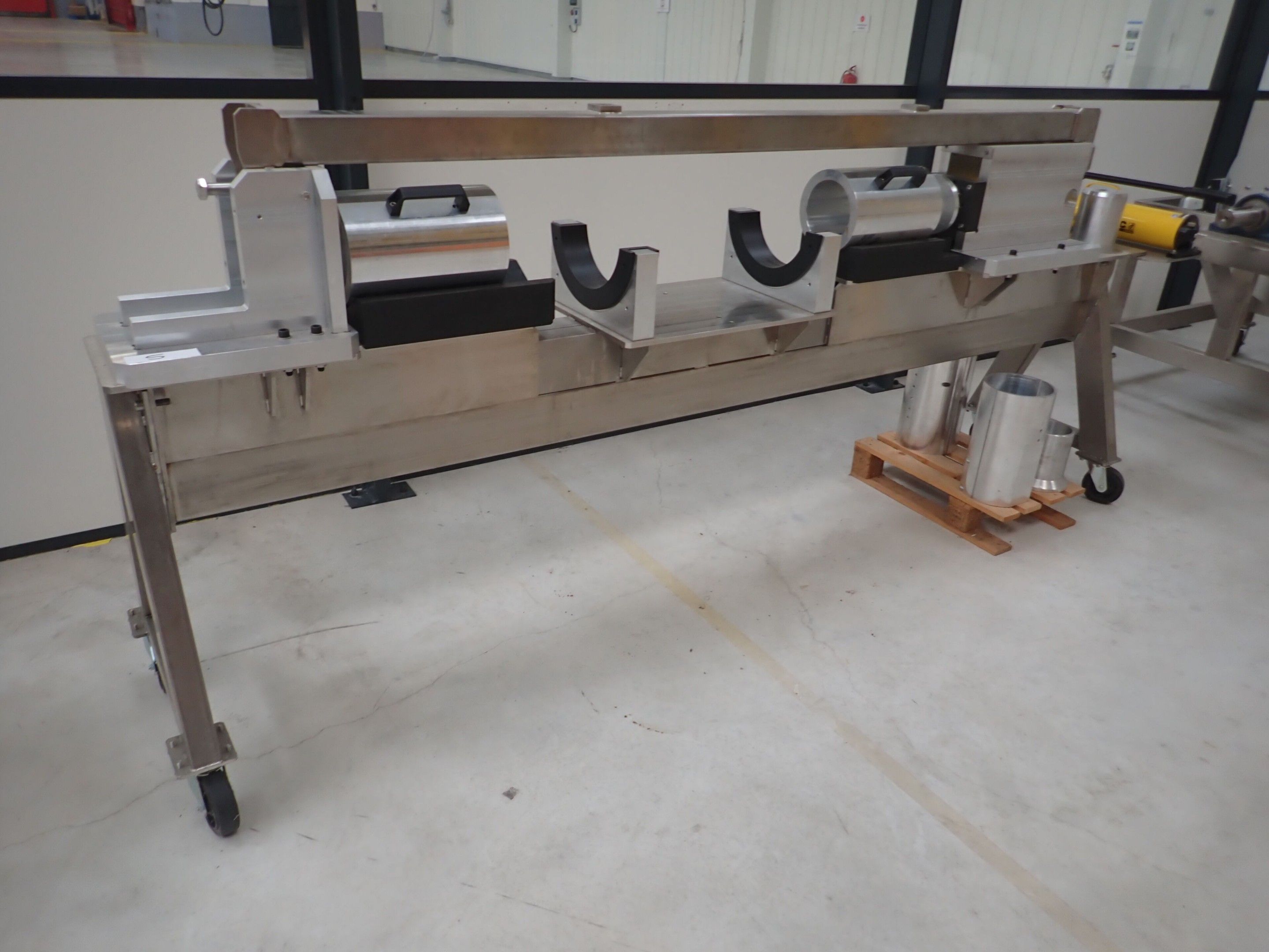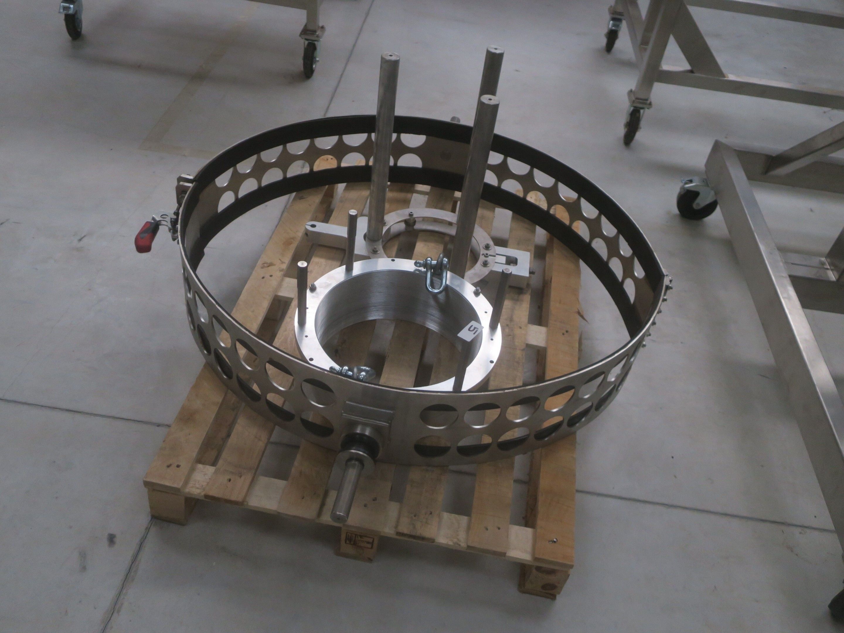Horizontal mobile hydraulic press ENERPAC Ultima P80 manual with accessories, passage 161cm; mobile stainless steel winder on stainless steel base 178x130xh134, diameter 90, axle 178; mobile stainless steel trolley with reel holder 145x74xh82; trolley with feed table with 4 bearings for stainless steel reels 13x87xh83, mobile stainless steel feed table for winder; accessories, legal lot, Price 300