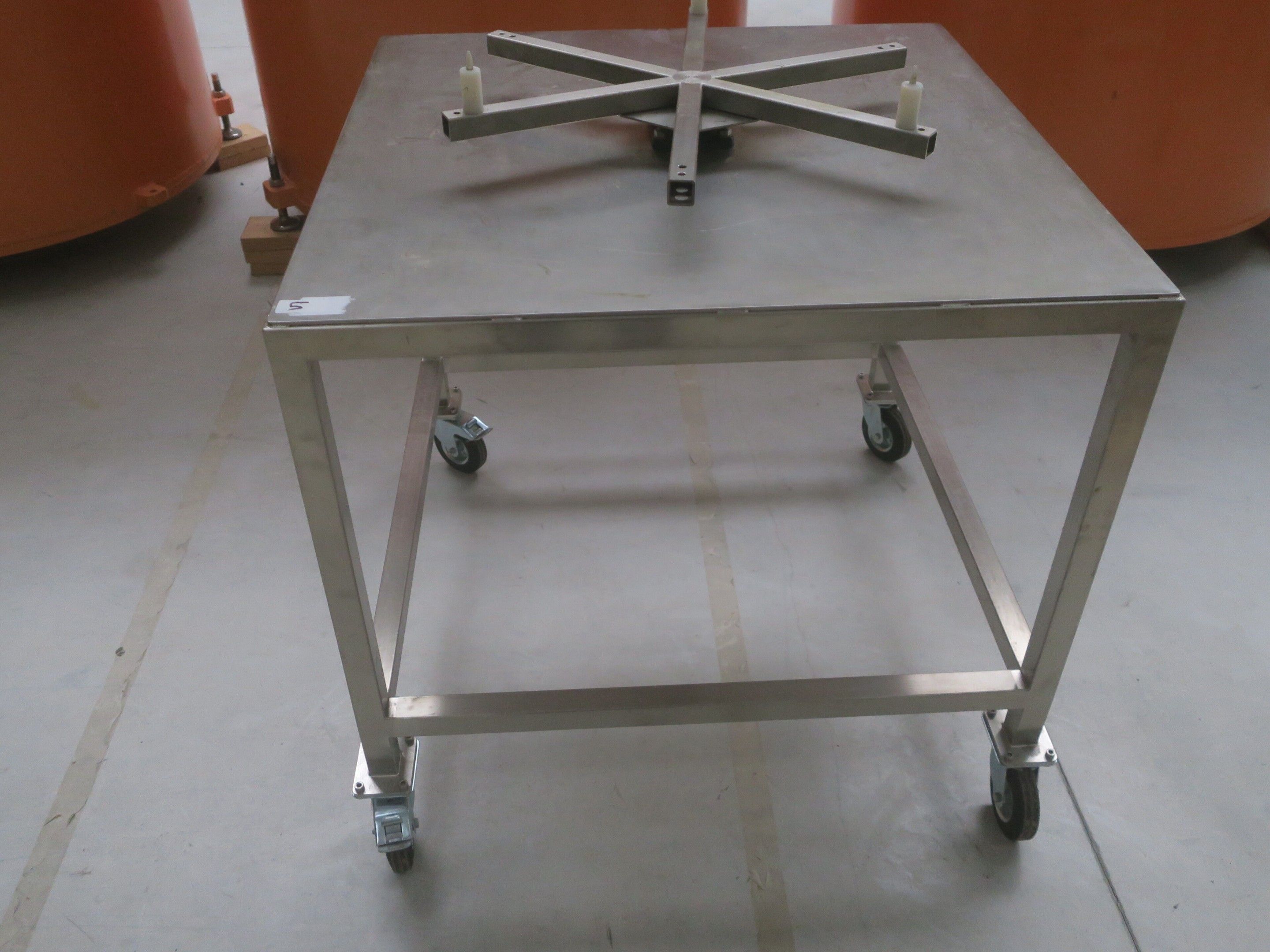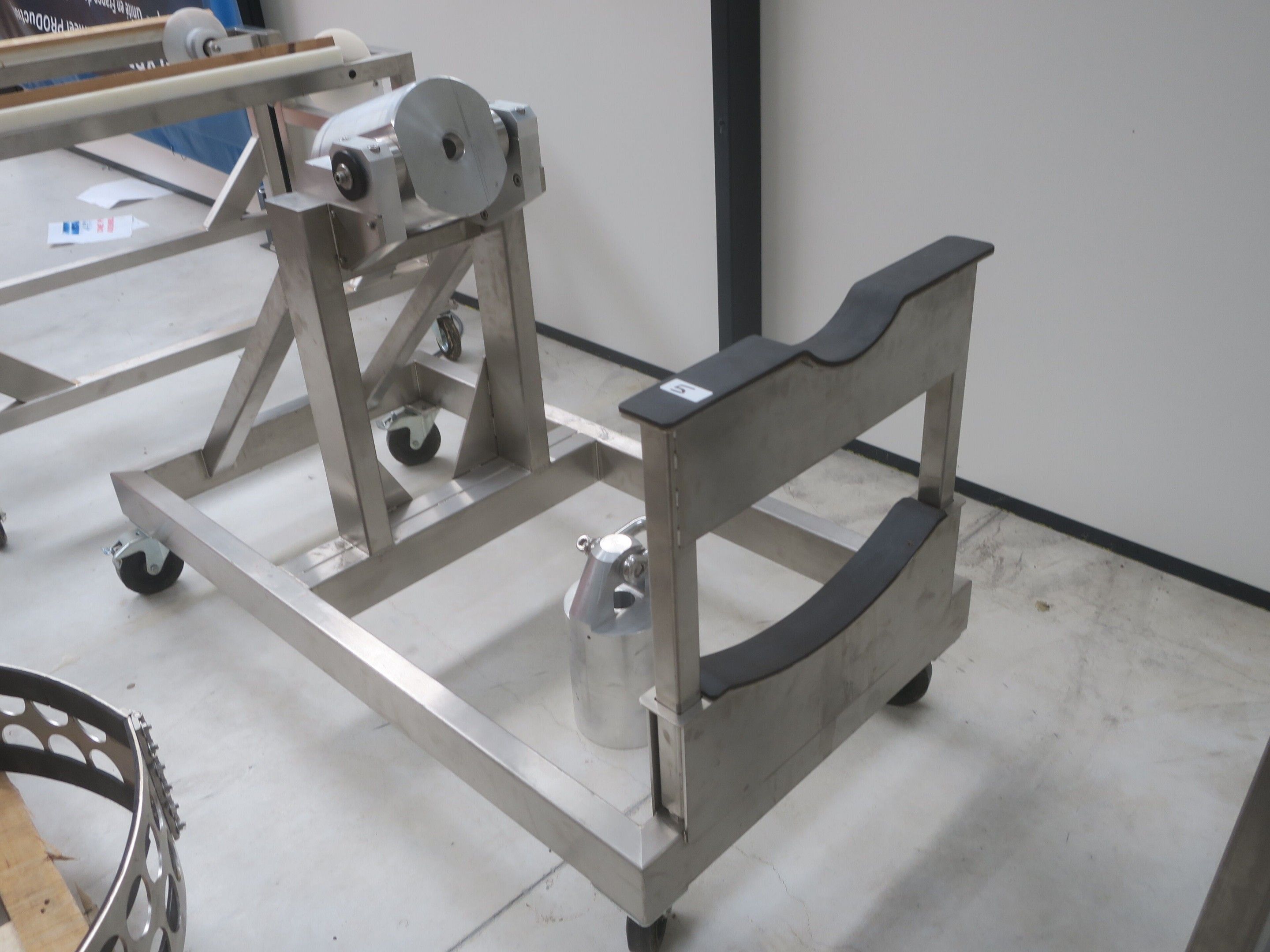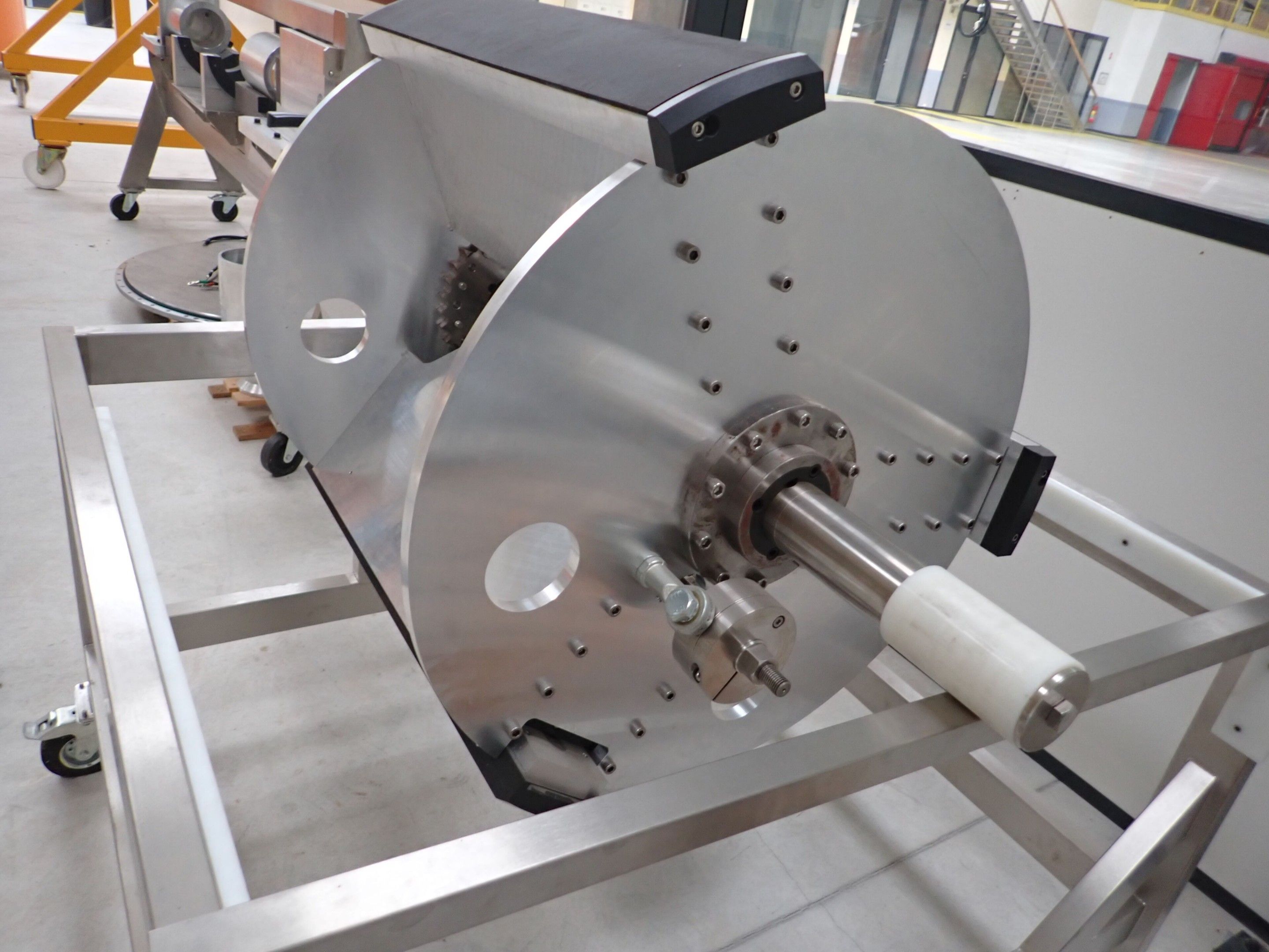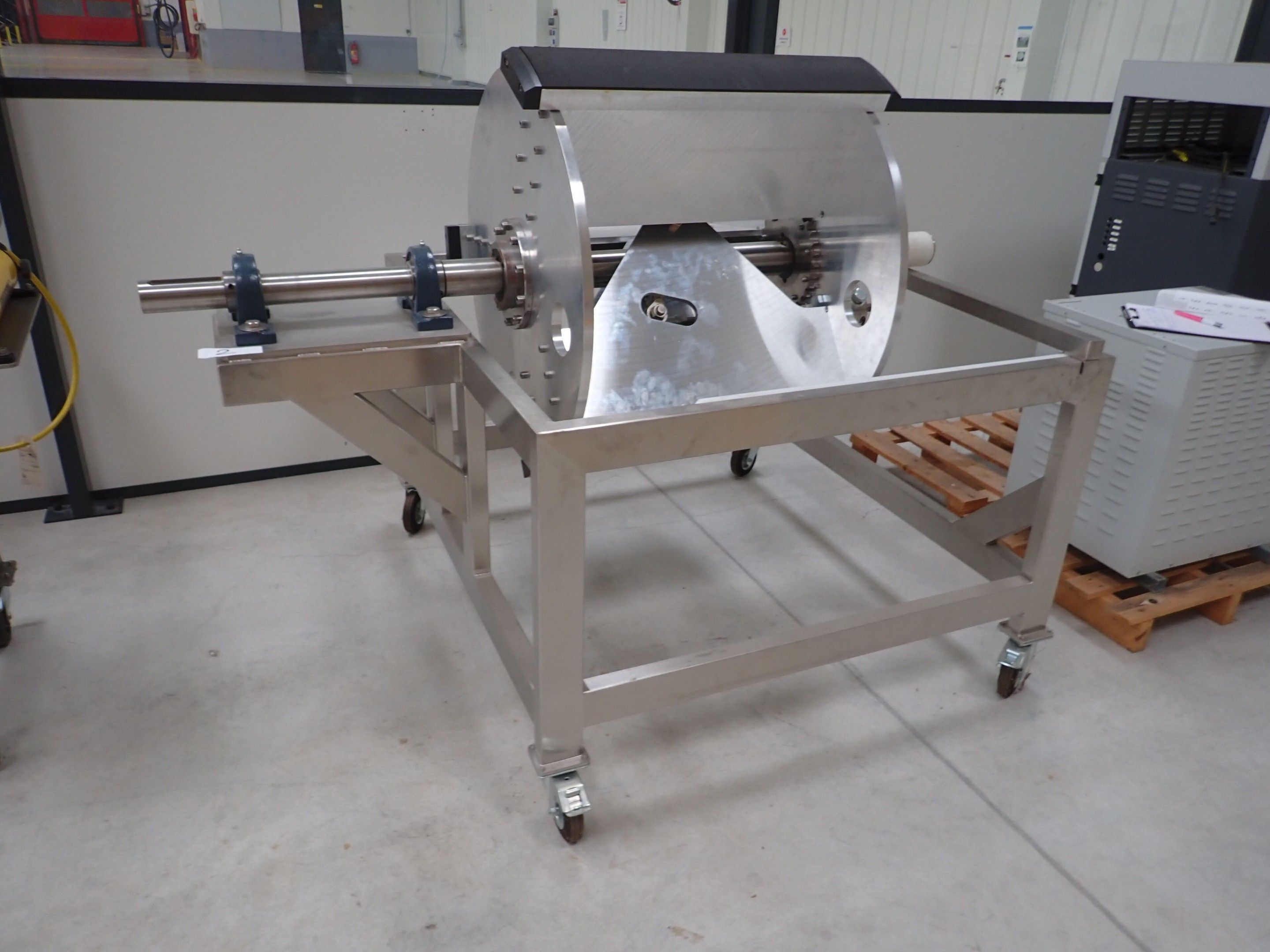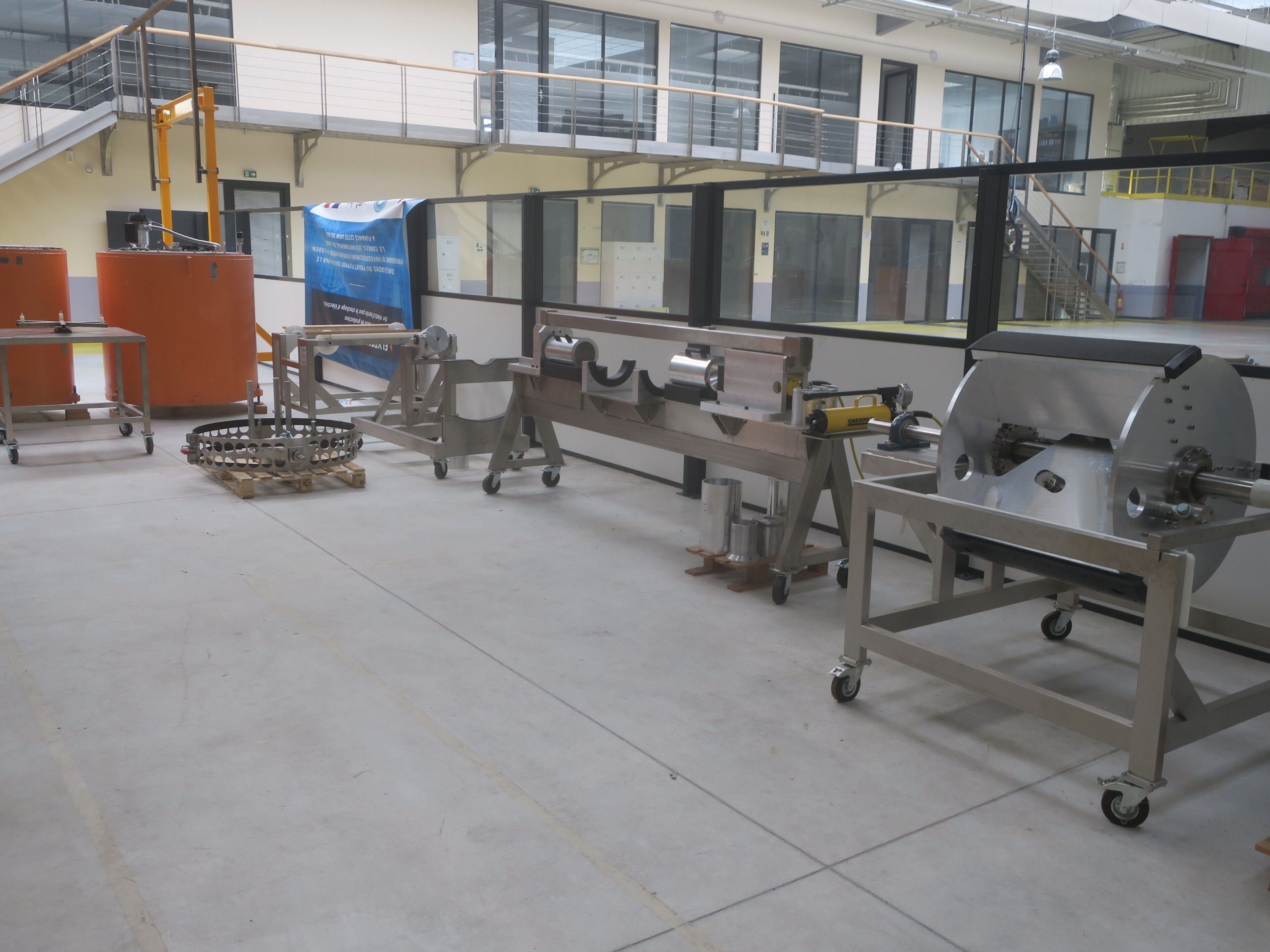 Horizontal mobile hydraulic press ENERPAC Ultima P80 manual with accessories, passage 161cm; mobile stainless steel winder on stainless steel base 178x130xh134, diameter 90, axle 178; mobile stainless steel trolley with reel holder 145x74xh82; trolley with feed table with 4 bearings for stainless steel reels 13x87xh83, mobile stainless steel feed table for winder; accessories, legal lot, Price 300