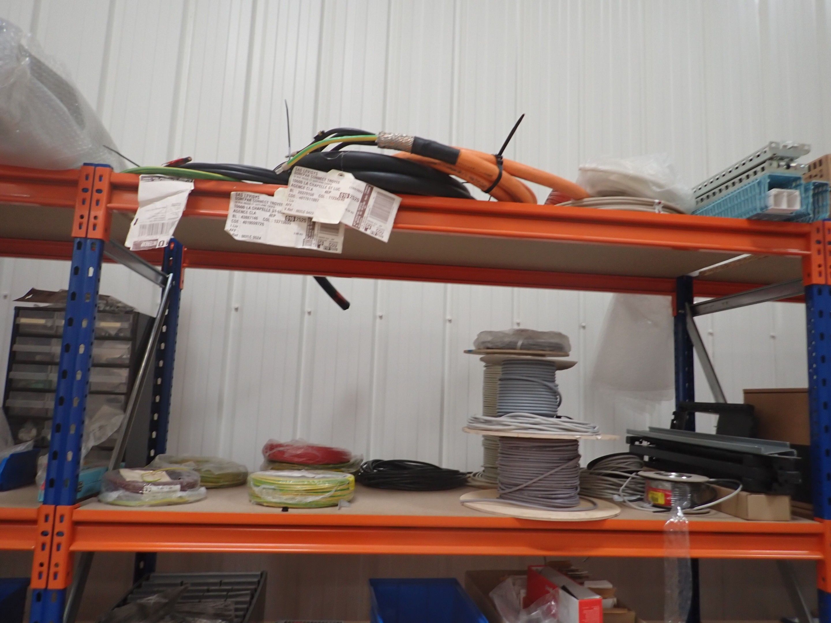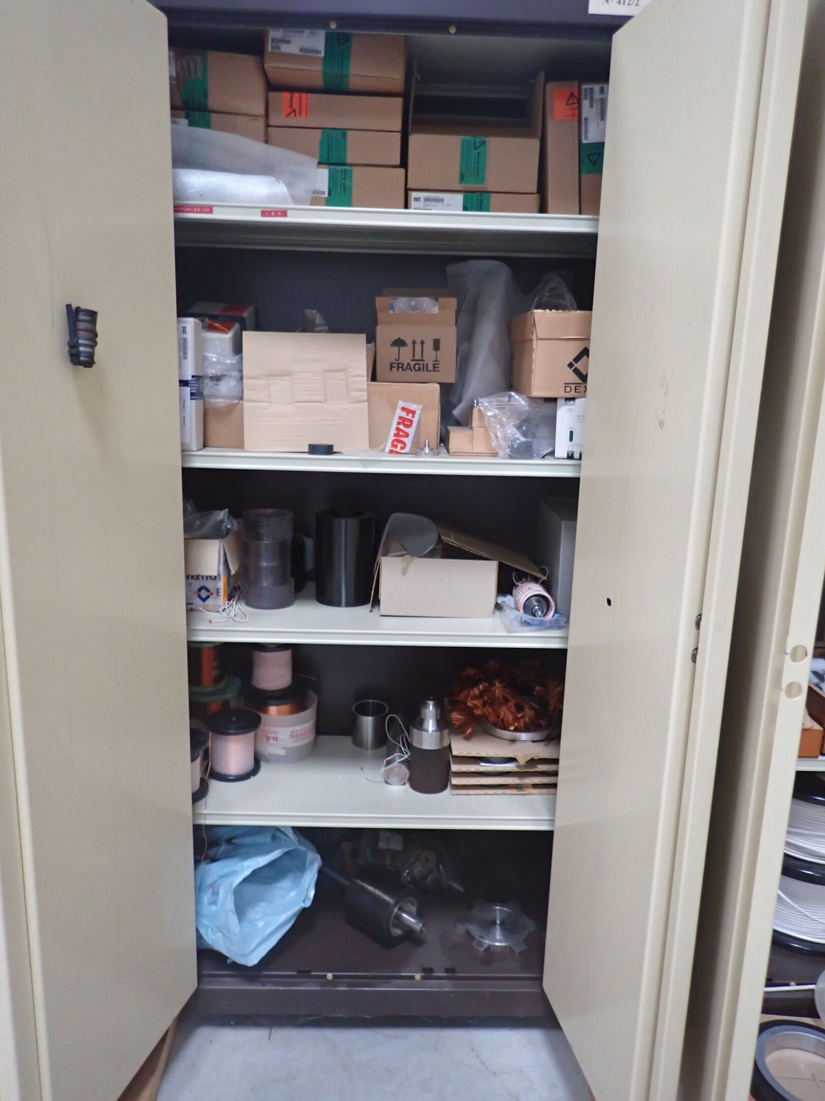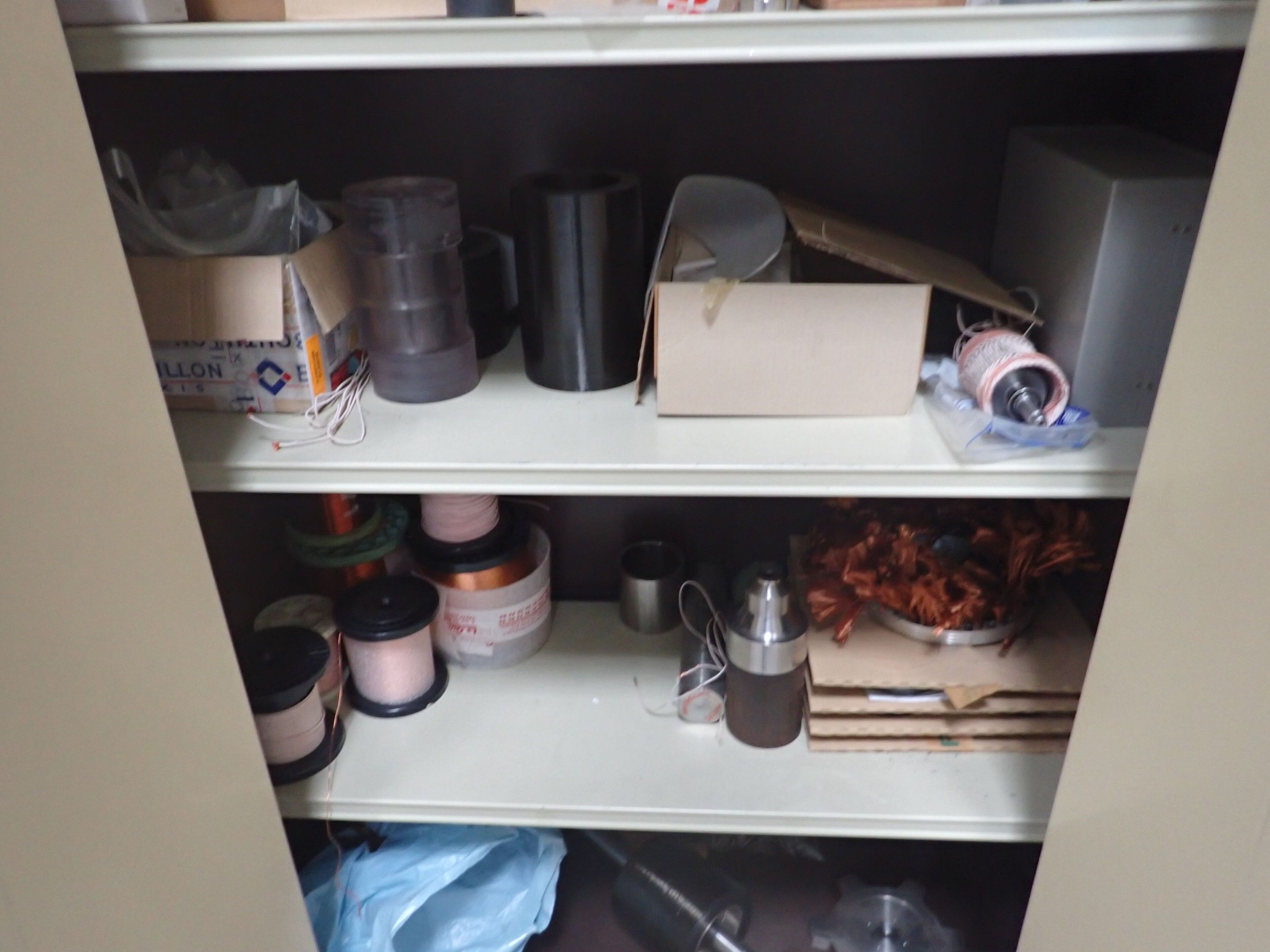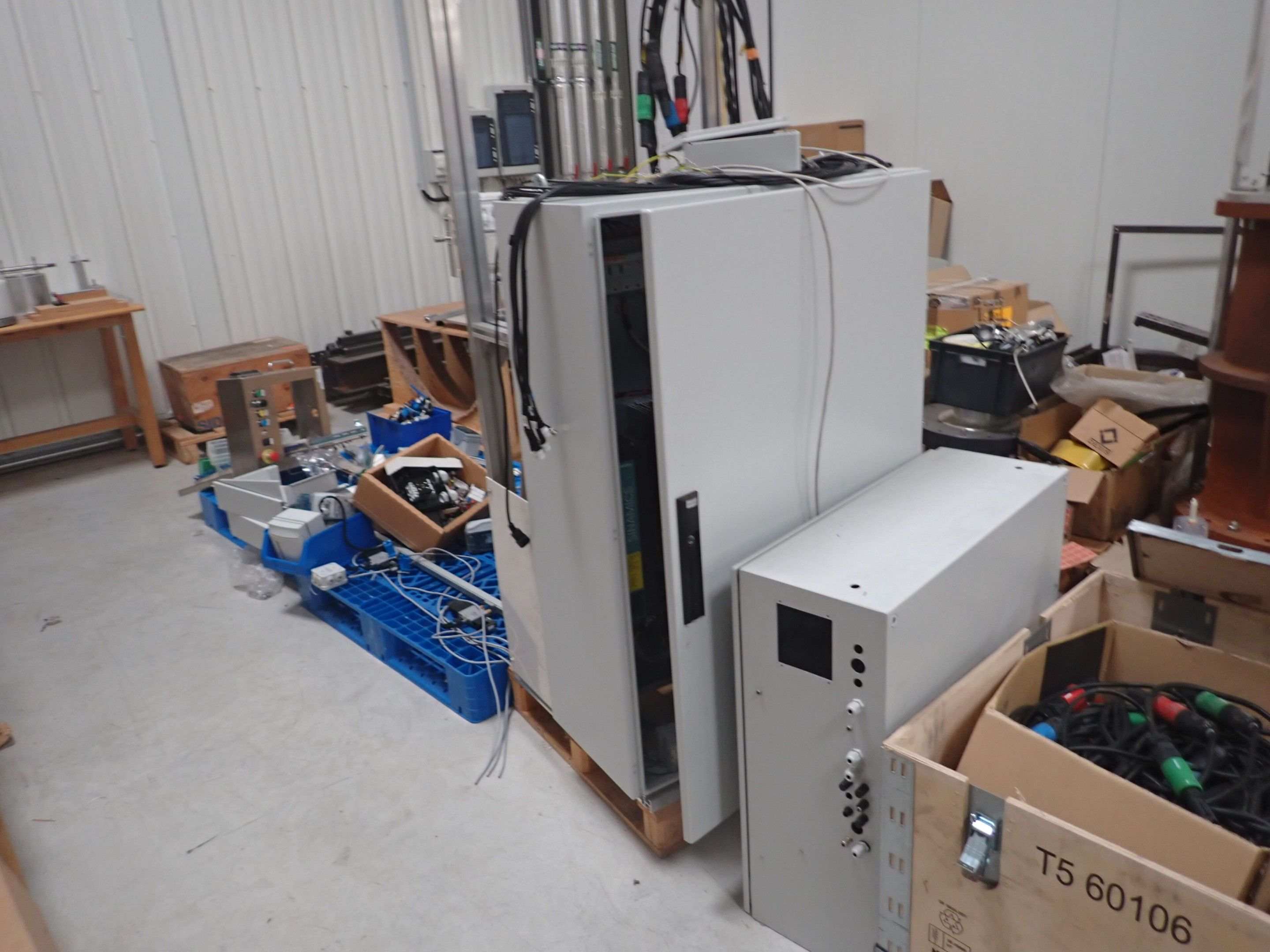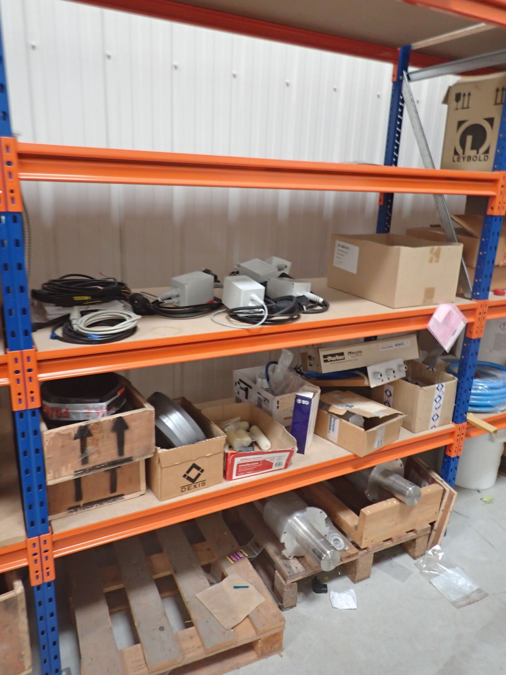 Stock of hardware spare parts in enclosure: Mitutoyo reaming tools 175-200mm, 100 to 125mm, 125 to 150, 150 to 175, electronic scales, inspection templates (125.002, 174, 87-100mm, 87.001), magnets, various coils, wires, washers, various screws, nuts, clamps, wires, cables, switch disconnector, electrical sockets, casings, bearings, articulated pads, electronic and electromechanical components, Erme M10-TP-3010E oscilloscope, air fittings, castors, 11 SIEMENS and Pfeiffer pumps including 2 new Pfeiffer pumps with hoses, electrical cabinet, 2 wooden boxes, 2 IPNs, 8 small props, 1 shelf and cupboard with fittings, miscellaneous, sold without the 3 strongboxes, Judicial lot, Starting price