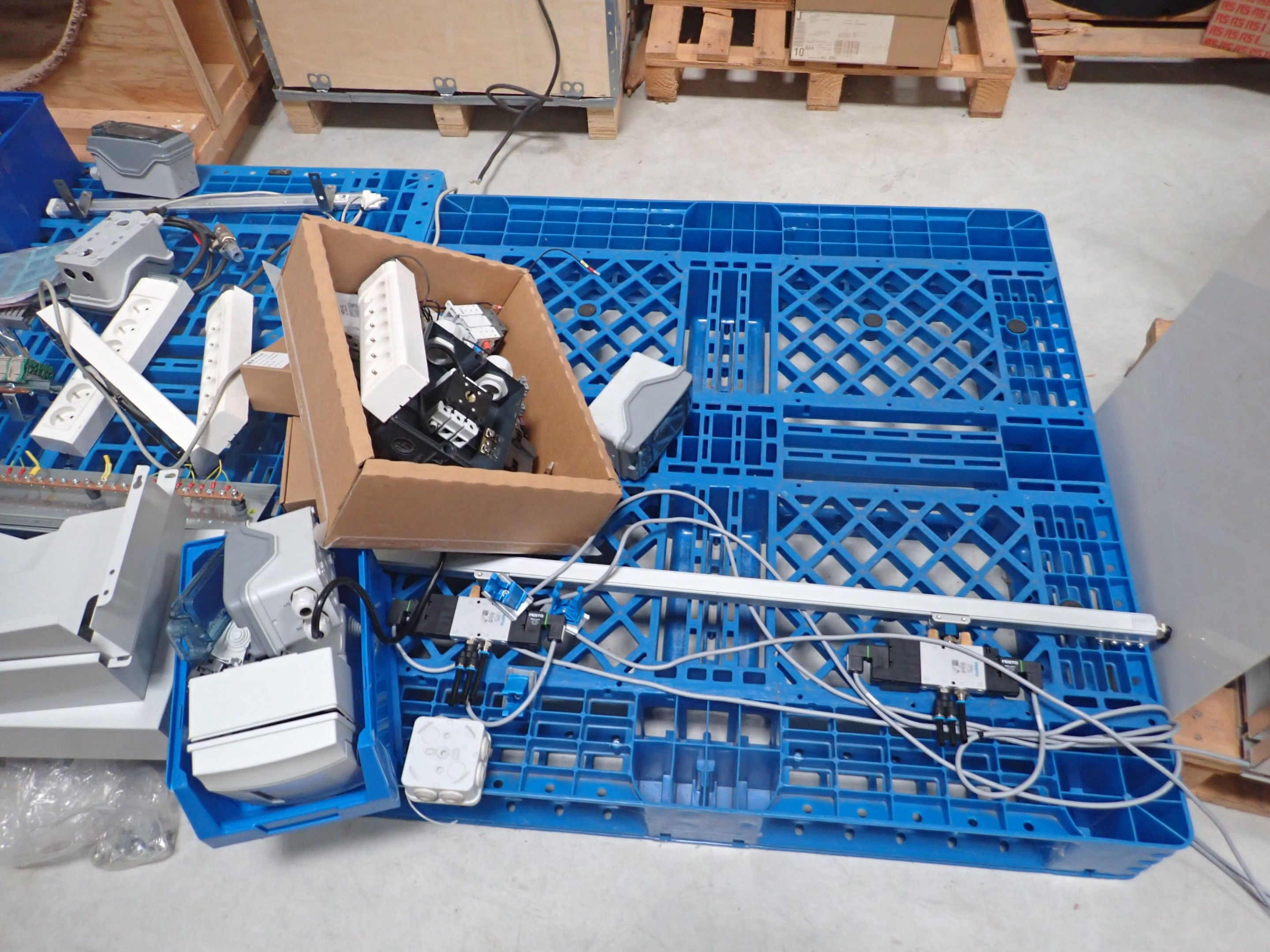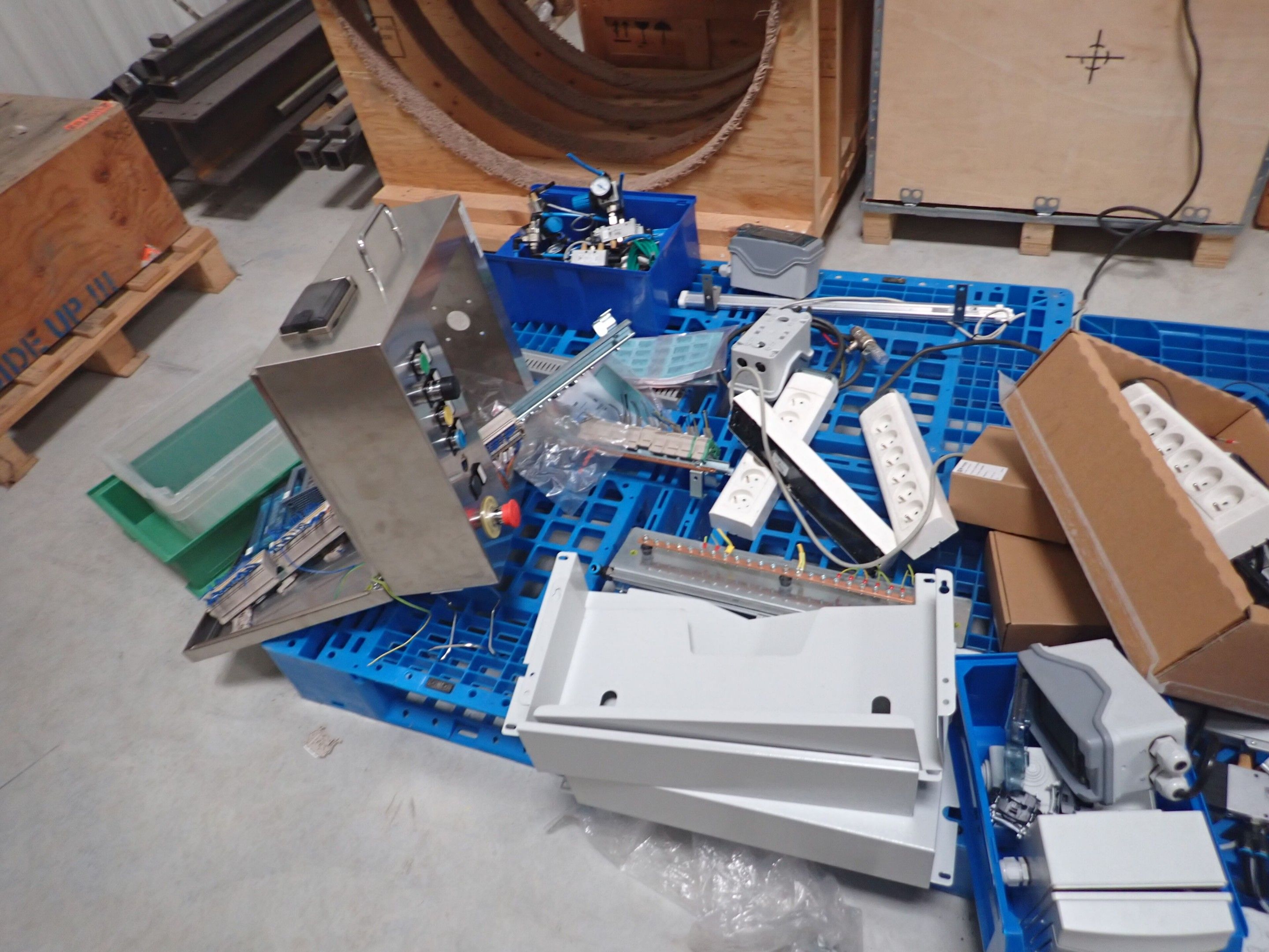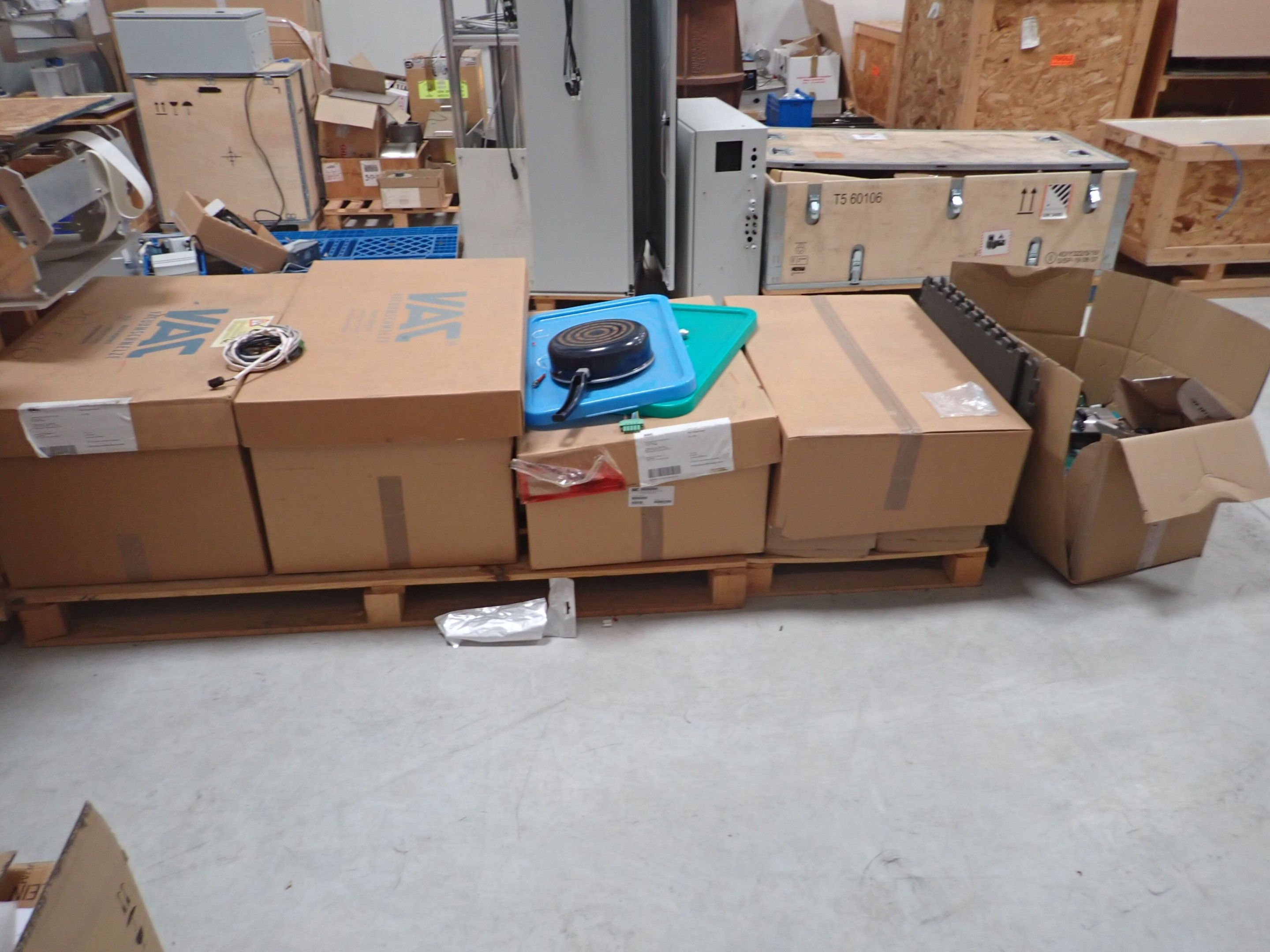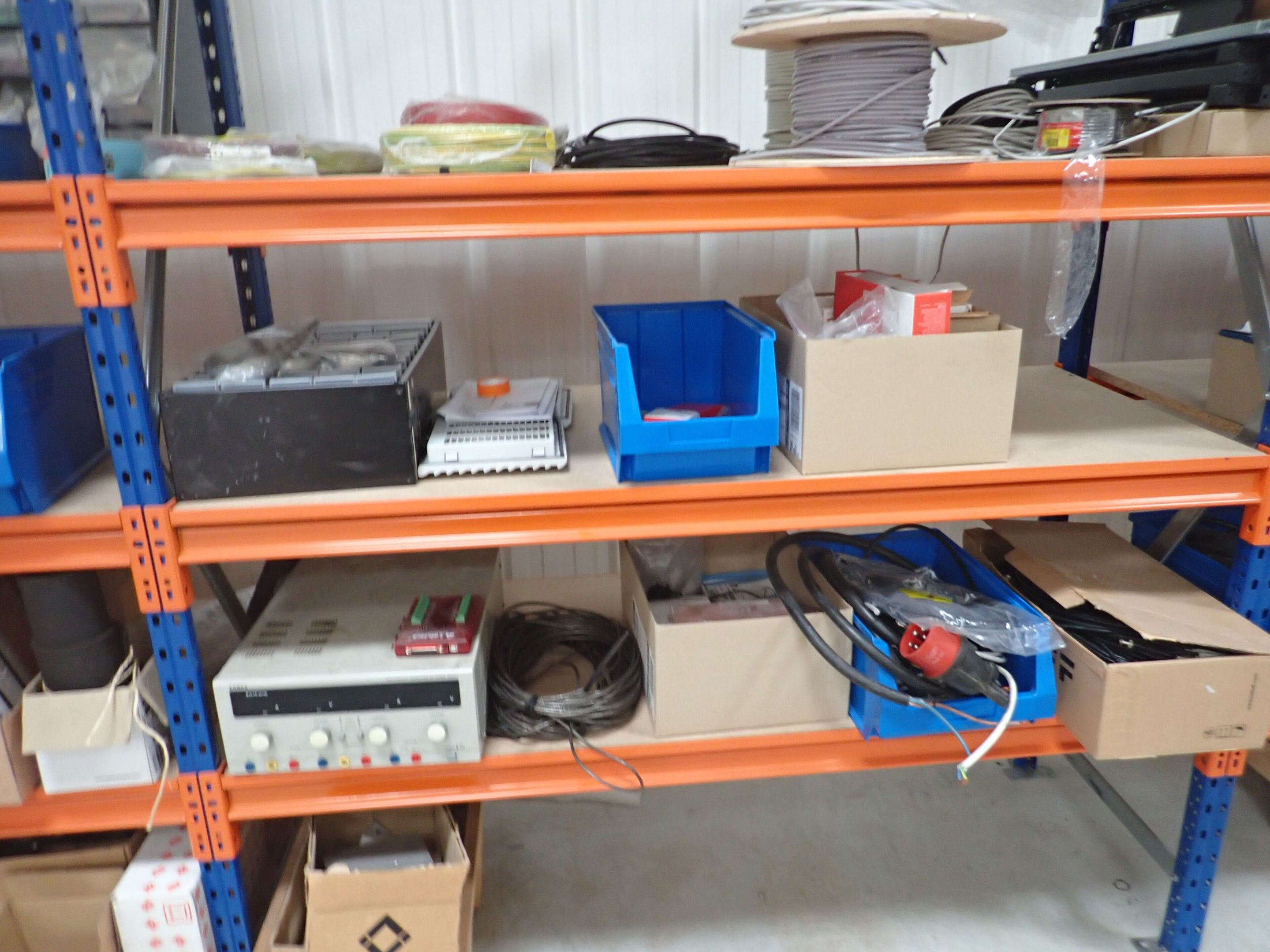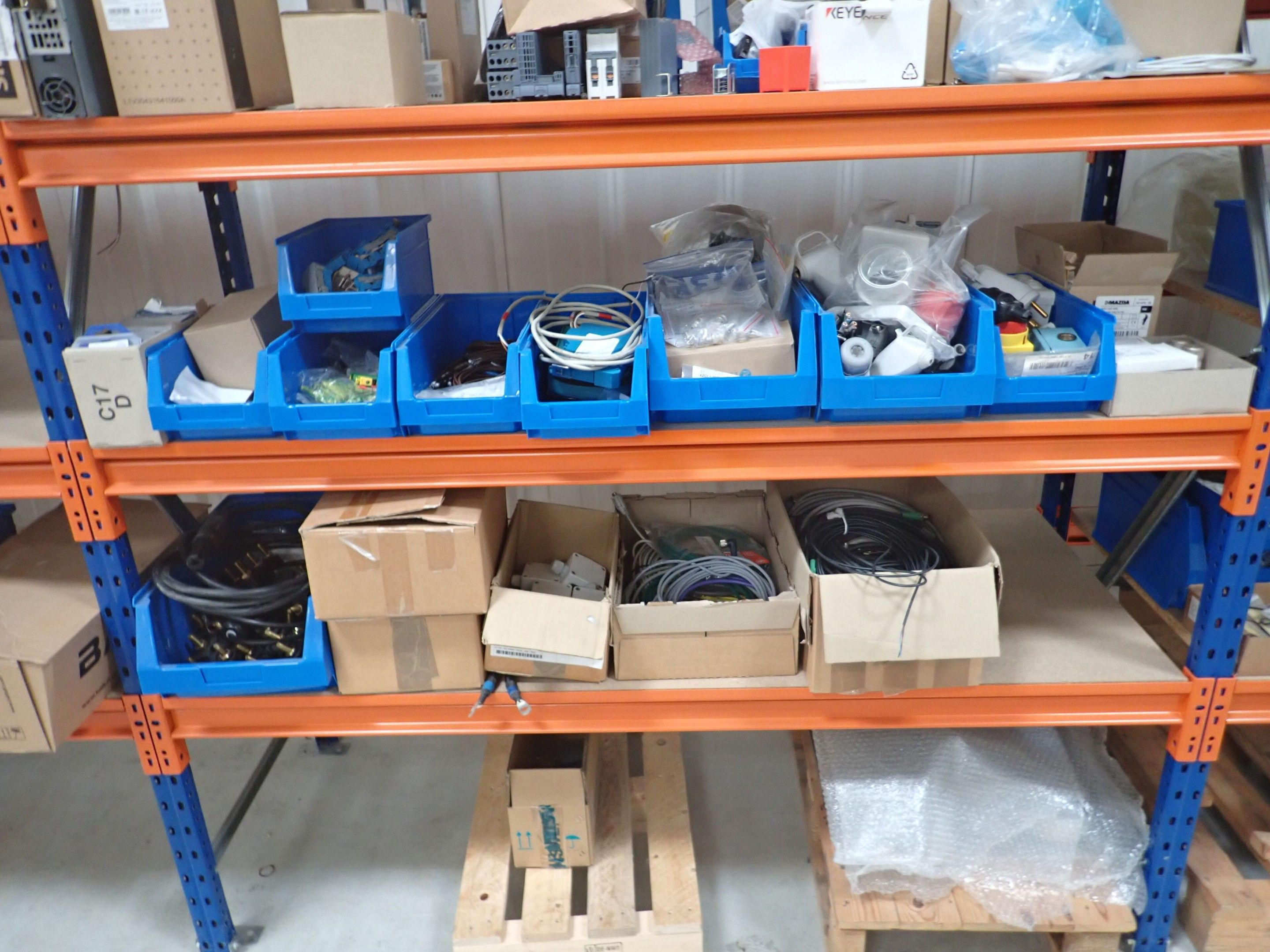 Stock of hardware spare parts in enclosure: Mitutoyo reaming tools 175-200mm, 100 to 125mm, 125 to 150, 150 to 175, electronic scales, inspection templates (125.002, 174, 87-100mm, 87.001), magnets, various coils, wires, washers, various screws, nuts, clamps, wires, cables, switch disconnector, electrical sockets, casings, bearings, articulated pads, electronic and electromechanical components, Erme M10-TP-3010E oscilloscope, air fittings, castors, 11 SIEMENS and Pfeiffer pumps including 2 new Pfeiffer pumps with hoses, electrical cabinet, 2 wooden boxes, 2 IPNs, 8 small props, 1 shelf and cupboard with fittings, miscellaneous, sold without the 3 strongboxes, Judicial lot, Starting price