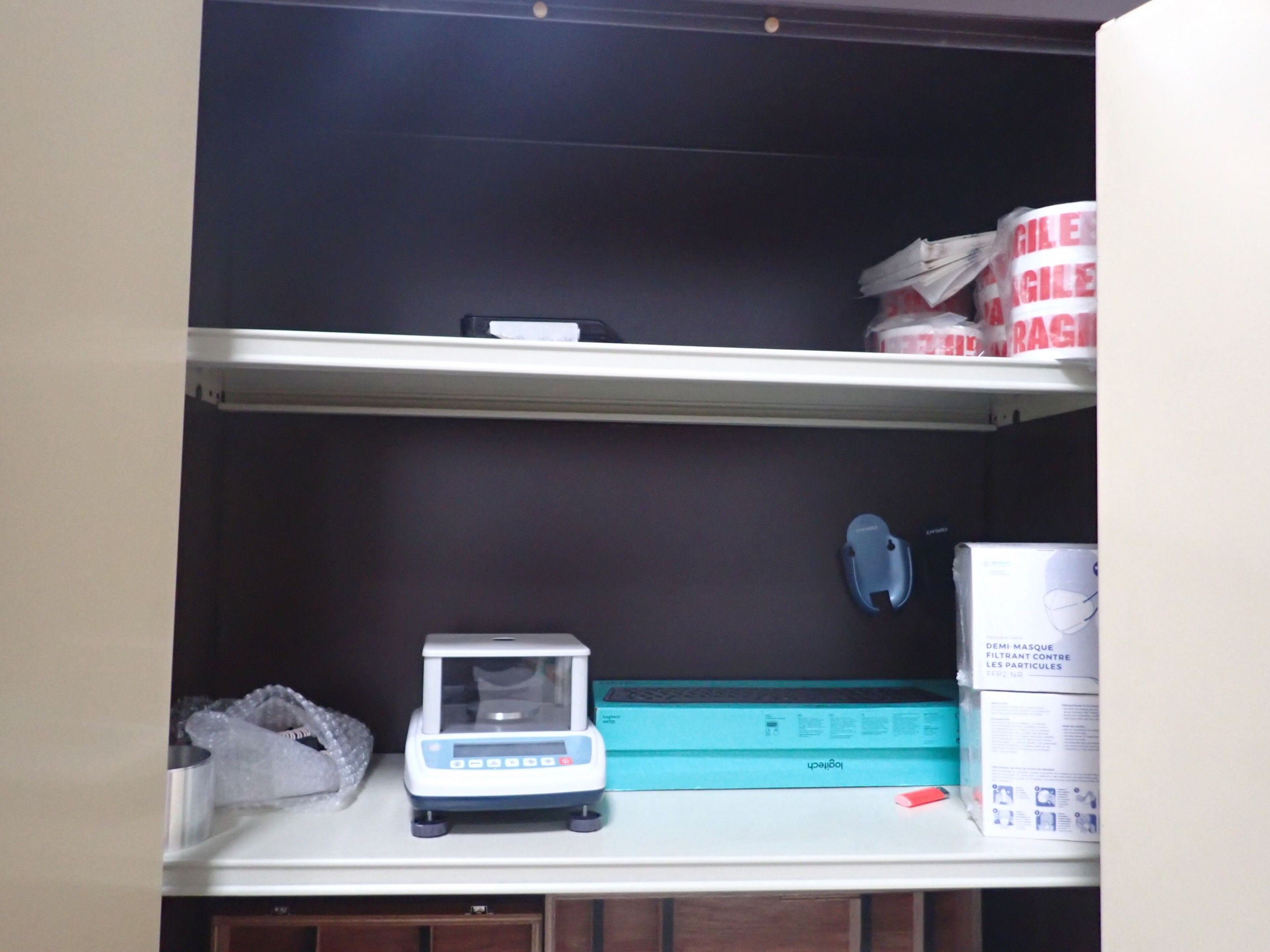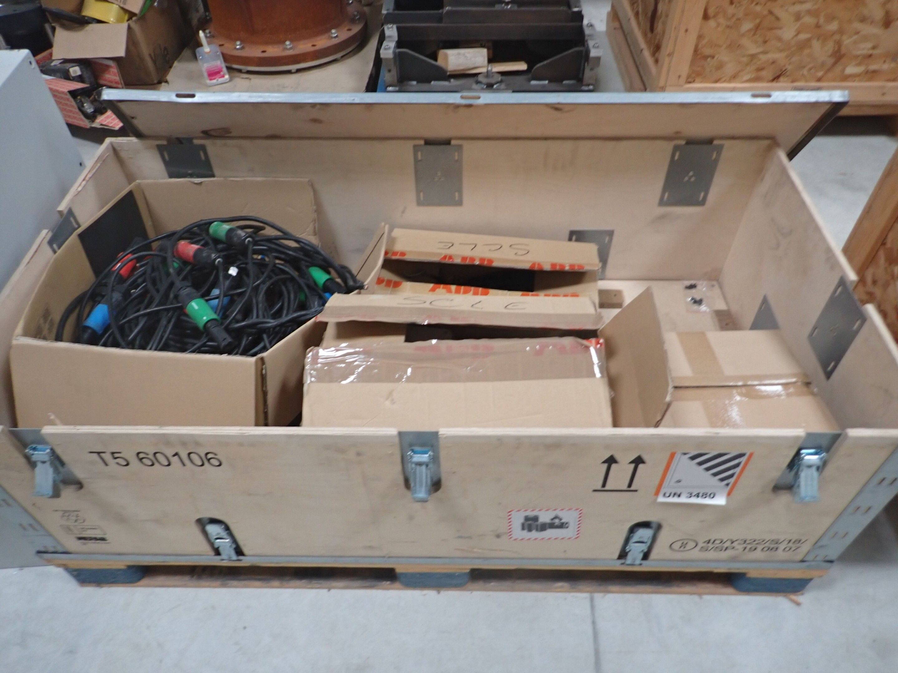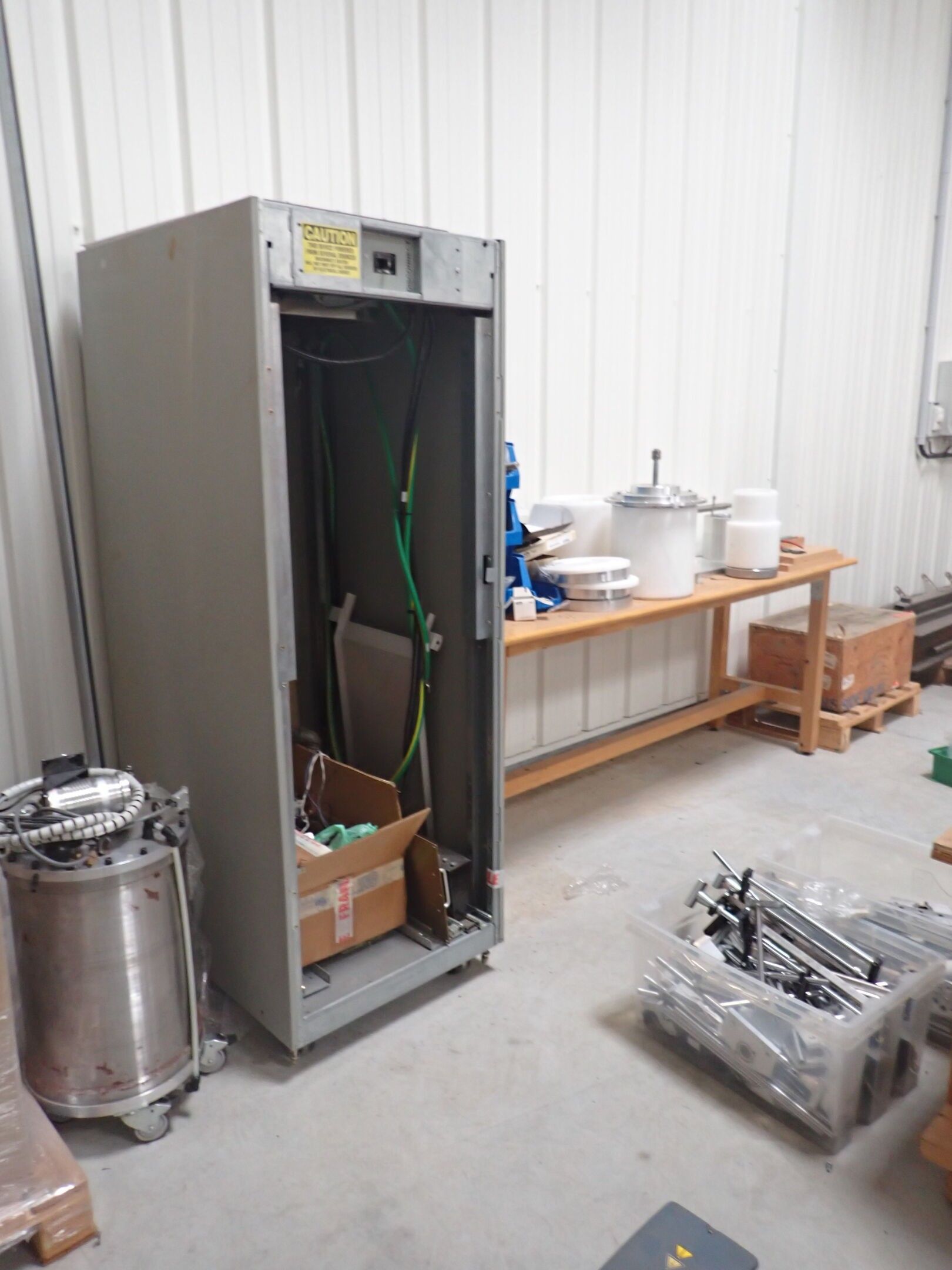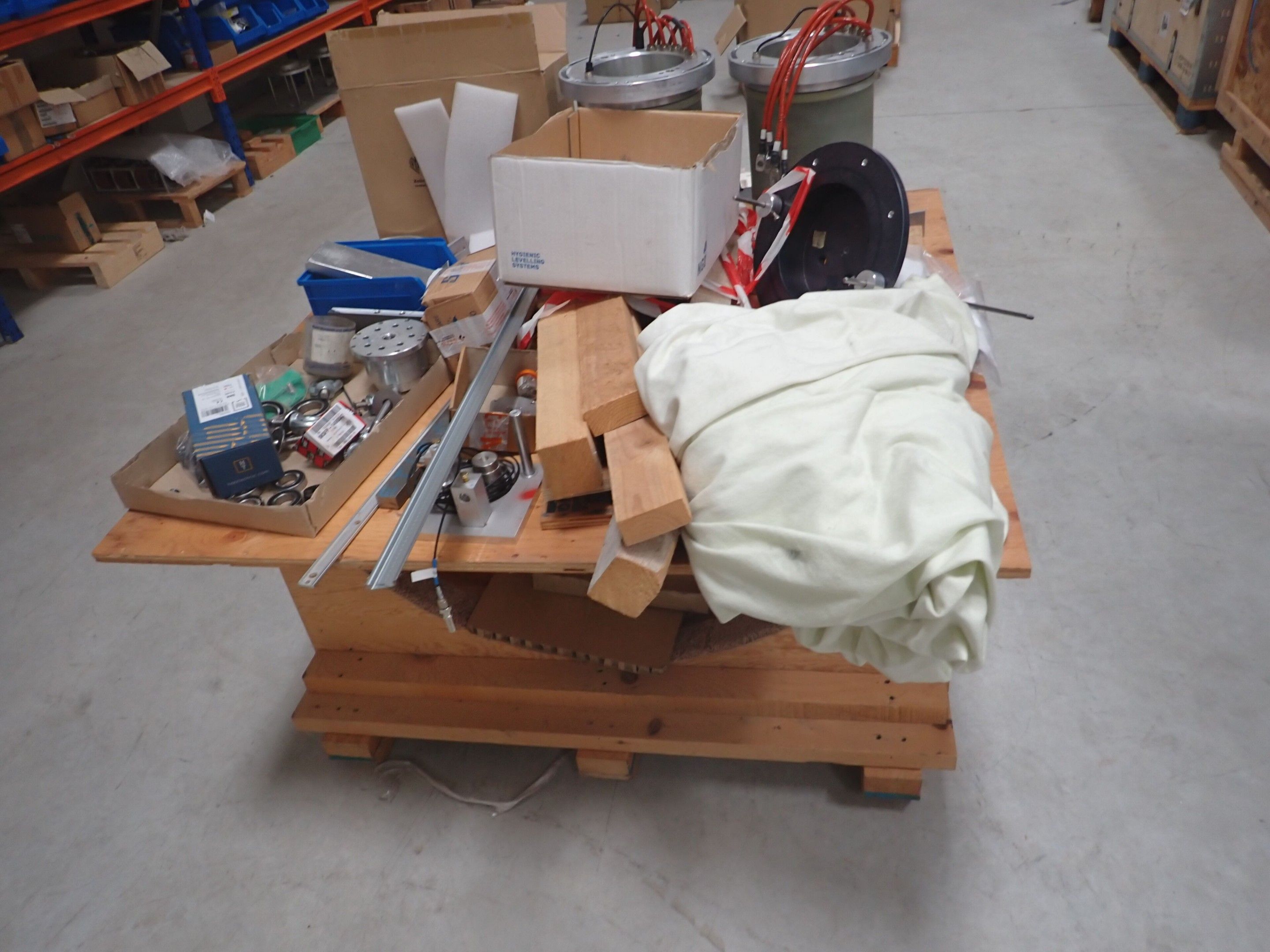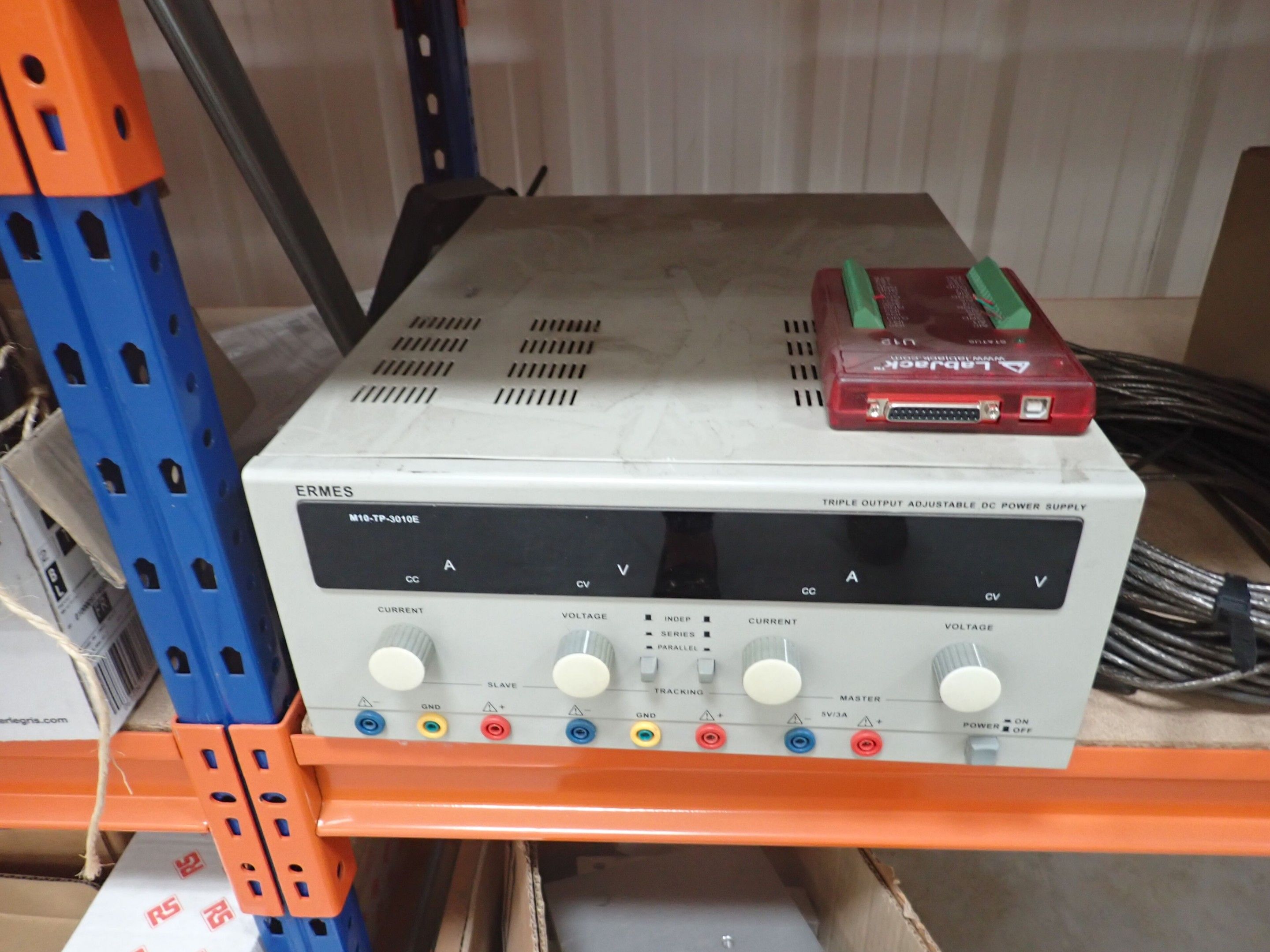 Stock of hardware spare parts in enclosure: Mitutoyo reaming tools 175-200mm, 100 to 125mm, 125 to 150, 150 to 175, electronic scales, inspection templates (125.002, 174, 87-100mm, 87.001), magnets, various coils, wires, washers, various screws, nuts, clamps, wires, cables, switch disconnector, electrical sockets, casings, bearings, articulated pads, electronic and electromechanical components, Erme M10-TP-3010E oscilloscope, air fittings, castors, 11 SIEMENS and Pfeiffer pumps including 2 new Pfeiffer pumps with hoses, electrical cabinet, 2 wooden boxes, 2 IPNs, 8 small props, 1 shelf and cupboard with fittings, miscellaneous, sold without the 3 strongboxes, Judicial lot, Starting price