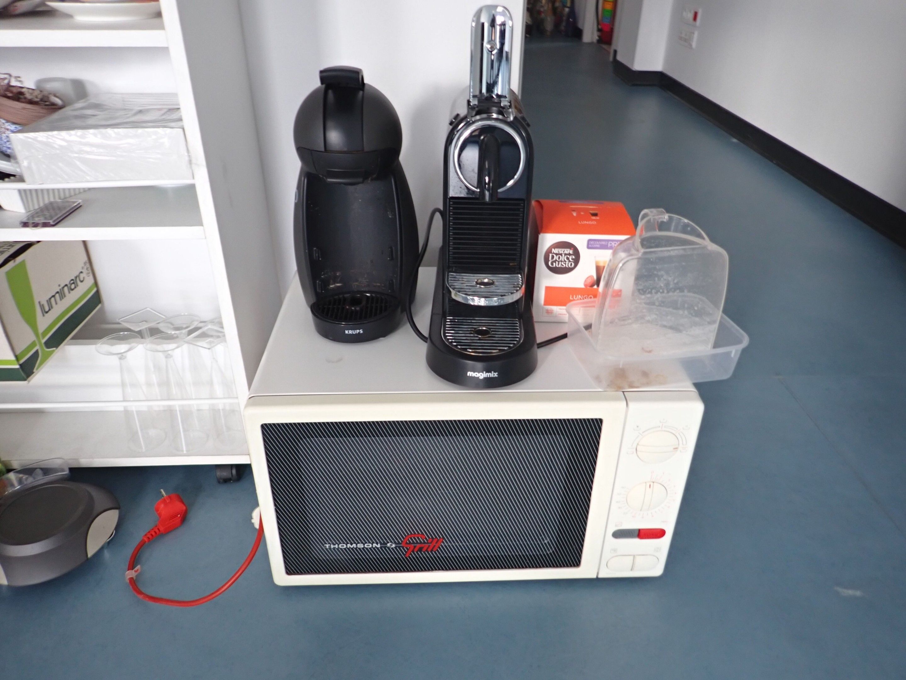 Small white 3-level cabinet, Thomson grill microwave, 2 coff…