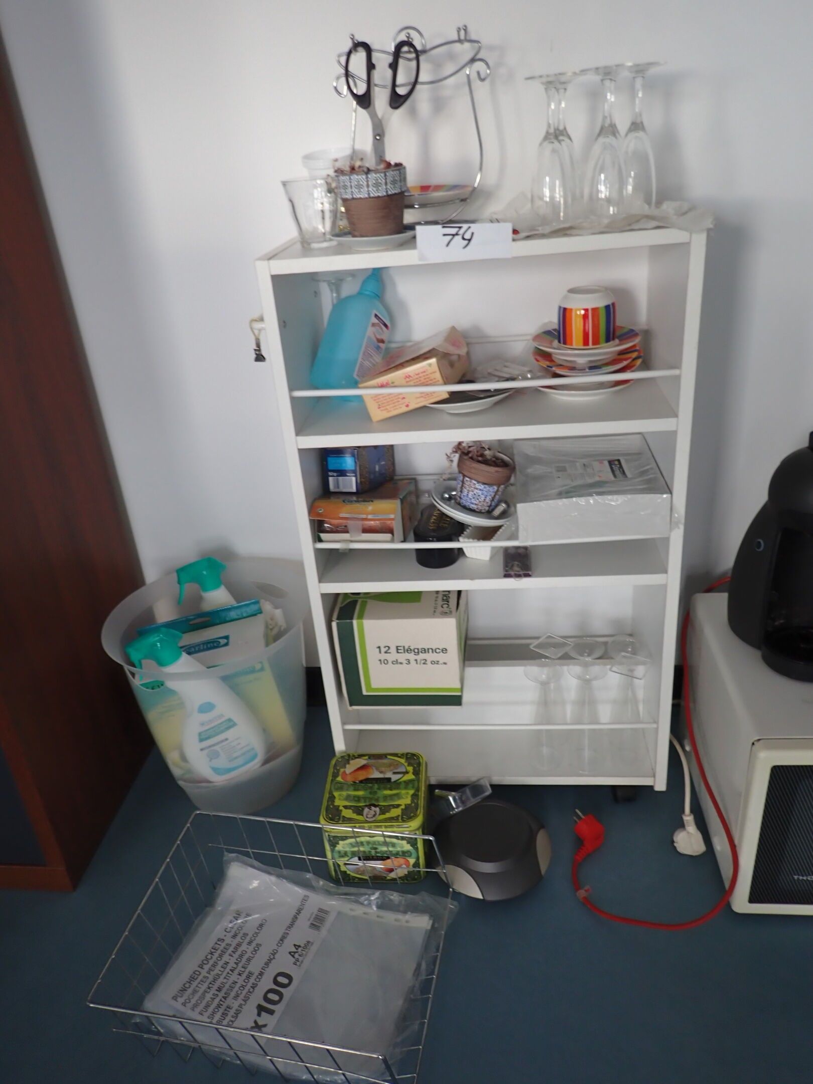 Small white 3-level cabinet, Thomson grill microwave, 2 coffee makers, small crockery, judicial lot, Price at 30