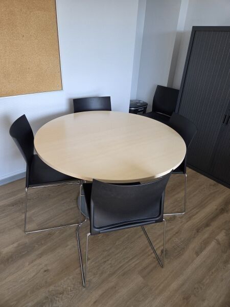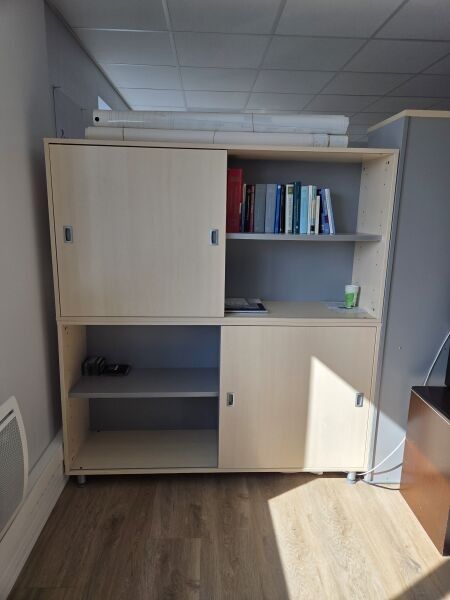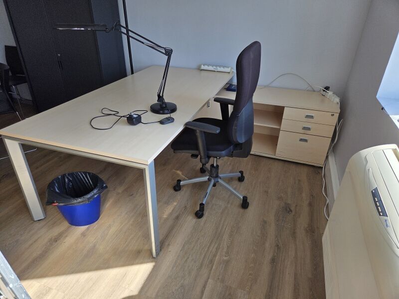 Office furniture set comprising 1 desk D: 200 x 100 cm, 1 low cupboard D: 140 x 50 cm, 1 high cupboard D: 170 x 155 x 40 cm, 1 armchair, 1 round table D: 120 cm, 4 chairs. ( OFFICE 38 2nd FLOOR)