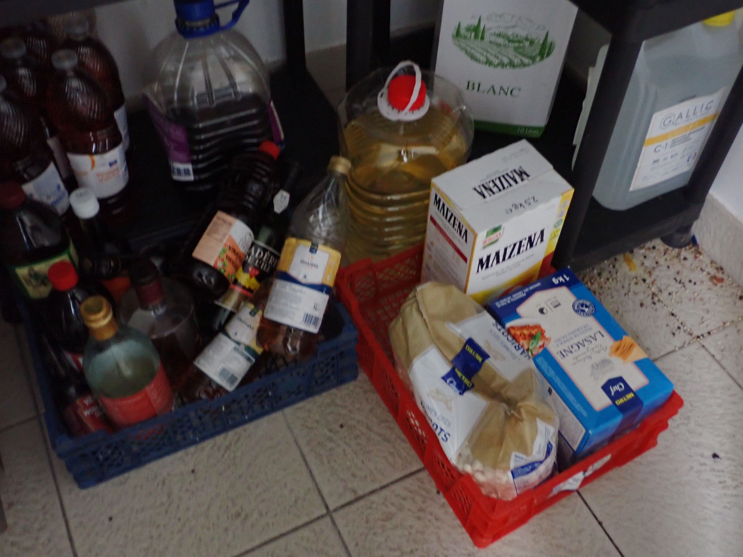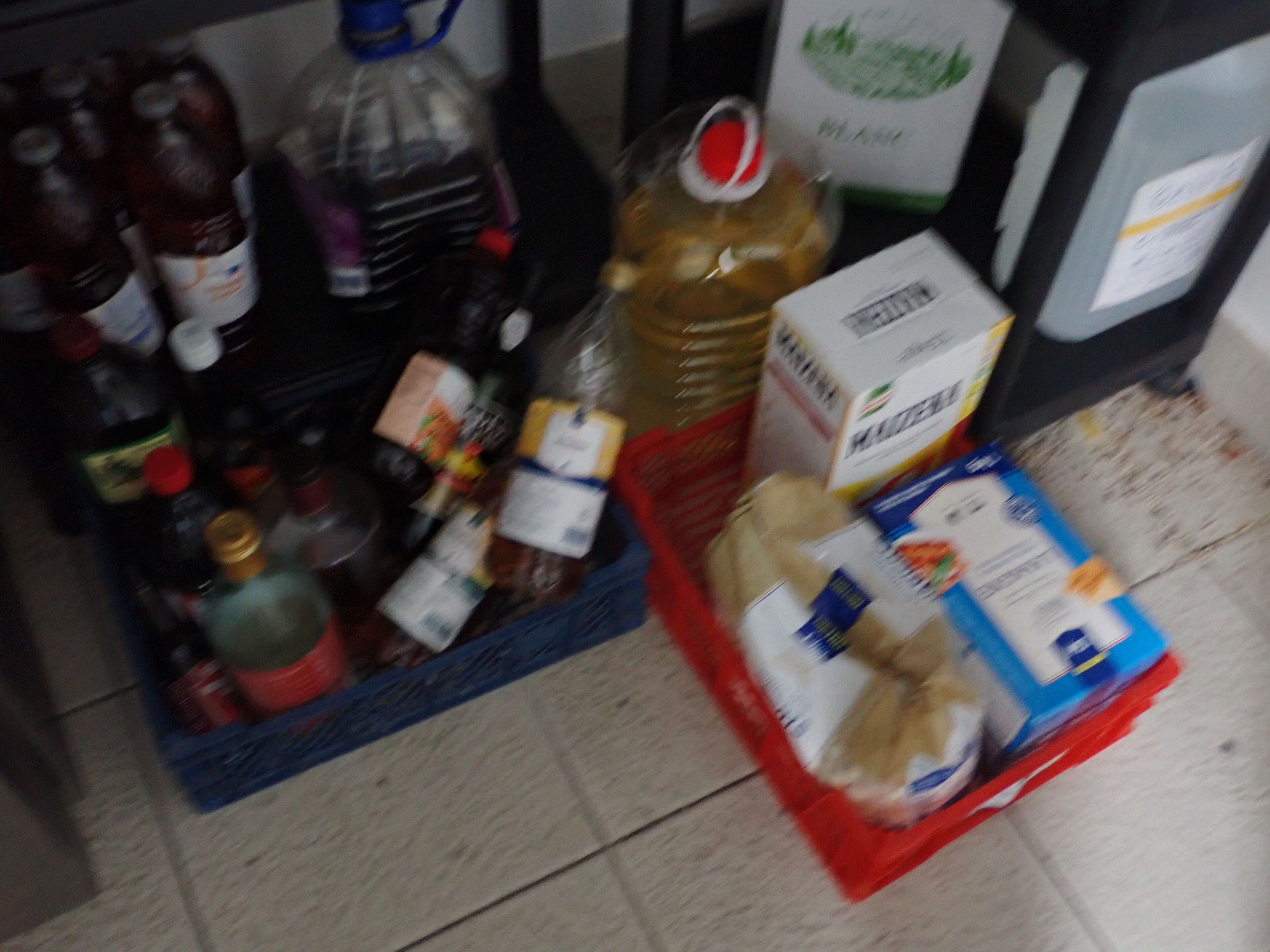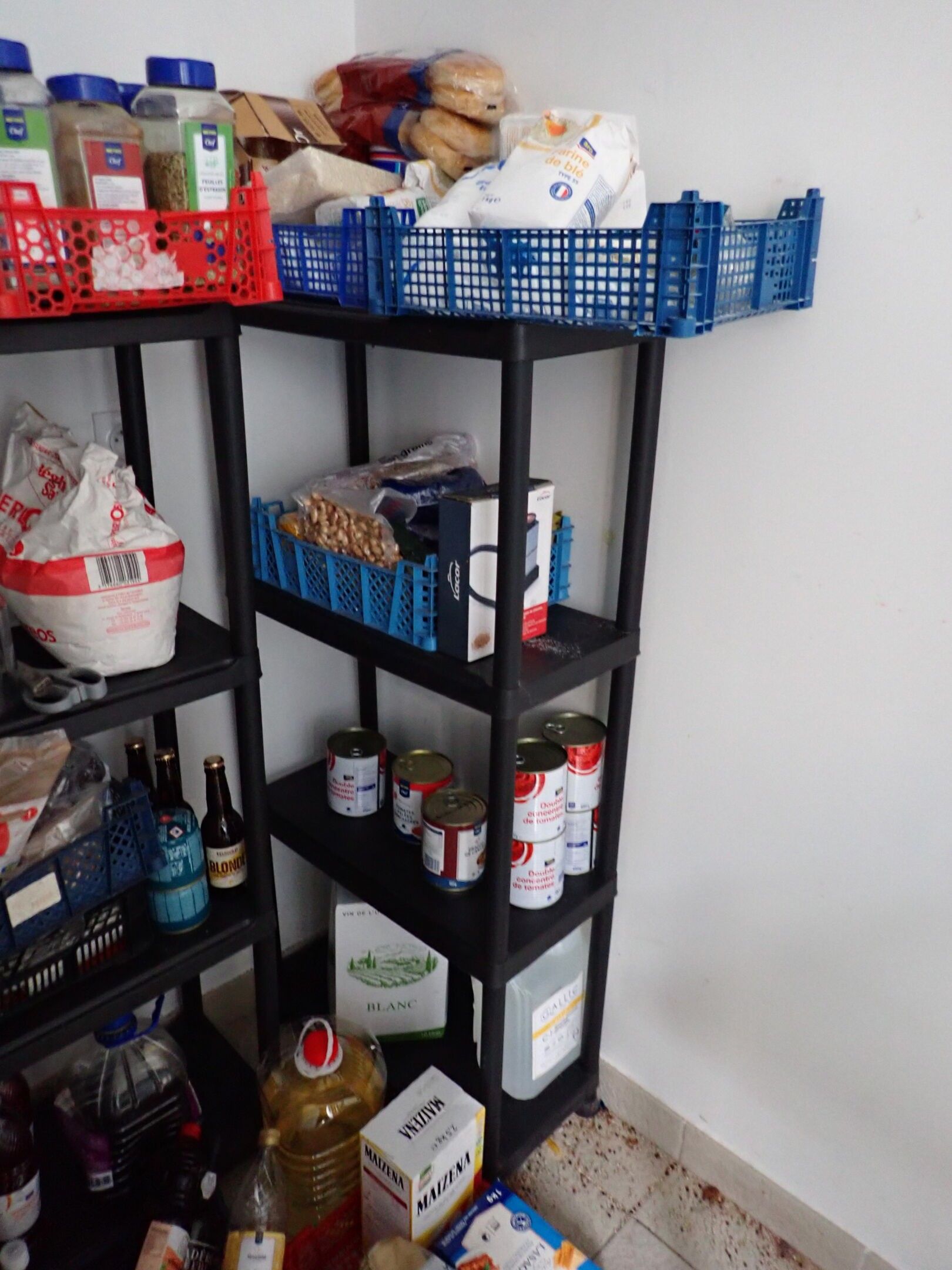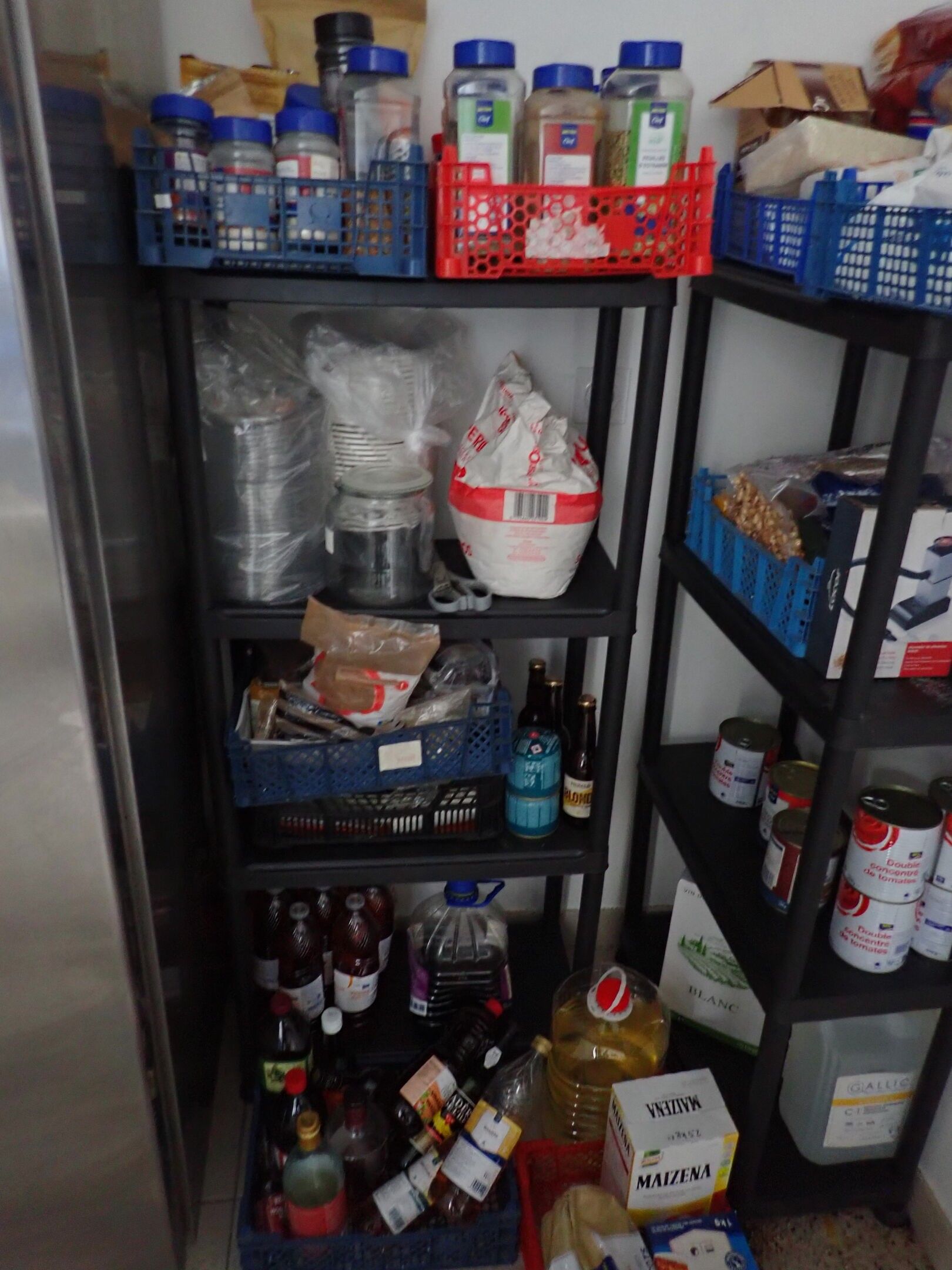 2 black modular pvc shelves 4 levels lined with emboitages and various condiments including opened and expired, 1st floor, stairs, Judicial lot, Price 30